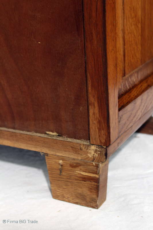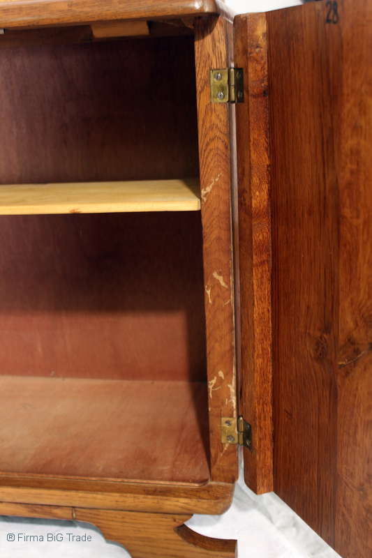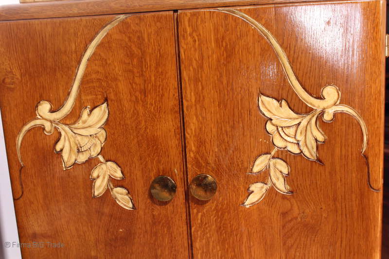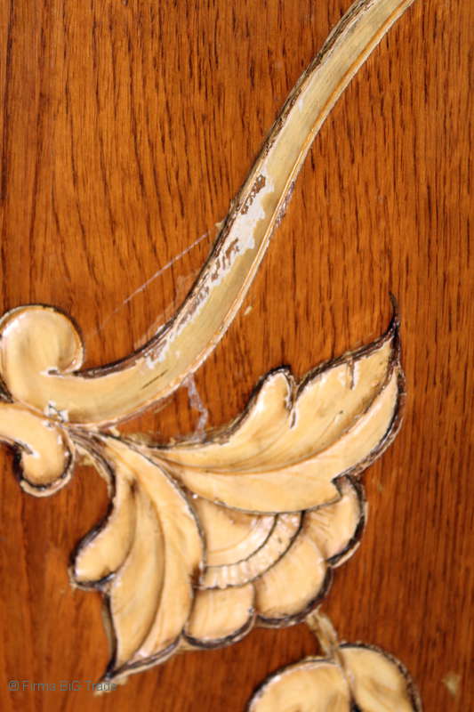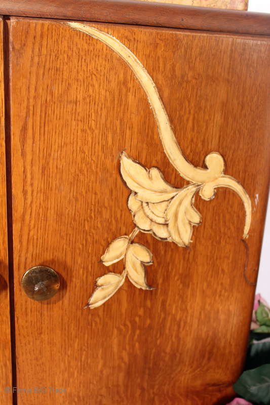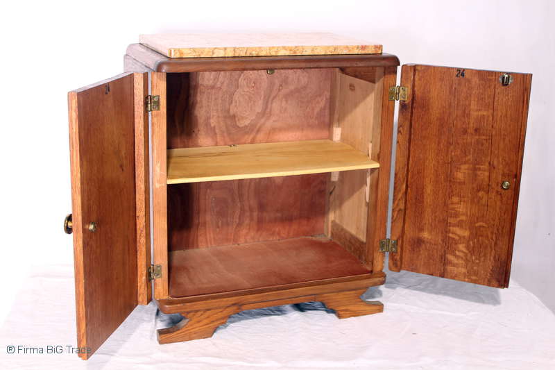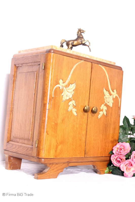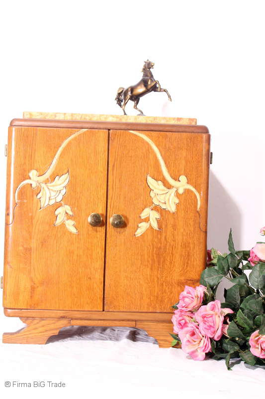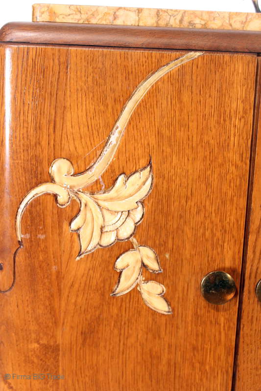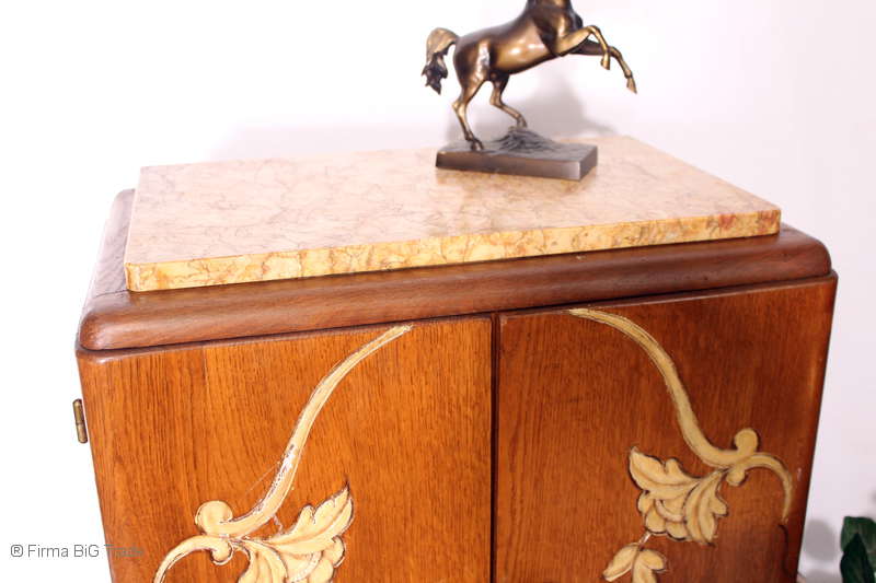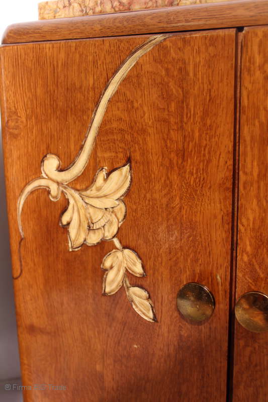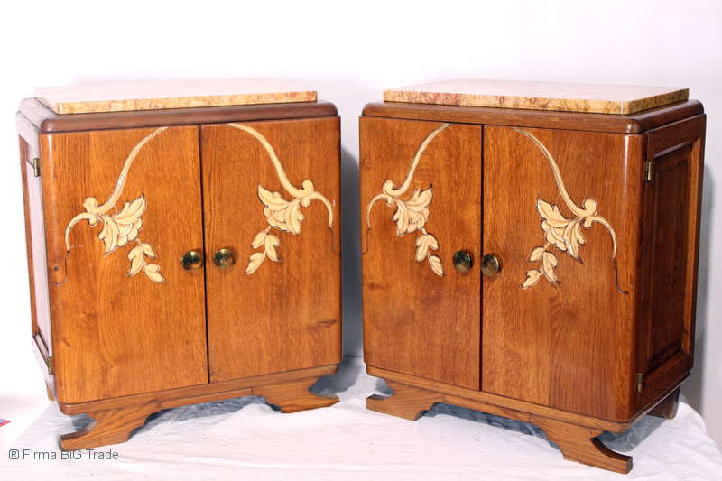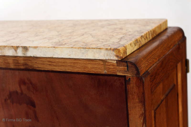 Angeboten wird ein seltener zauberhafter antiker Art Déco Nachttisch / Nachtschrank / Beistellschrank / Flurschrank aus massivem Holz. Das schöne Schränkchen besitzt 2 Flügeltüren mit wunderschönen floralen Schnitzerein die farblich abgesetzt sind. Dahinter ist ein Einlegebrett. Die runden Türgriffe sind aus Metall. Die Vorderfüße sind sehr schön geschwungen gestaltet. Die Deckplatte besteht aus beigem Marmorstein mit schöner Maserung. Der antike Nachtschrank weist hier und da Gebrauchsspuren auf u.a. Kratzer, Flecken, Stoßstellen (siehe Bilder), ansonsten befindet sich der zauberhafte antike Art Déco Nachtschrank in einem guten gebrauchten Zustand. Von diesem Nachtschrank sind 2 Stück vorhanden