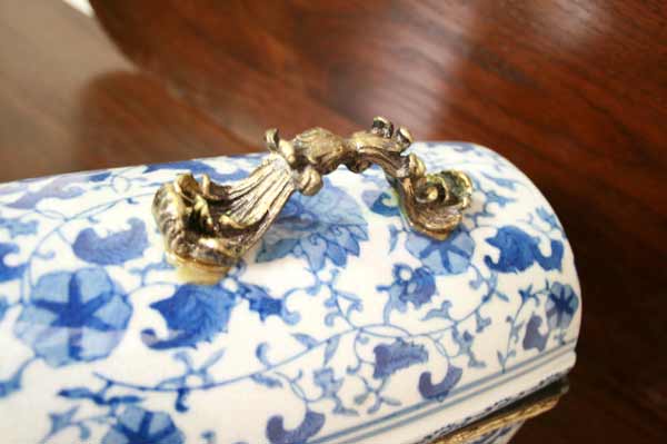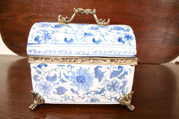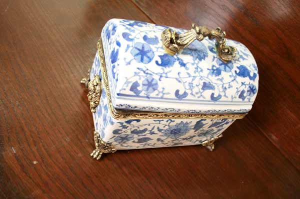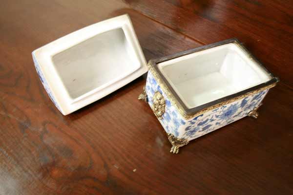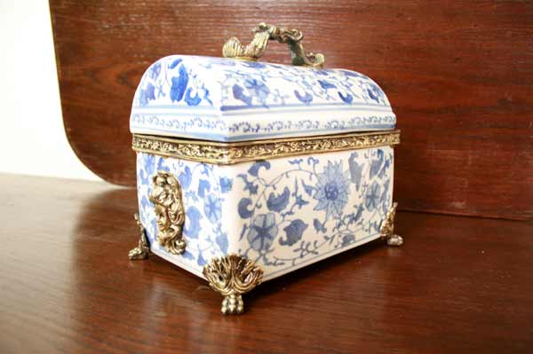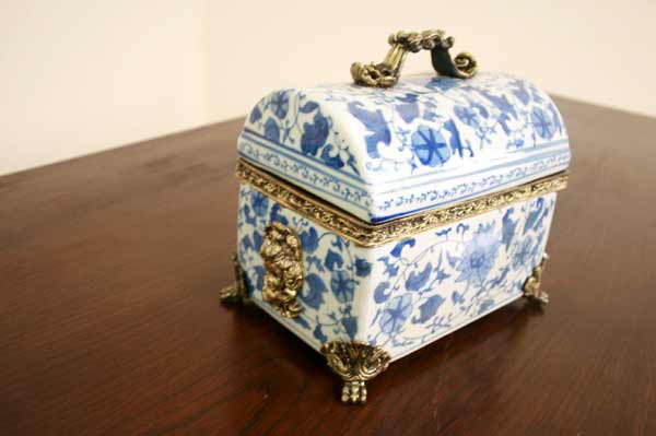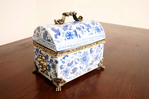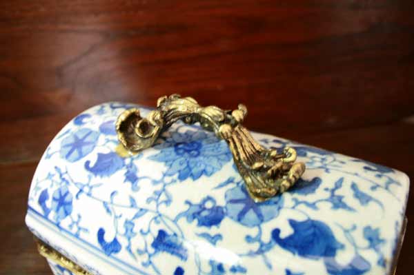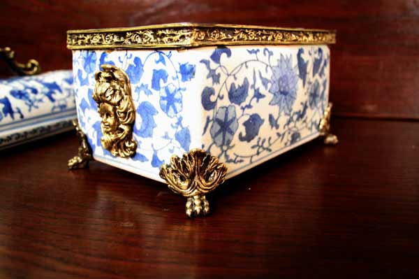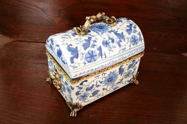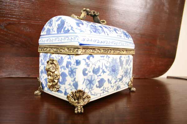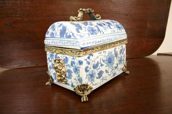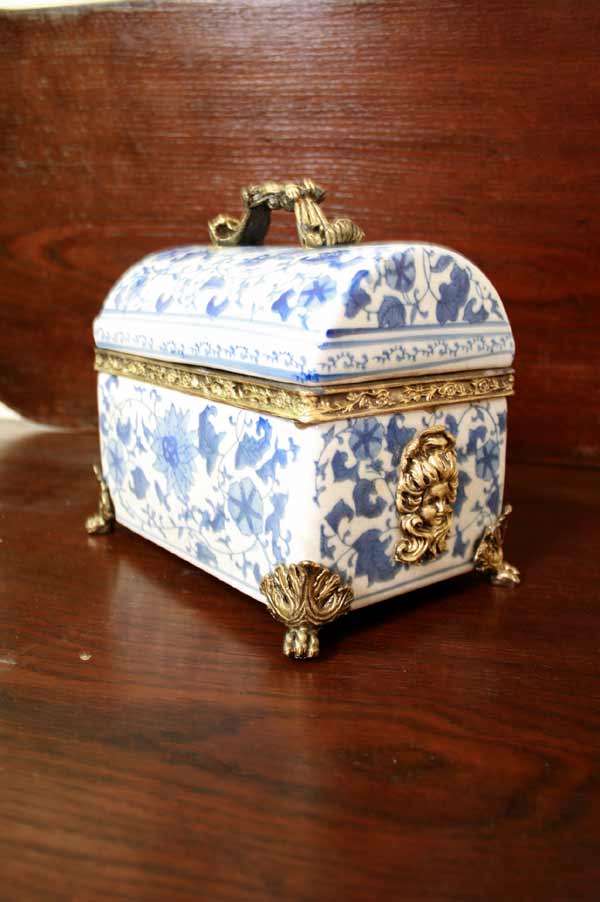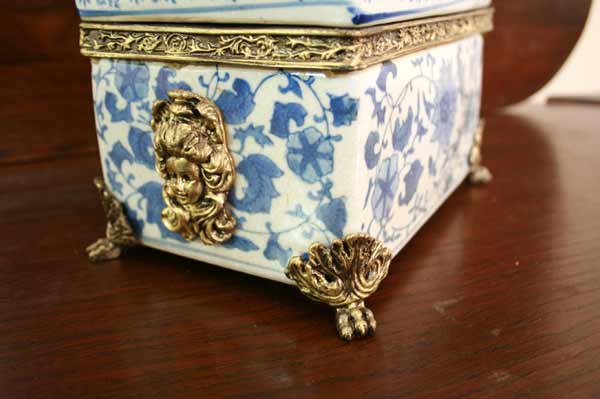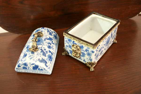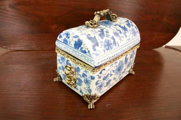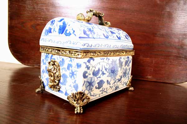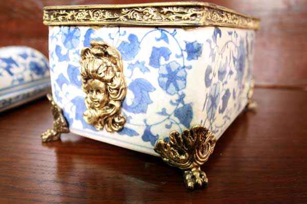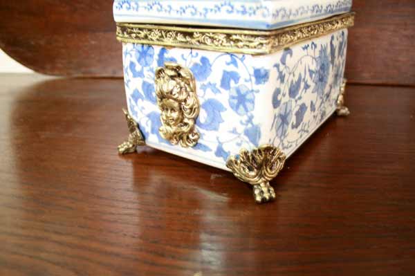 Angeboten wird ein wunderschöne Porzellanschatulle / Zucker- oder Gebäckdose im schönen antiken Stil. Die schöne und große Porzellandose besitzt einen Deckel. Die Schatulle ist mit schönen blauen Motiven versehen. Sie steht auf schönen Löwen Tatzen ähnlichen Füßen, besitzt auf beiden Seiten schöne detailreiche Applikationen. Die Füße, Ränder, Applikationen und der Deckelgriff ist im eleganten kontrastreichen Gold gehalten.