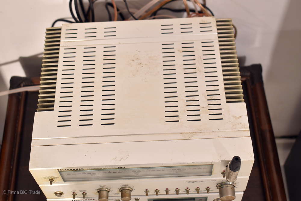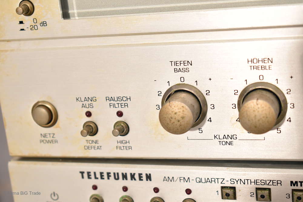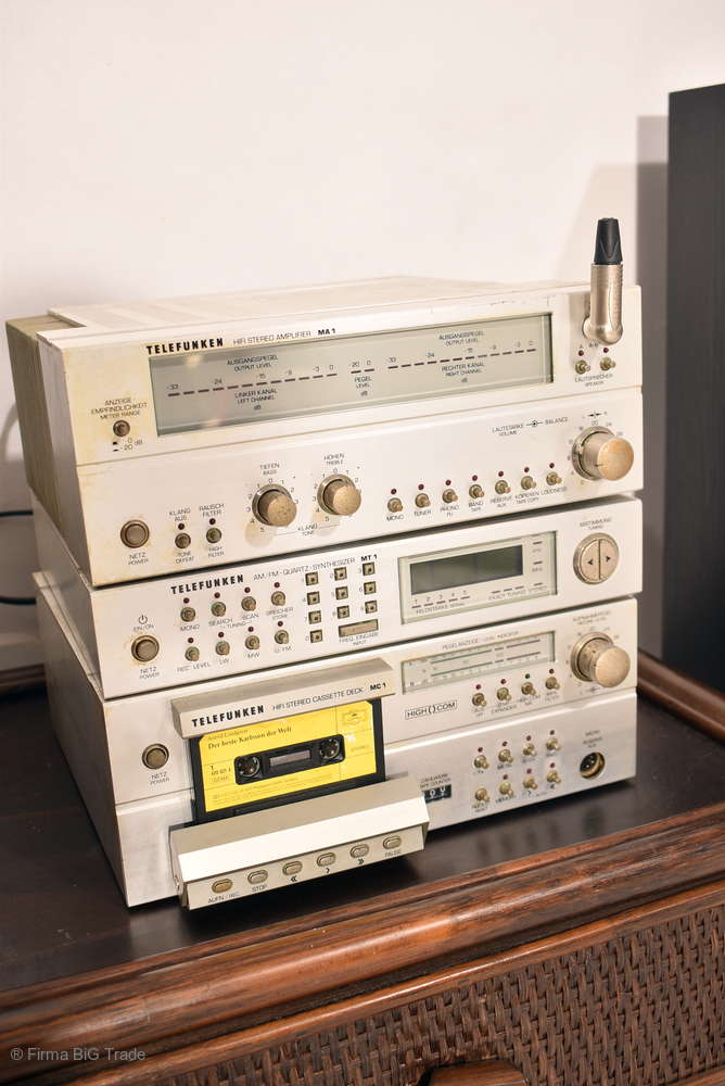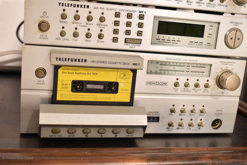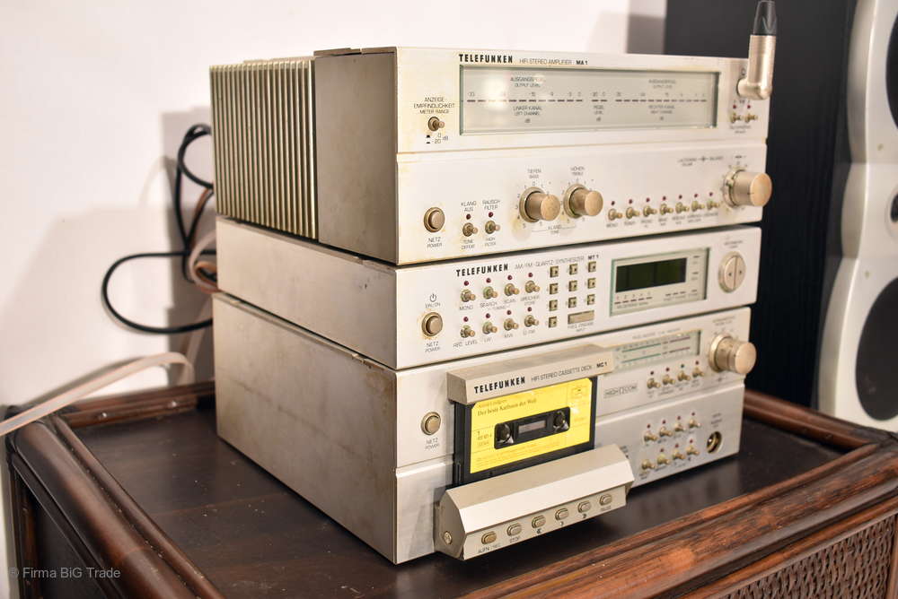 Angeboten wird eine alte TELFUNKEN HiFi-Anlage mit 2 großen Boxen. Die Anlage besteht aus HiFi STEREO CASSETE DESK MC1, AM/FM QUARTZ SYNTHESIZER MT1, STEREO AMPLIFIER MA1 sowie 2 3-Wege Bassreflexbox Modell MBC 300 dazu diverse Kabel und einen Kopfhörer. Die Anlage weist äußerliche Alters- und Gebrauchsspuren u.a. Verfärbungen auf (siehe Bilder). Die Funktion der alten HiFi-Anlage und Boxen wurde nicht überprüft und sie werden als Defekt bzw. Sammlerobjekte angeboten.