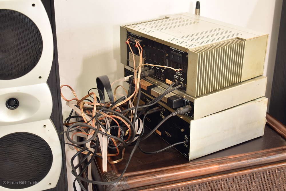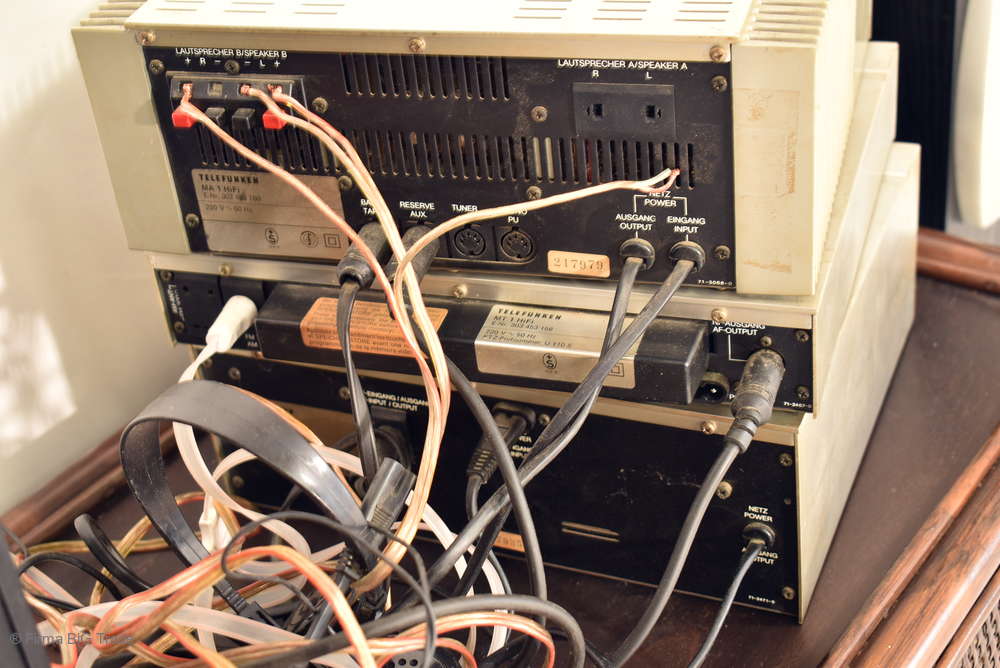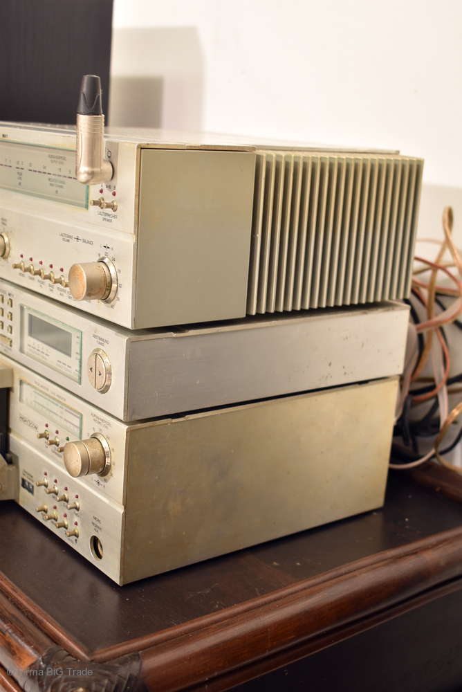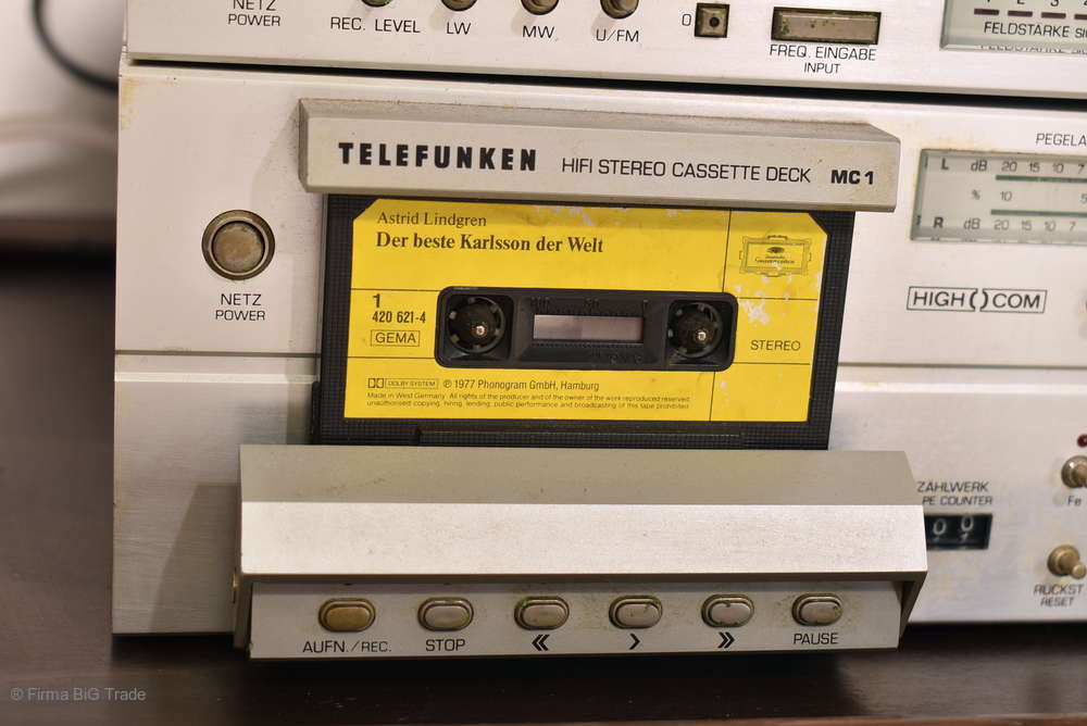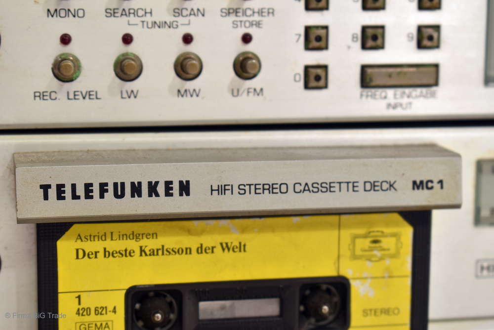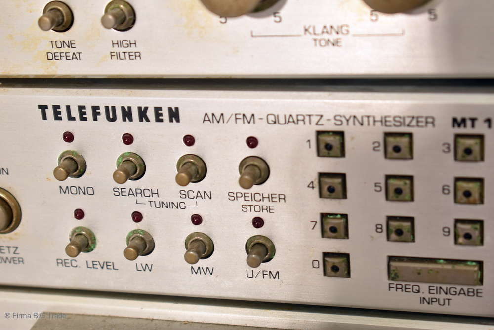 Angeboten wird eine alte TELFUNKEN HiFi-Anlage mit 2 großen Boxen. Die Anlage besteht aus HiFi STEREO CASSETE DESK MC1, AM/FM QUARTZ SYNTHESIZER MT1, STEREO AMPLIFIER MA1 sowie 2 3-Wege Bassreflexbox Modell MBC 300 dazu diverse Kabel und einen Kopfhörer. Die Anlage weist äußerliche Alters- und Gebrauchsspuren u.a. Verfärbungen auf (siehe Bilder). Die Funktion der alten HiFi-Anlage und Boxen wurde nicht überprüft und sie werden als Defekt bzw. Sammlerobjekte angeboten.