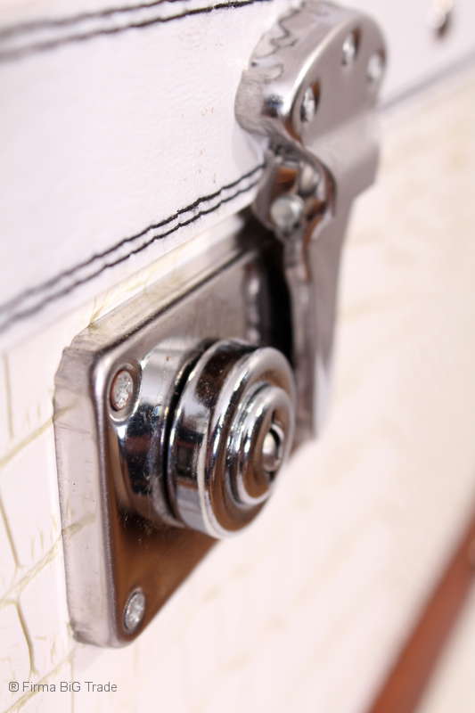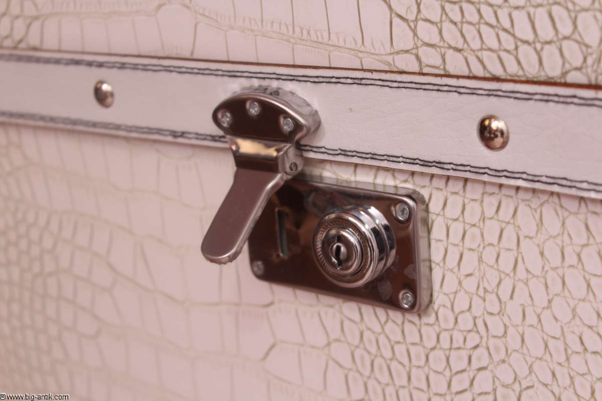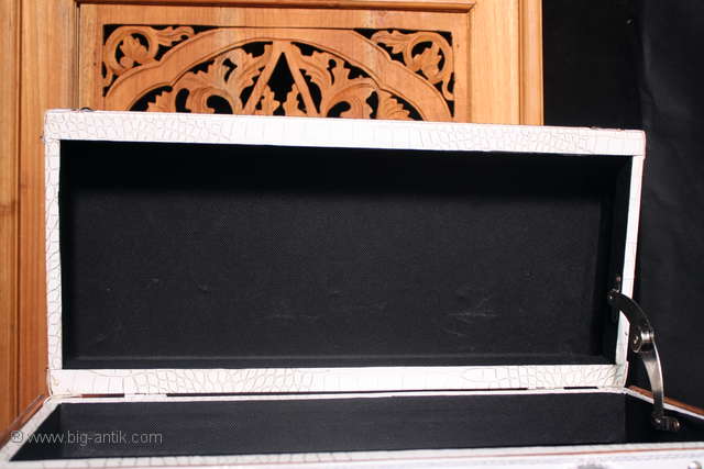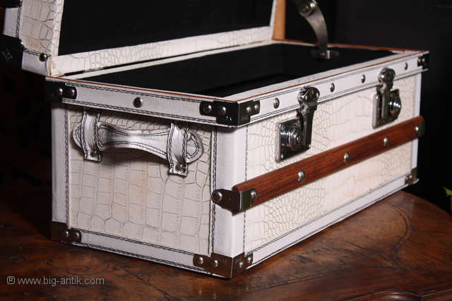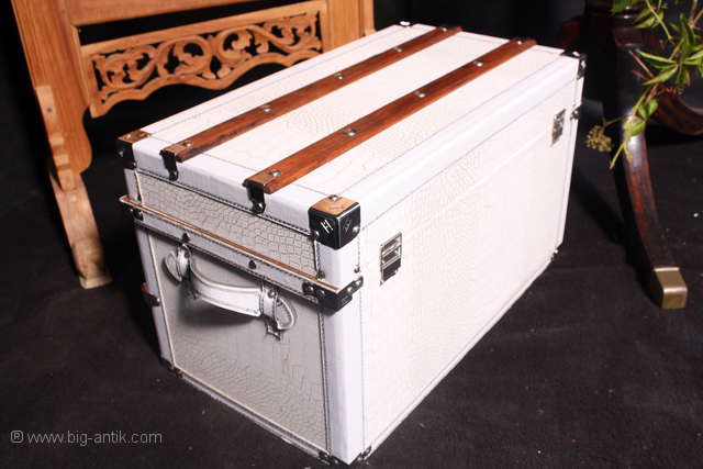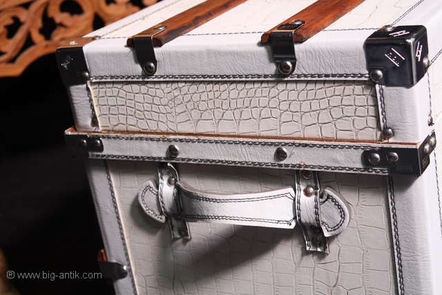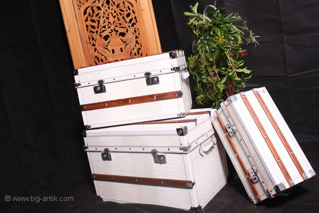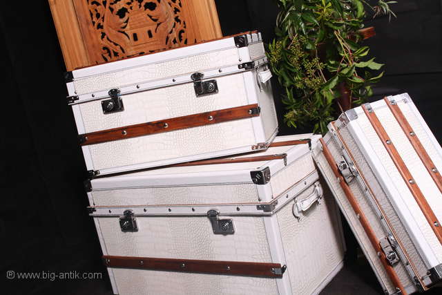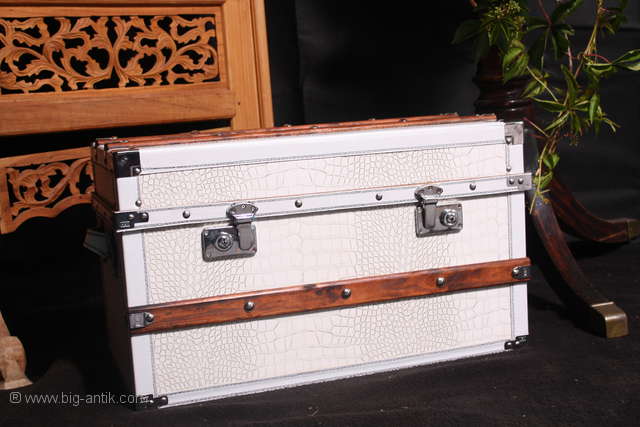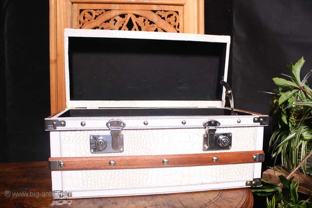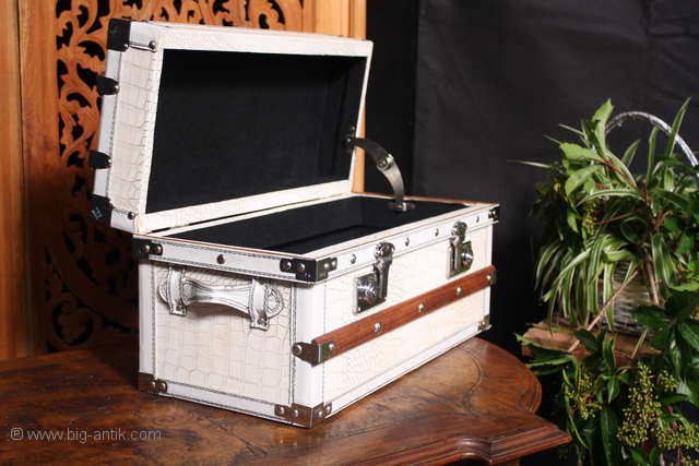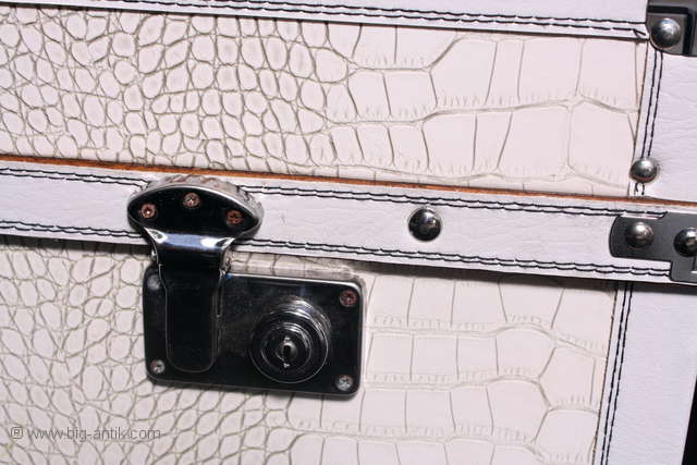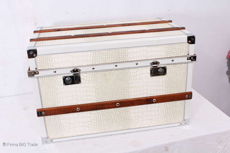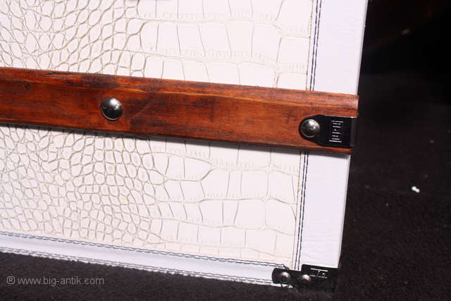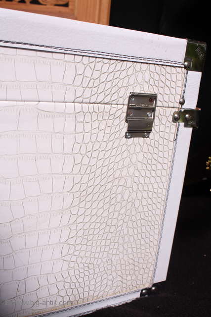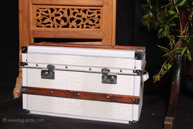 Angeboten wird eine wunderschöne ausgefallene Truhe / Flachdeckeltruhe / Transportkiste / Holztruhe / Überseetruhe im kolonialen Stil. Die schöne Truhe besitzt vorne 2 metallene Schlösser, an den Seiten jeweils einen ledernen Griff, der Korpus ist aus Holz, und mit weißem Kunstleder mit KROKO-Muster bezogen, Kanten sind mit Lederleisten und Metallkappen und Seiten mit Holzlatten verstärkt. Die Schlösser dienen nur als Dekoration, die Truhe ist nicht abschließbar. Die schöne Truhe weist hier und da Gebrauchsspuren auf u.a. das Schloss ist etwas gebogen, die schwarze Stoffeinlage ist an paar kleinen Stellen beschädigt (siehe Bilder). Wir haben die schöne Truhe in 3 verschiedenen Größen.