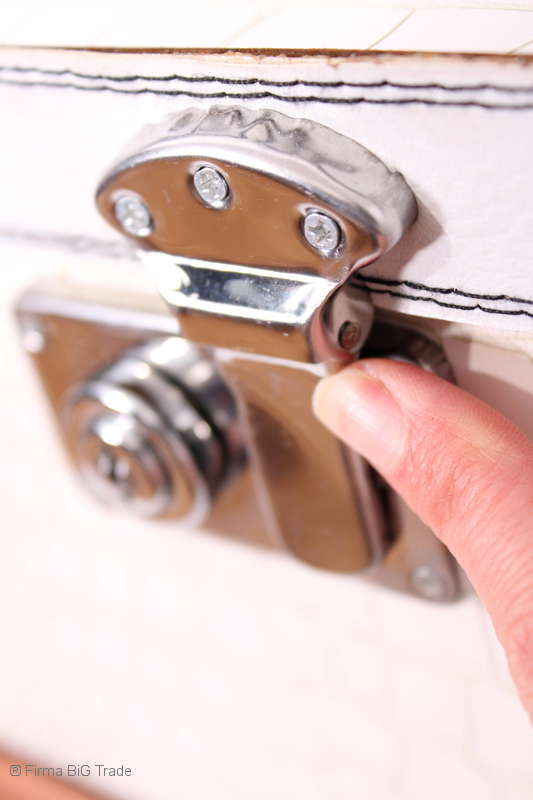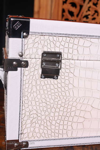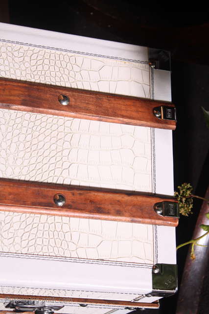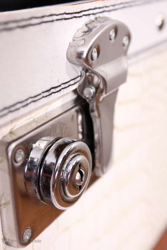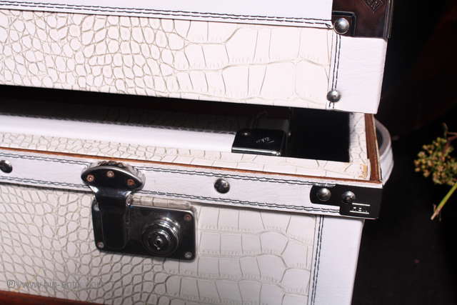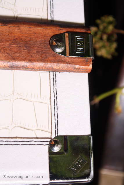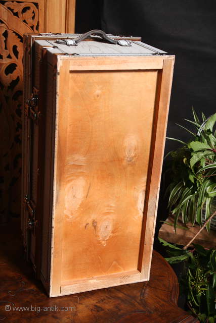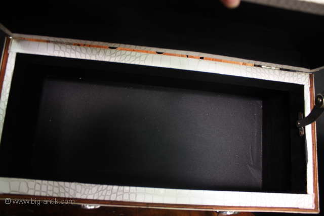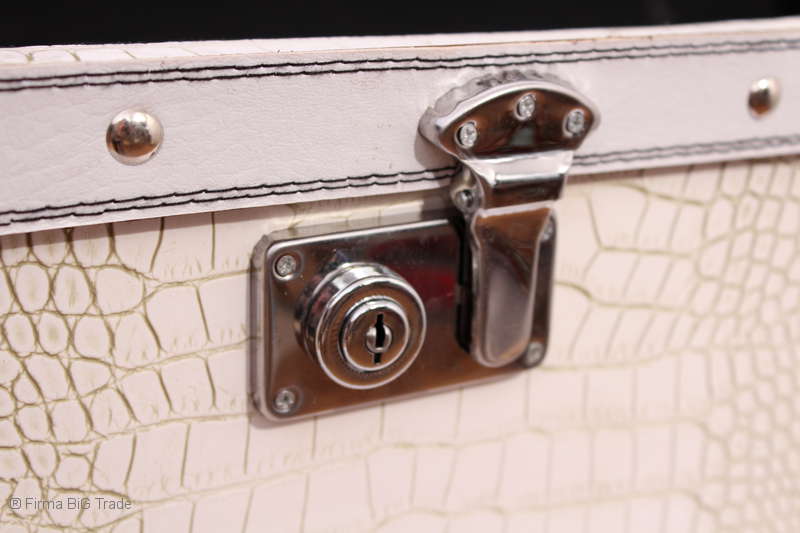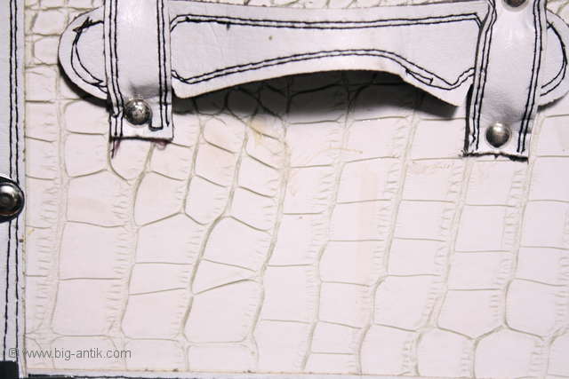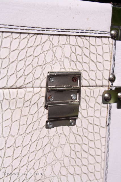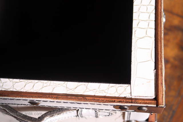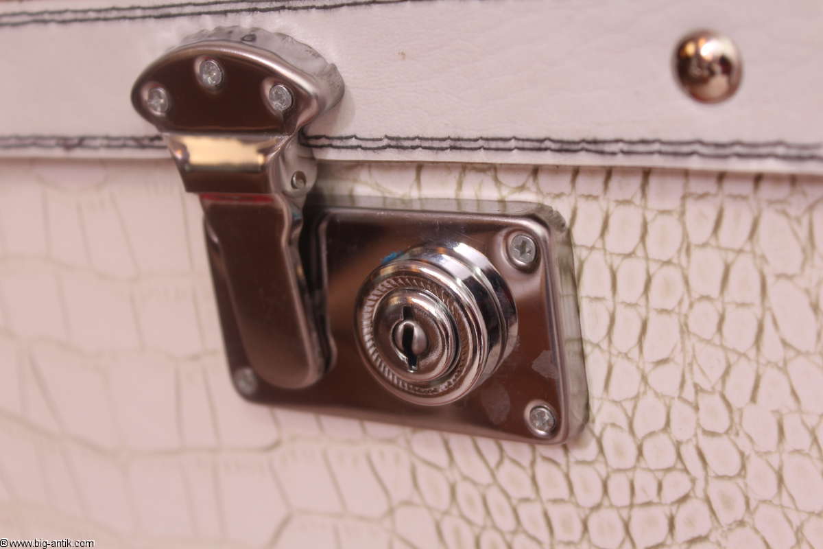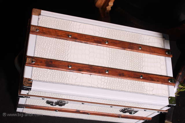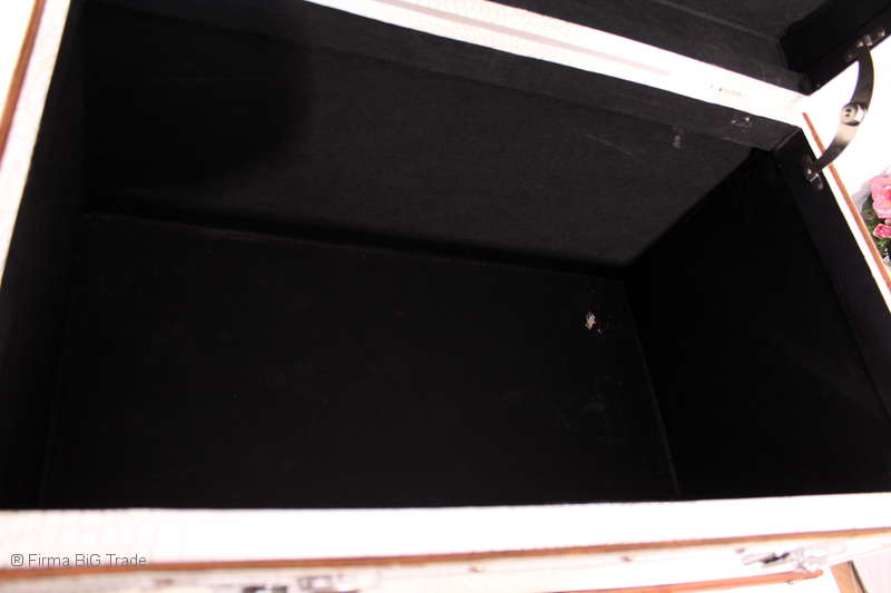Angeboten wird eine wunderschöne ausgefallene Truhe / Flachdeckeltruhe / Transportkiste / Holztruhe / Überseetruhe im kolonialen Stil. Die schöne Truhe besitzt vorne 2 metallene Schlösser, an den Seiten jeweils einen ledernen Griff, der Korpus ist aus Holz, und mit weißem Kunstleder mit KROKO-Muster bezogen, Kanten sind mit Lederleisten und Metallkappen und Seiten mit Holzlatten verstärkt. Die Schlösser dienen nur als Dekoration, die Truhe ist nicht abschließbar. Die schöne Truhe weist hier und da Gebrauchsspuren auf u.a. das Schloss ist etwas gebogen, die schwarze Stoffeinlage ist an paar kleinen Stellen beschädigt (siehe Bilder). Wir haben die schöne Truhe in 3 verschiedenen Größen.