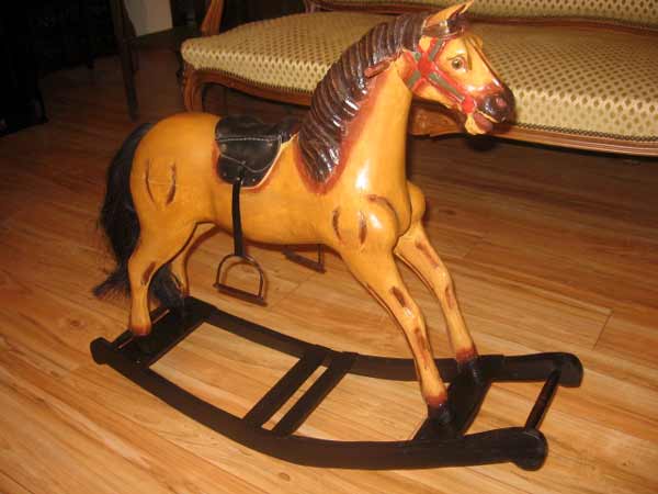 Angeboten wird ein wunderschönes und dekoratives Schaukelpferd aus Massivholz. Das Pferd ist sehr schön und aufwändig geschnitzt und mit vielen Farben gemalt. Es besitzt ein lederner Sattel mit Steigbügel. Die Beine sind auf dem Schaukel befestigt ist. Das schöne Schaukelpferd befindet sich in einem guten Zustand.