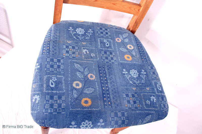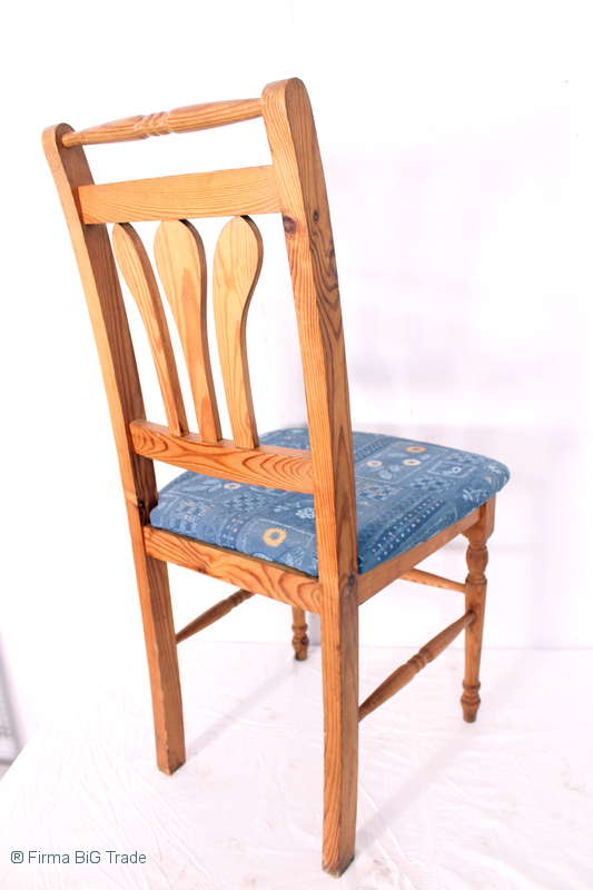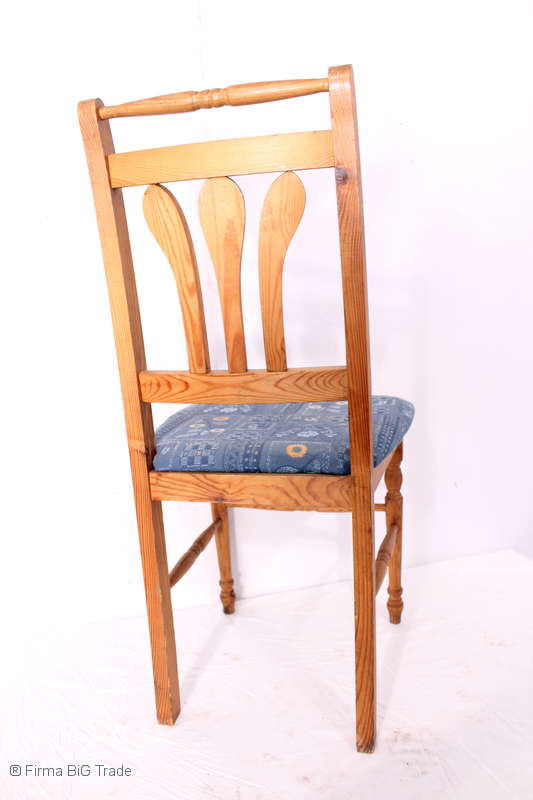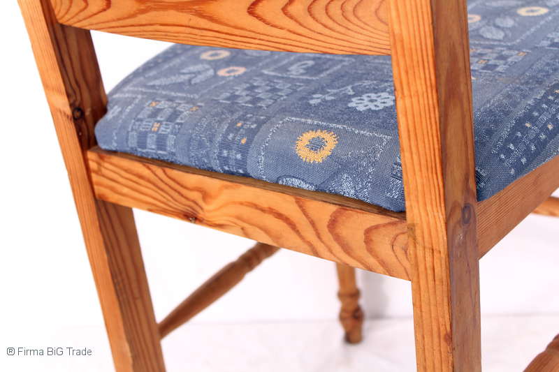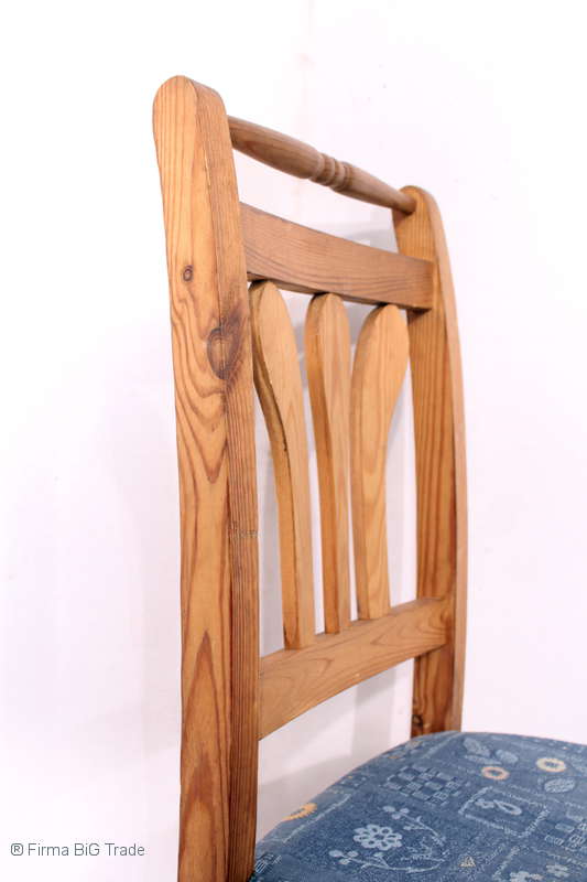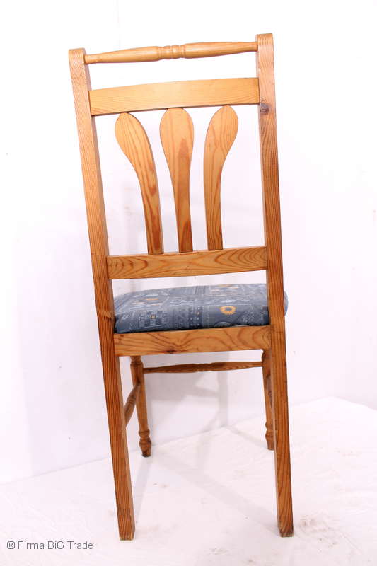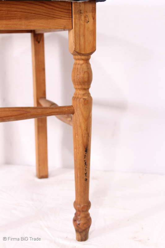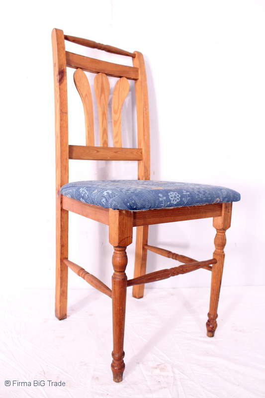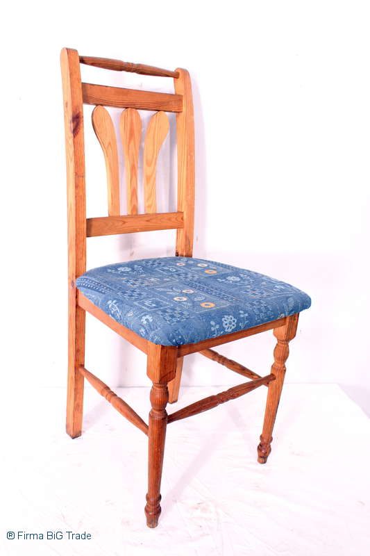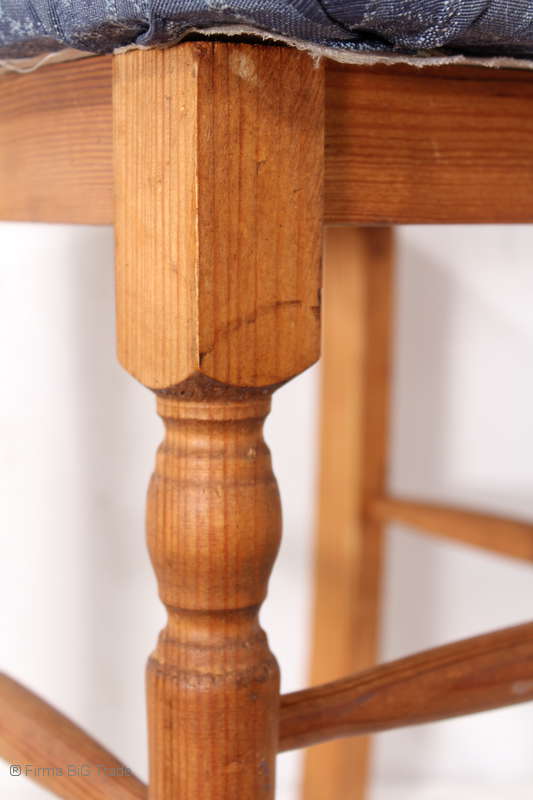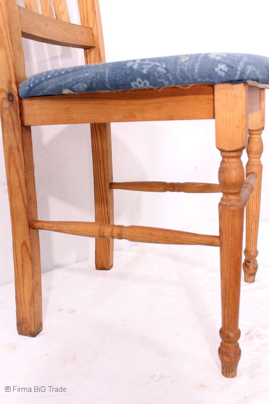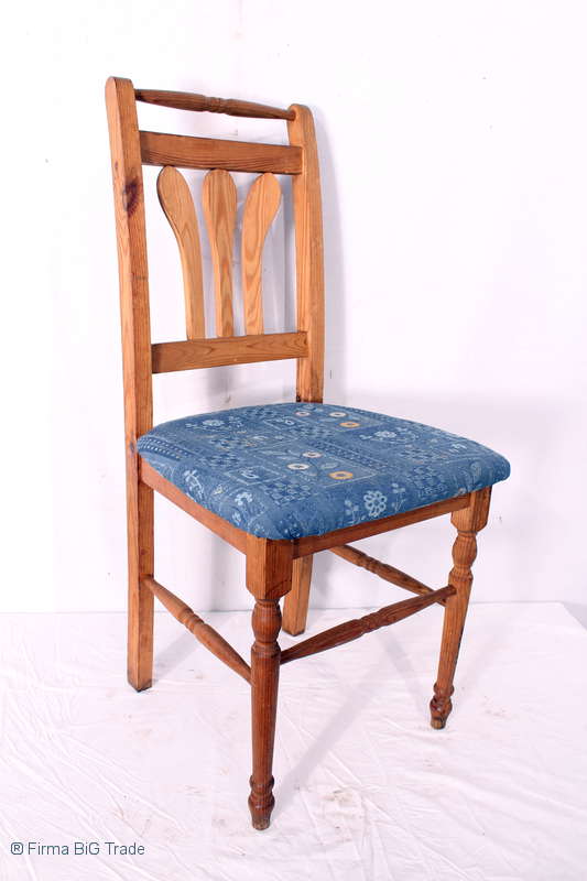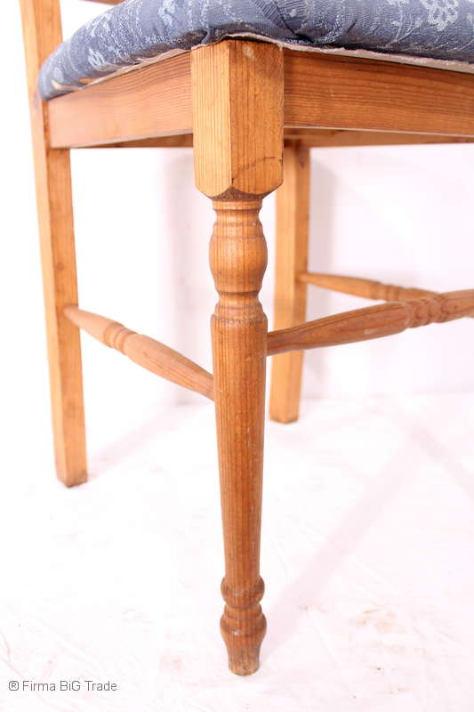 Angeboten wird ein wunderschöner massiver Holzstuhl / Walzenstuhl im Gründerzeitstil / Landhausstuhl. Die Rückenlehne ist mit formschönen Holzbrettern verziert und oben mit einem gedrechselten Holzstab als Griff versehen. Die vorderen Beine sind ebenfalls schön gedrechselt und an den Seiten mittels Holzverstrebungen mit hinteren Beinen verbunden. Die Sitzfläche ist mit einem blau gemusterten Stoff bezogen. Der schöne Küchenstuhl weist hier und da Alters- und Gebrauchsspuren auf u.a. Farbflecken, Kratzer, Stoßstellen (siehe Bilder). Ansonsten befindet sich der tolle Landhausstuhl in einem guten gebrauchten Zustand.
