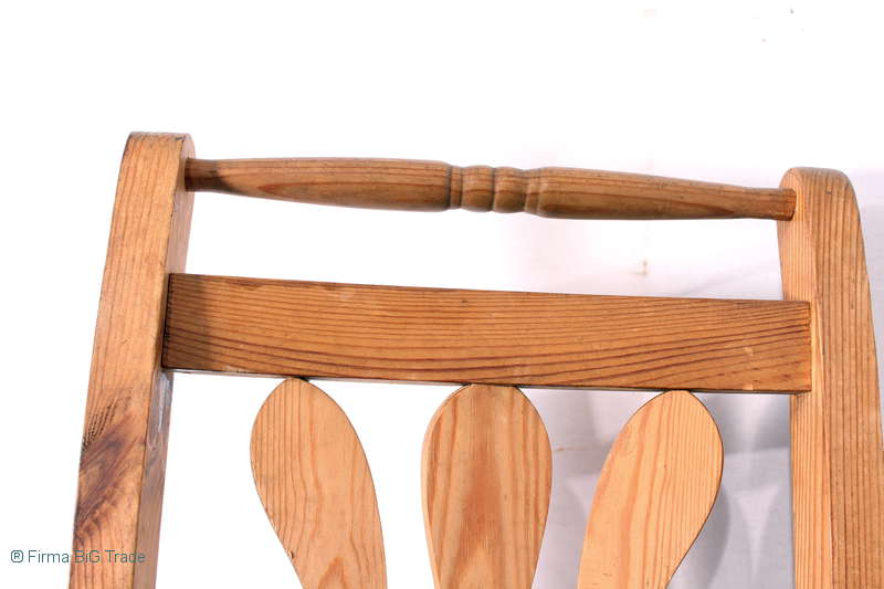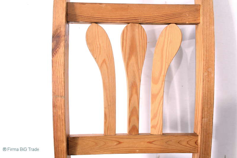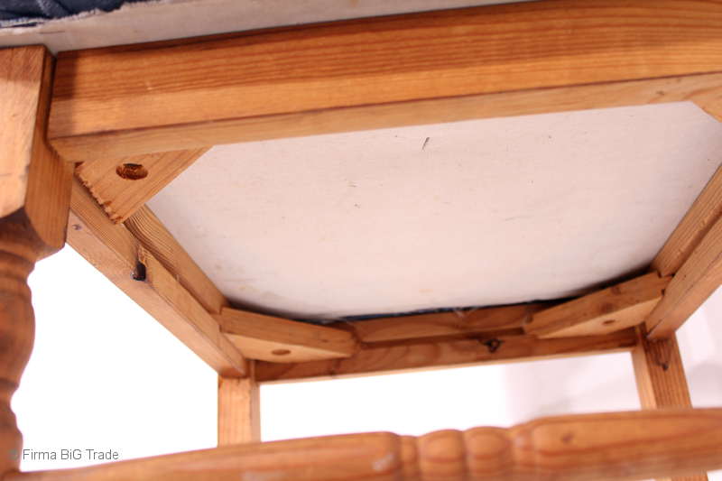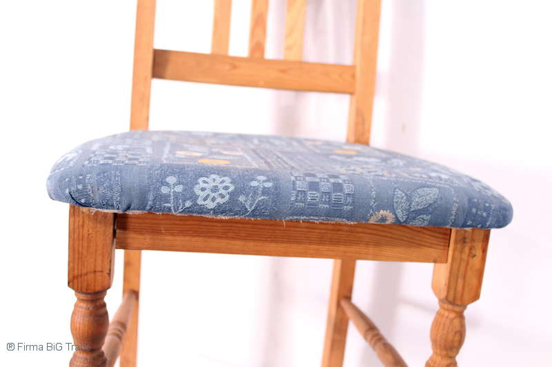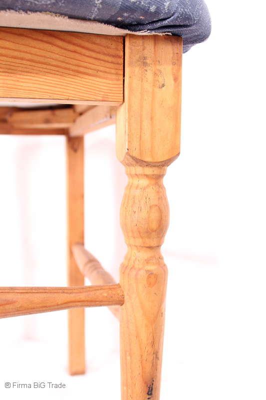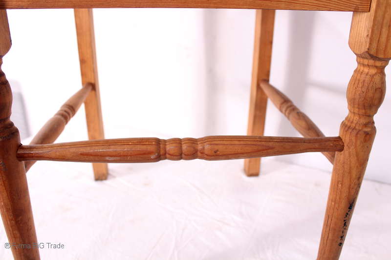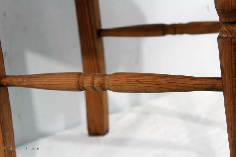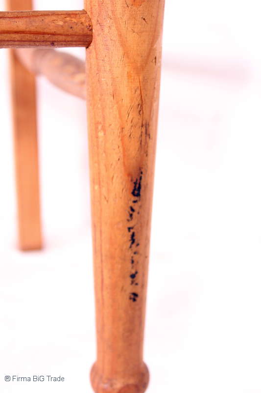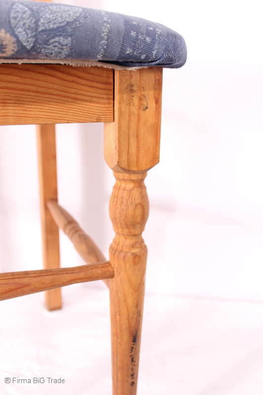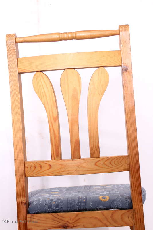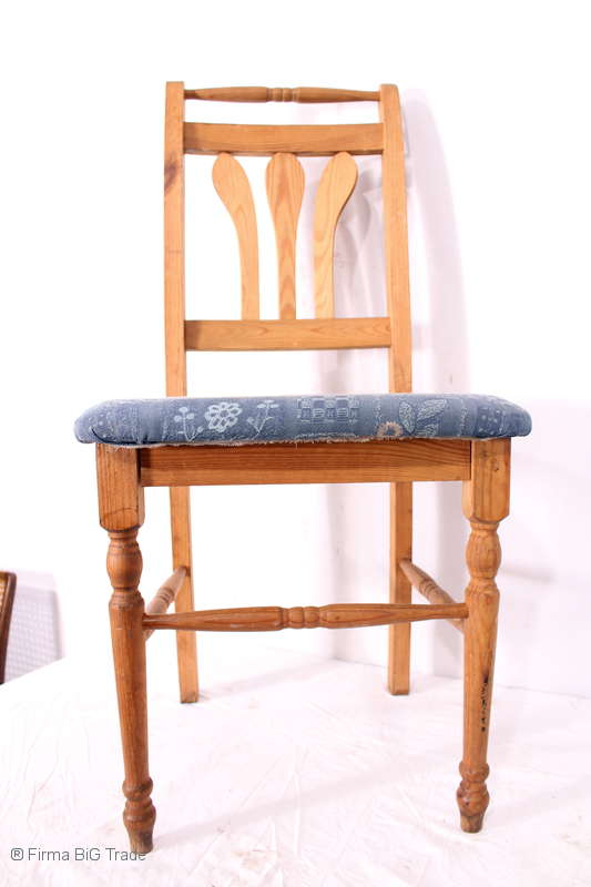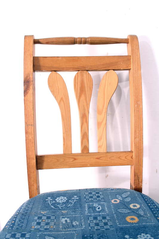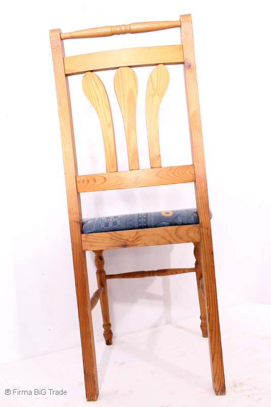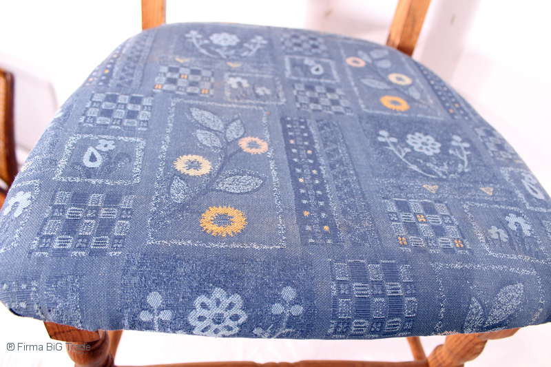 Angeboten wird ein wunderschöner massiver Holzstuhl / Walzenstuhl im Gründerzeitstil / Landhausstuhl. Die Rückenlehne ist mit formschönen Holzbrettern verziert und oben mit einem gedrechselten Holzstab als Griff versehen. Die vorderen Beine sind ebenfalls schön gedrechselt und an den Seiten mittels Holzverstrebungen mit hinteren Beinen verbunden. Die Sitzfläche ist mit einem blau gemusterten Stoff bezogen. Der schöne Küchenstuhl weist hier und da Alters- und Gebrauchsspuren auf u.a. Farbflecken, Kratzer, Stoßstellen (siehe Bilder). Ansonsten befindet sich der tolle Landhausstuhl in einem guten gebrauchten Zustand.