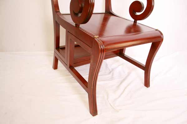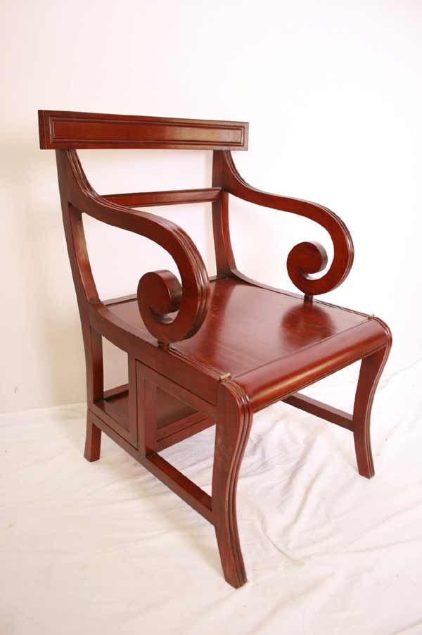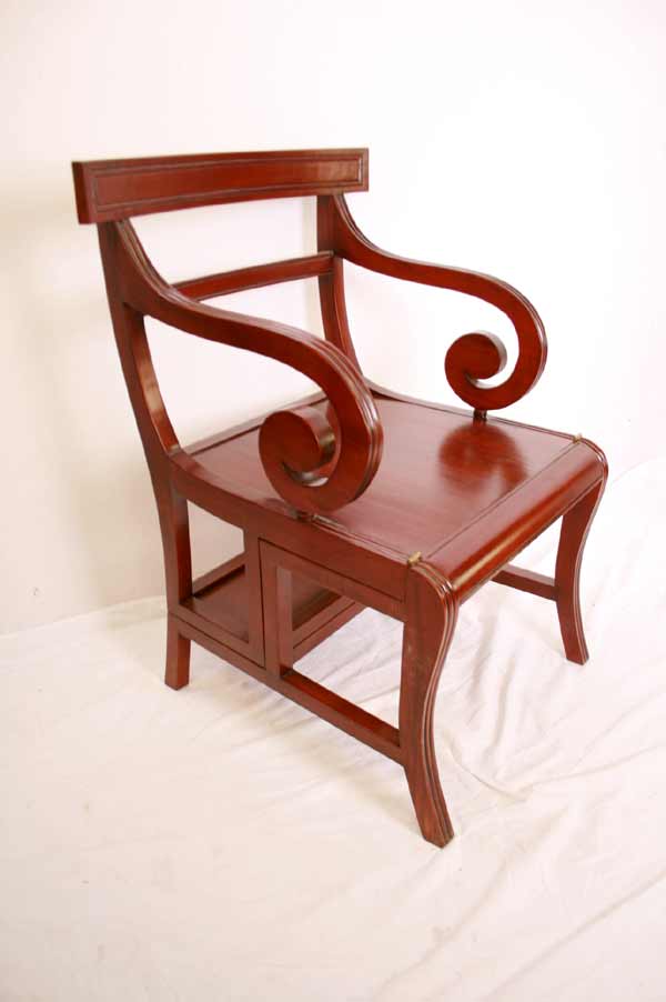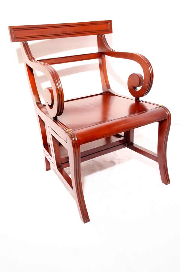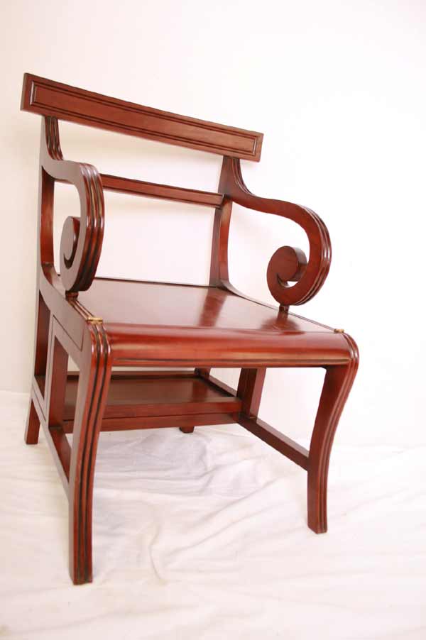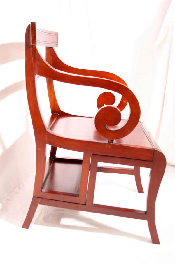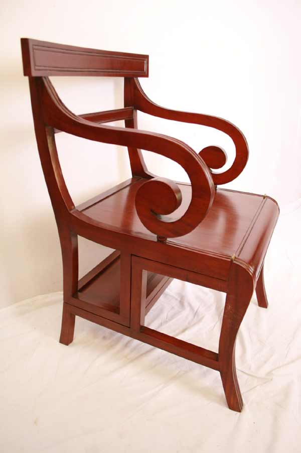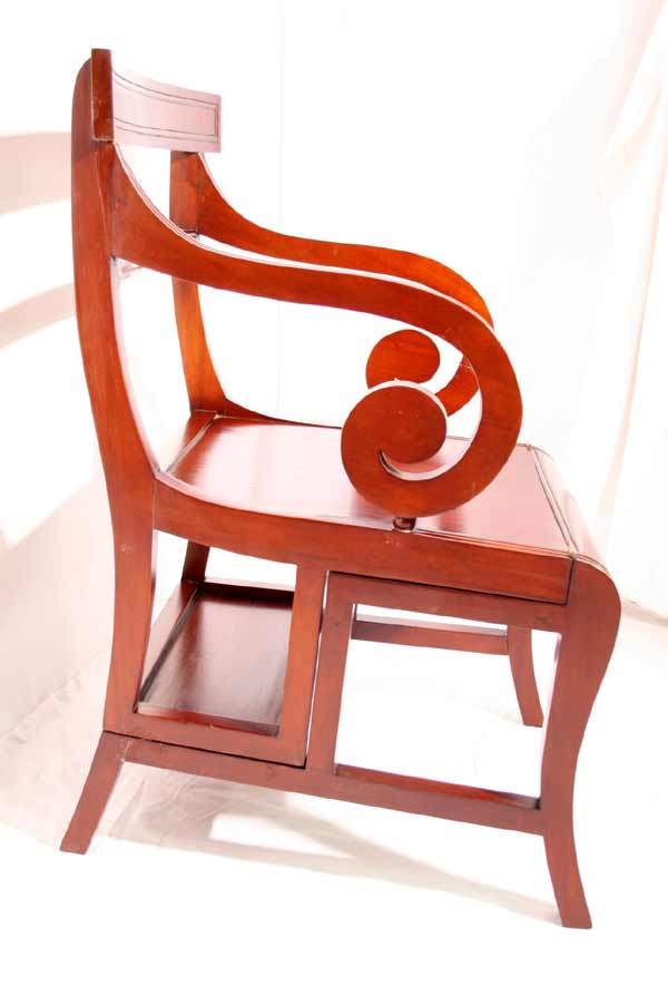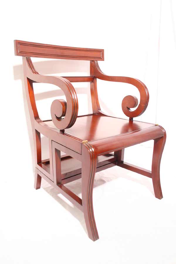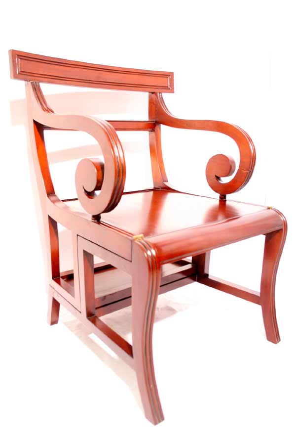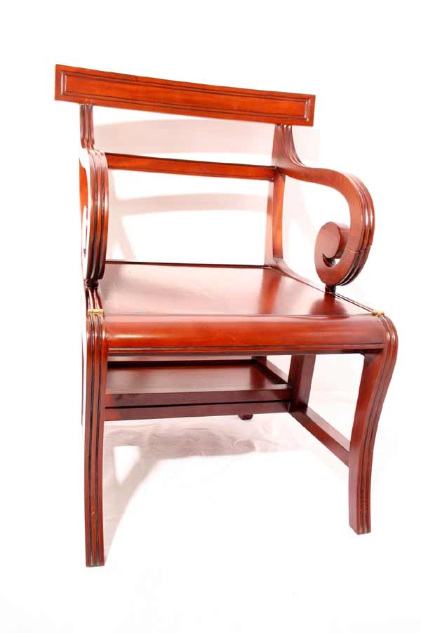 Angeboten wird ein traumhaft schöner großer Bibliothekstuhl / Armlehnenstuhl / Library Chair im antiken englisch Kolonial Stil aus massivem Mahagoni Holz. Der edle Stuhl kann in eine Leiter umgewandelt werden. Er besitzt zwei elegant geschwungene Armlehnen. Die Leiterstufen sind sehr schön mit eckigen Reliefen geschnitzt. Der edle Armlehnenstuhl / Bibliothekleiter ist neu und befindet sich in einem tadellosen Zustand. Wir haben weitere Bibliothekleiter in unserem Shop im Angebot!