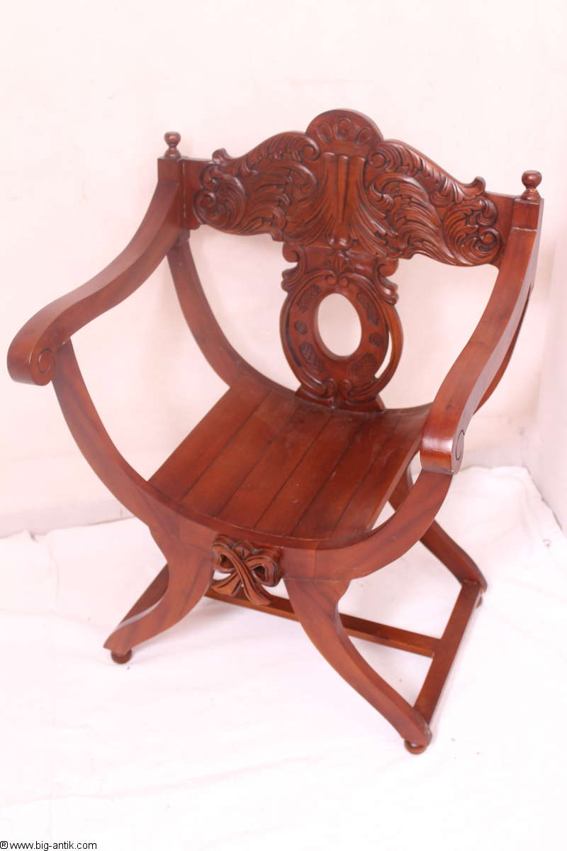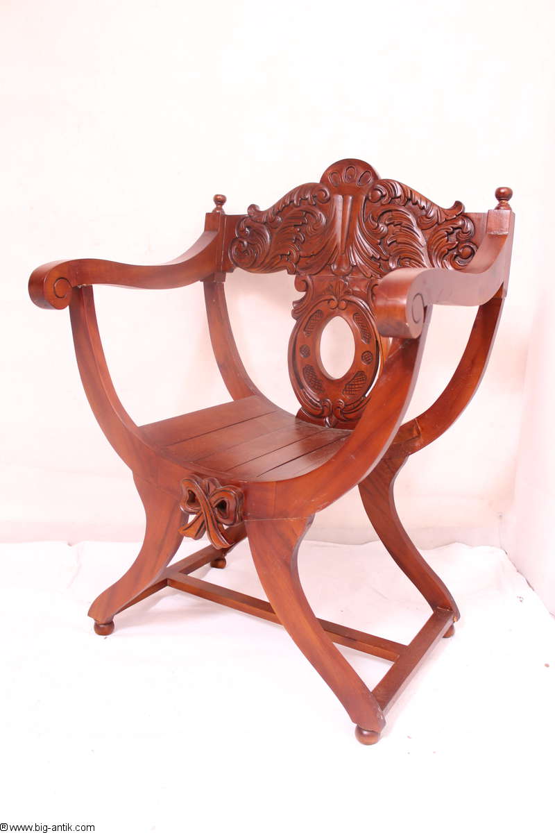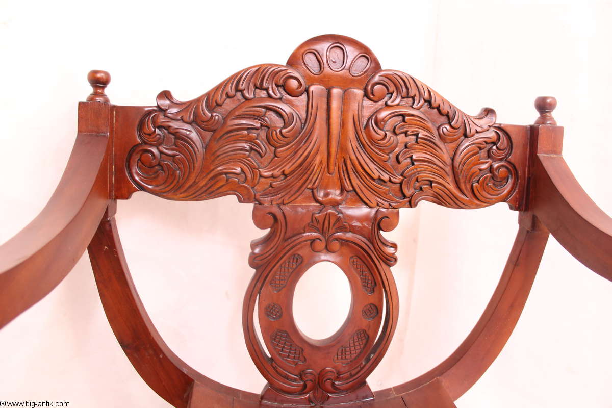 Römer Stuhl / Thronstuhl / Scherenstuhl / Schnitzereien / Armlehnenstuhl / Mahagoni Massiv