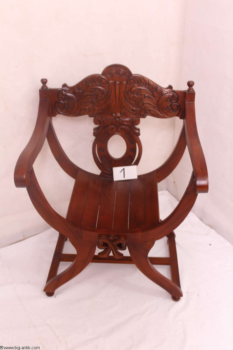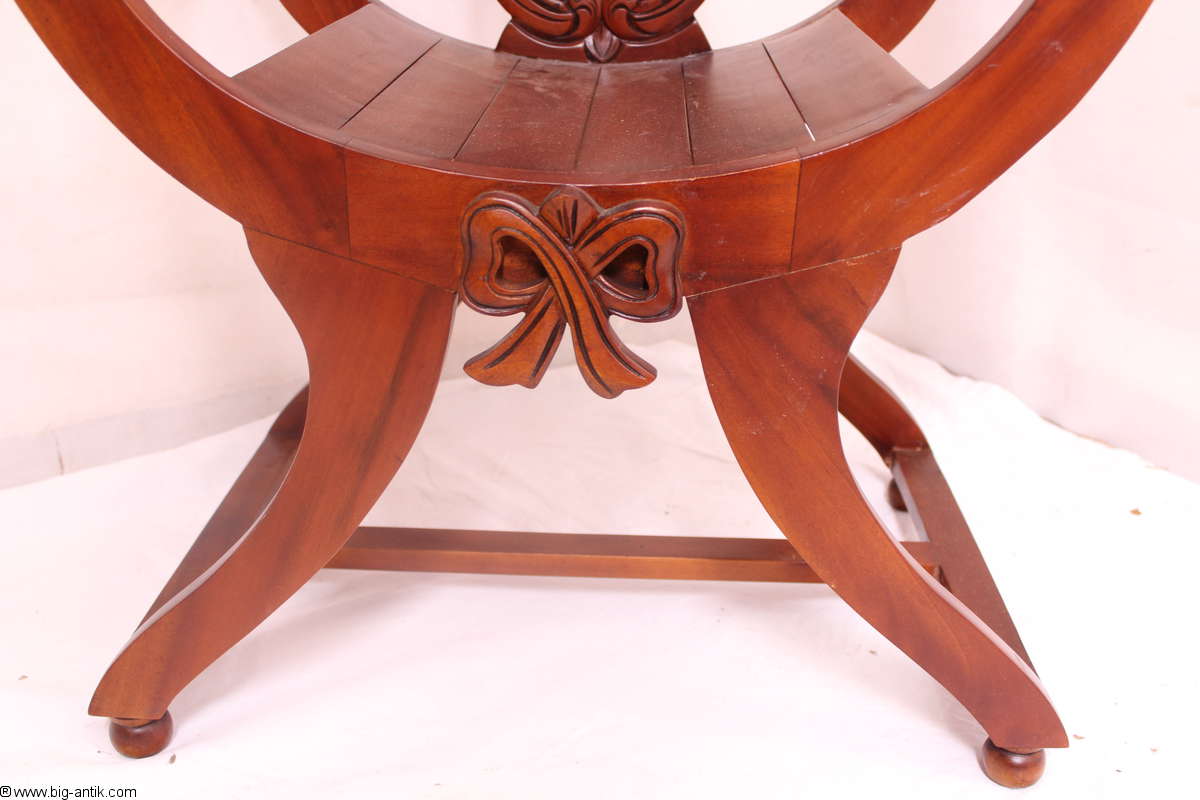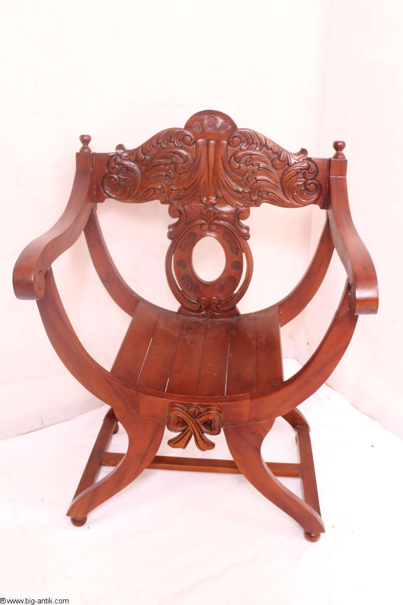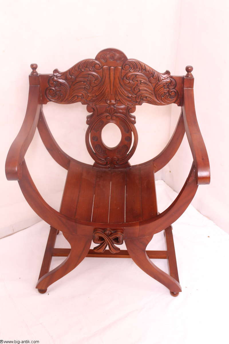 Römer Stuhl / Thronstuhl / Scherenstuhl / Schnitzereien / Armlehnenstuhl / Mahagoni Massiv