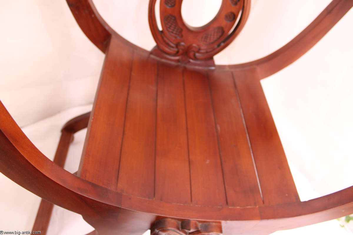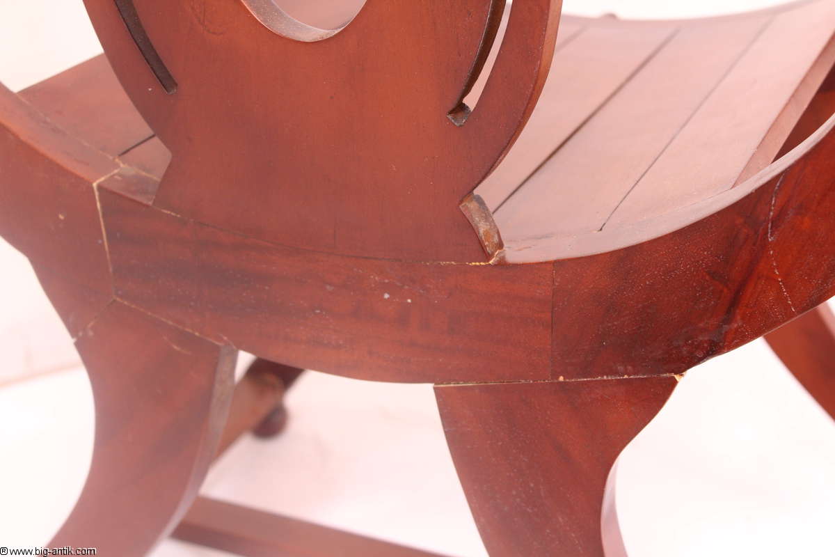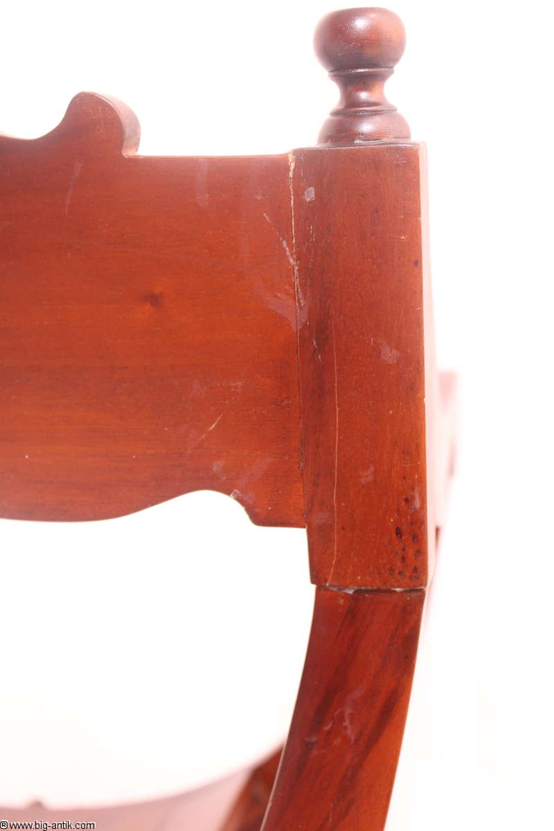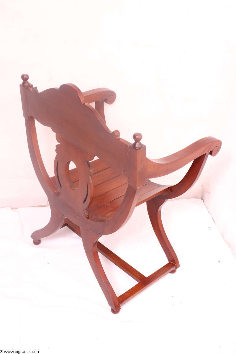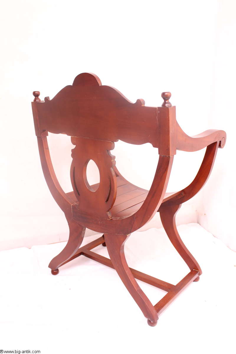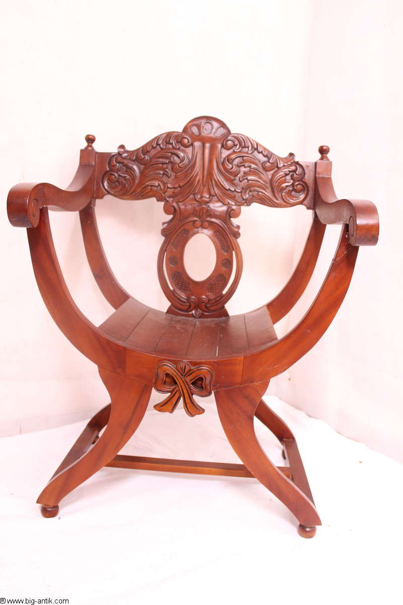 Angeboten wird ein schöner Armlehnenstuhl / Römer Stuhl / Thronstuhl / Scherenstuhl aus massivem Mahagoniholz. Die Rückenlehne ist fantastisch schön geschnitzt und Wappenförmig gestaltet. Die Armlehnen sind leicht geschwungen, die Sitzfläche ist sehr elegant halbrund geformt. Die nach außen gebogenen Beine sind mittels Holzverstrebung miteinander verbunden. Der formschöne Scherenstuhl weist einige Gebrauchsspuren auf u.a wurde der Stuhl an vielen Stellen geleimt, Bruch- bzw. Leimstellen, Kratzer (alles siehe Bilder), dennoch ist der wunderschöne Thronstuhl stabil.