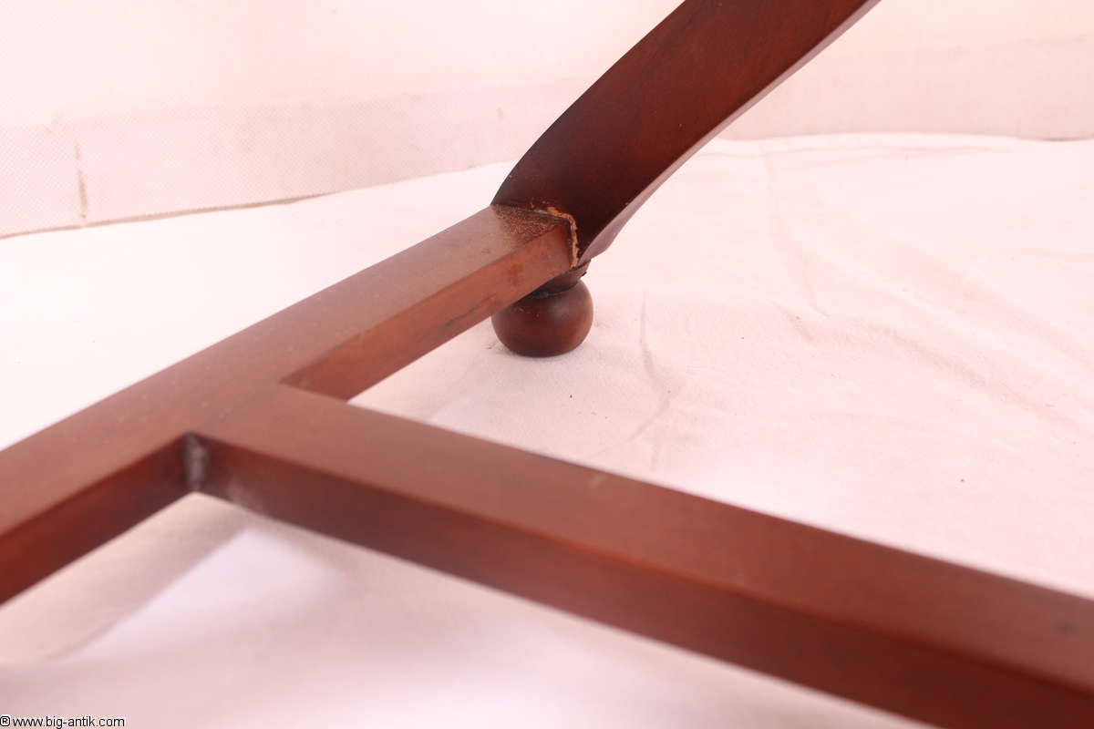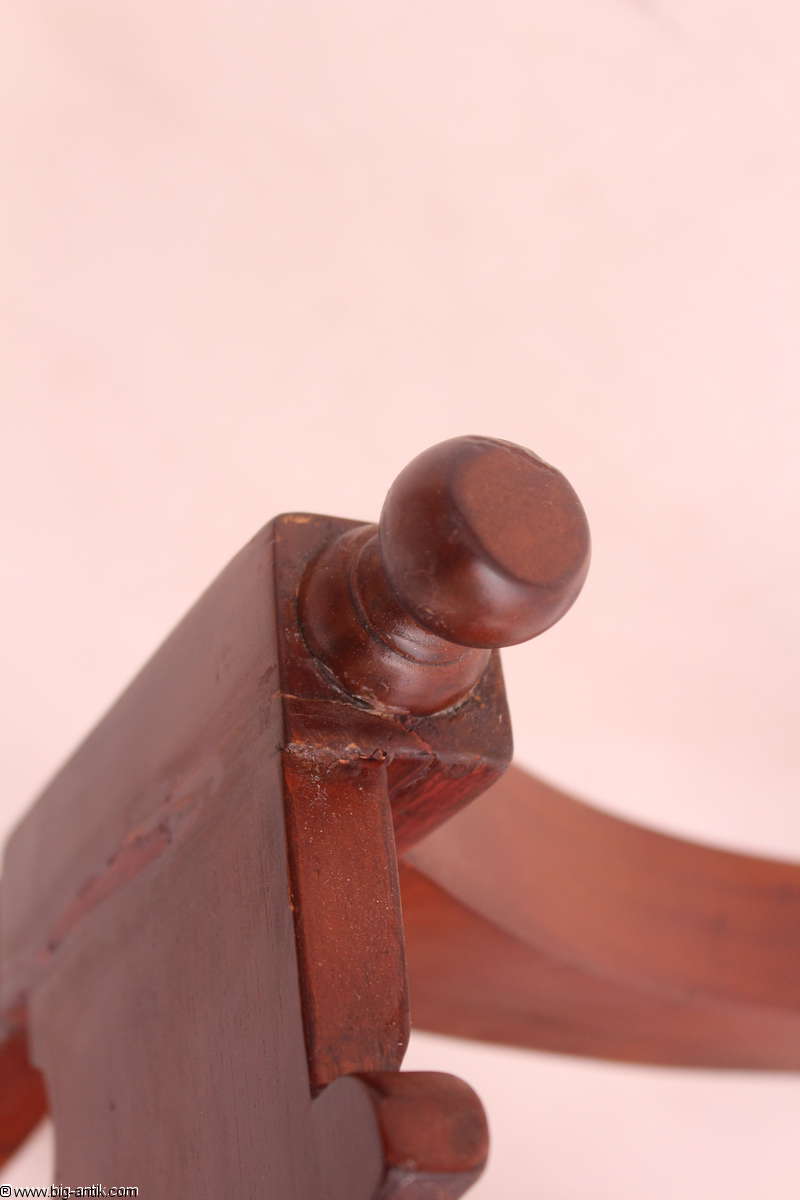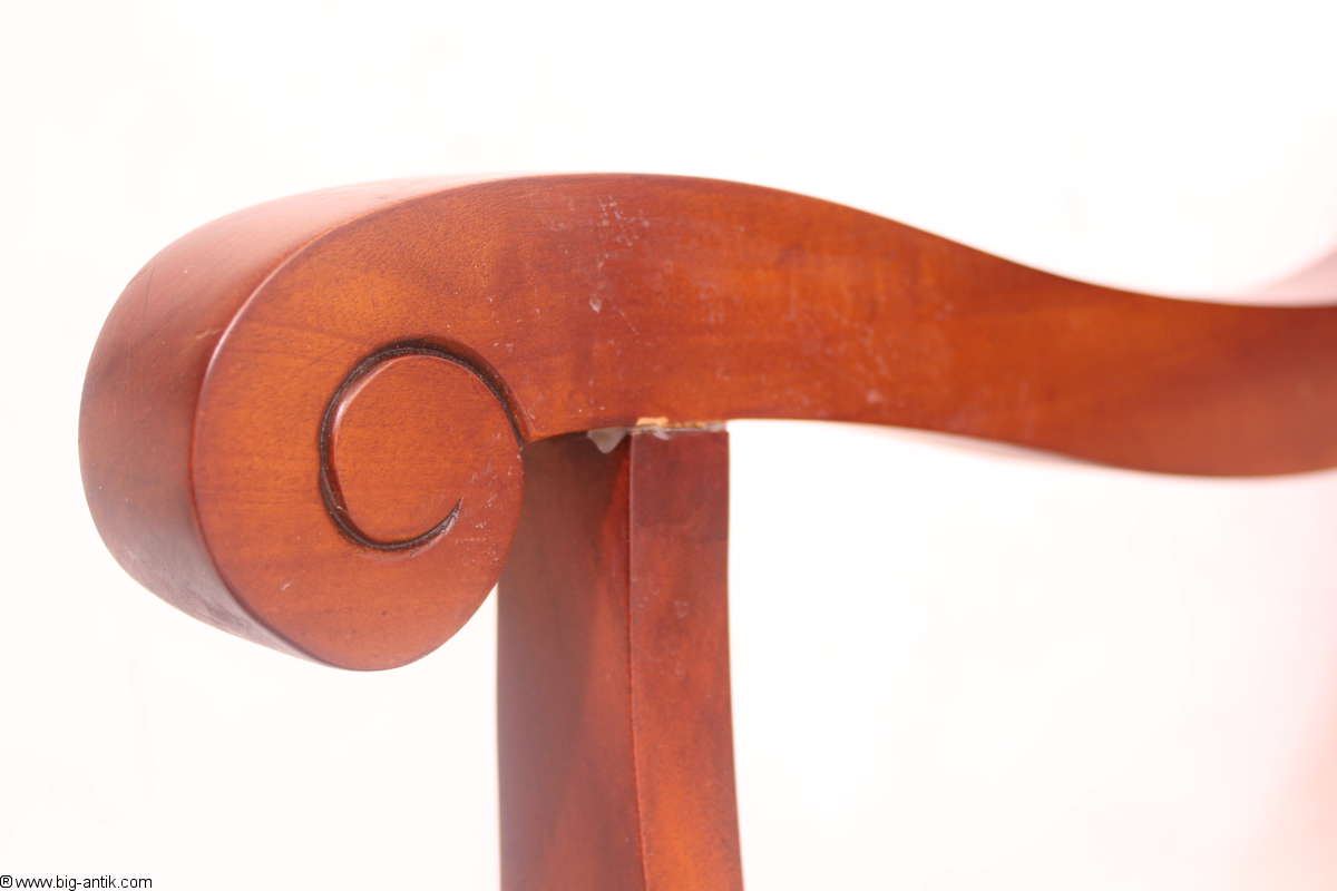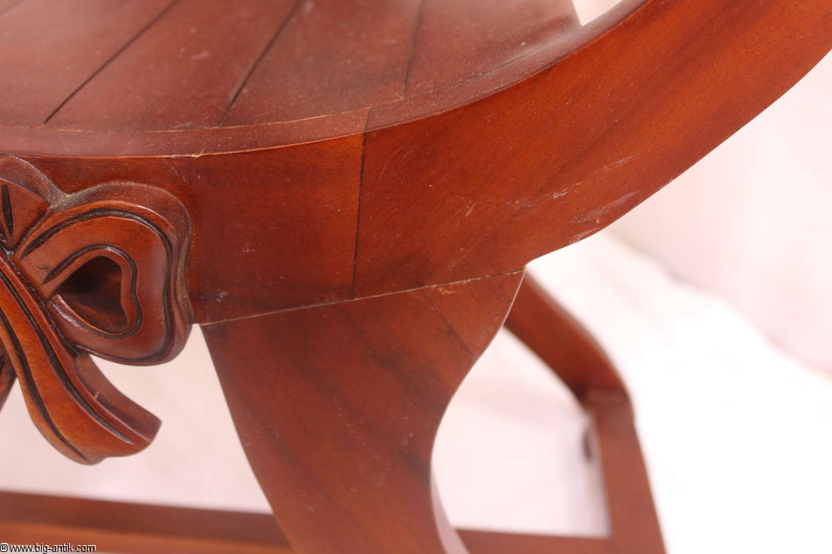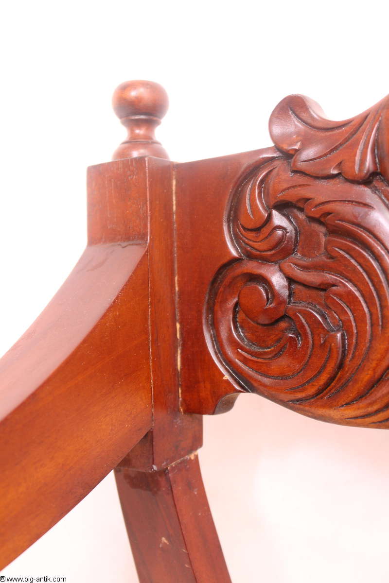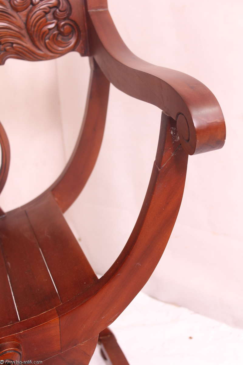 Angeboten wird ein schöner Armlehnenstuhl / Römer Stuhl / Thronstuhl / Scherenstuhl aus massivem Mahagoniholz. Die Rückenlehne ist fantastisch schön geschnitzt und Wappenförmig gestaltet. Die Armlehnen sind leicht geschwungen, die Sitzfläche ist sehr elegant halbrund geformt. Die nach außen gebogenen Beine sind mittels Holzverstrebung miteinander verbunden. Der formschöne Scherenstuhl weist einige Gebrauchsspuren auf u.a wurde der Stuhl an vielen Stellen geleimt, Bruch- bzw. Leimstellen, Kratzer (alles siehe Bilder), dennoch ist der wunderschöne Thronstuhl stabil.