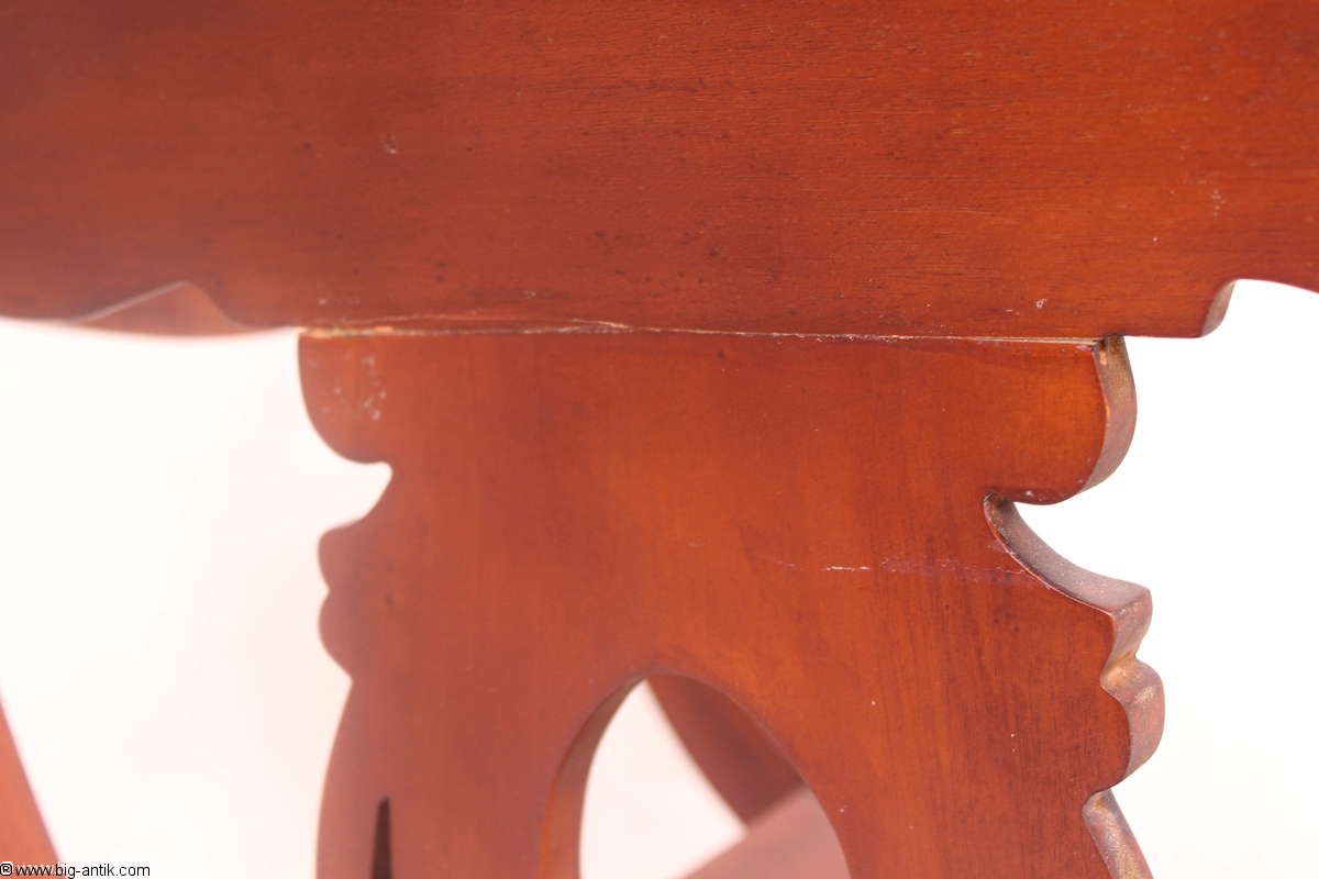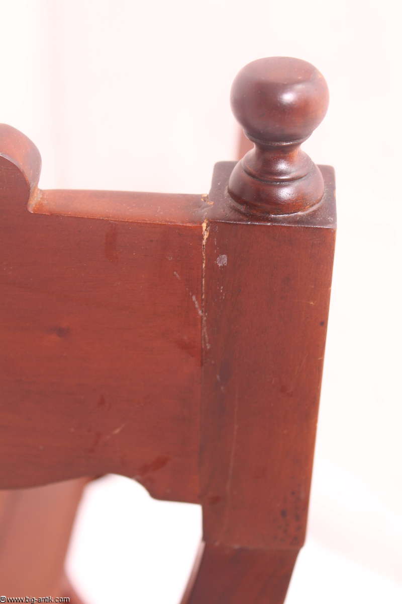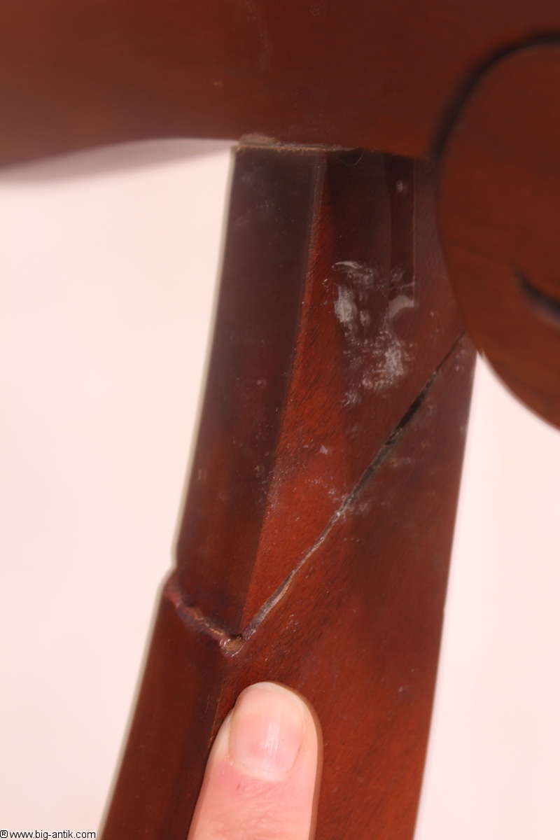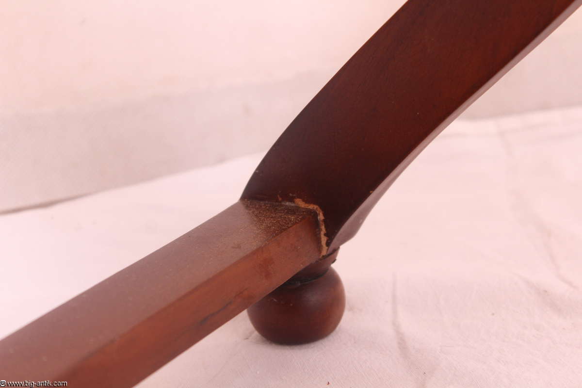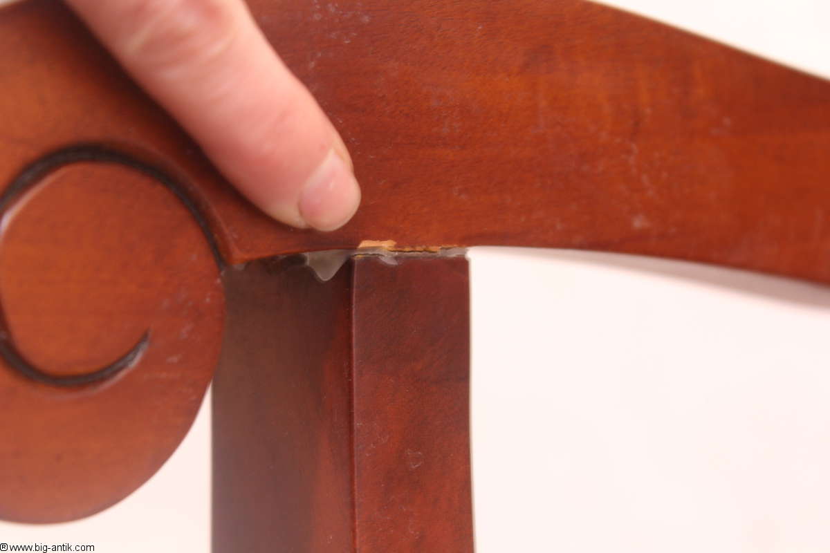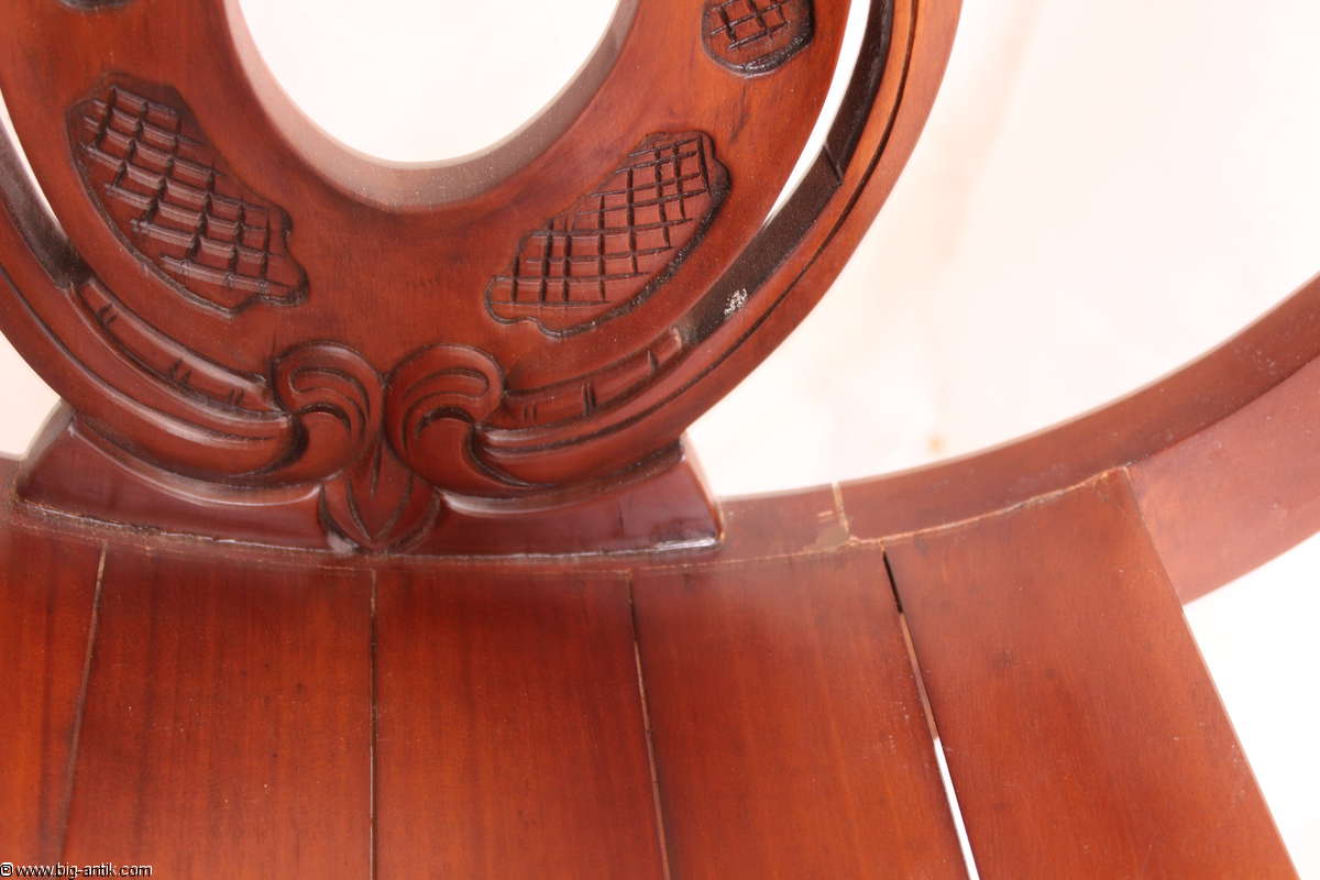 Angeboten wird ein schöner Armlehnenstuhl / Römer Stuhl / Thronstuhl / Scherenstuhl aus massivem Mahagoniholz. Die Rückenlehne ist fantastisch schön geschnitzt und Wappenförmig gestaltet. Die Armlehnen sind leicht geschwungen, die Sitzfläche ist sehr elegant halbrund geformt. Die nach außen gebogenen Beine sind mittels Holzverstrebung miteinander verbunden. Der formschöne Scherenstuhl weist einige Gebrauchsspuren auf u.a wurde der Stuhl an vielen Stellen geleimt, Bruch- bzw. Leimstellen, Kratzer (alles siehe Bilder), dennoch ist der wunderschöne Thronstuhl stabil.
