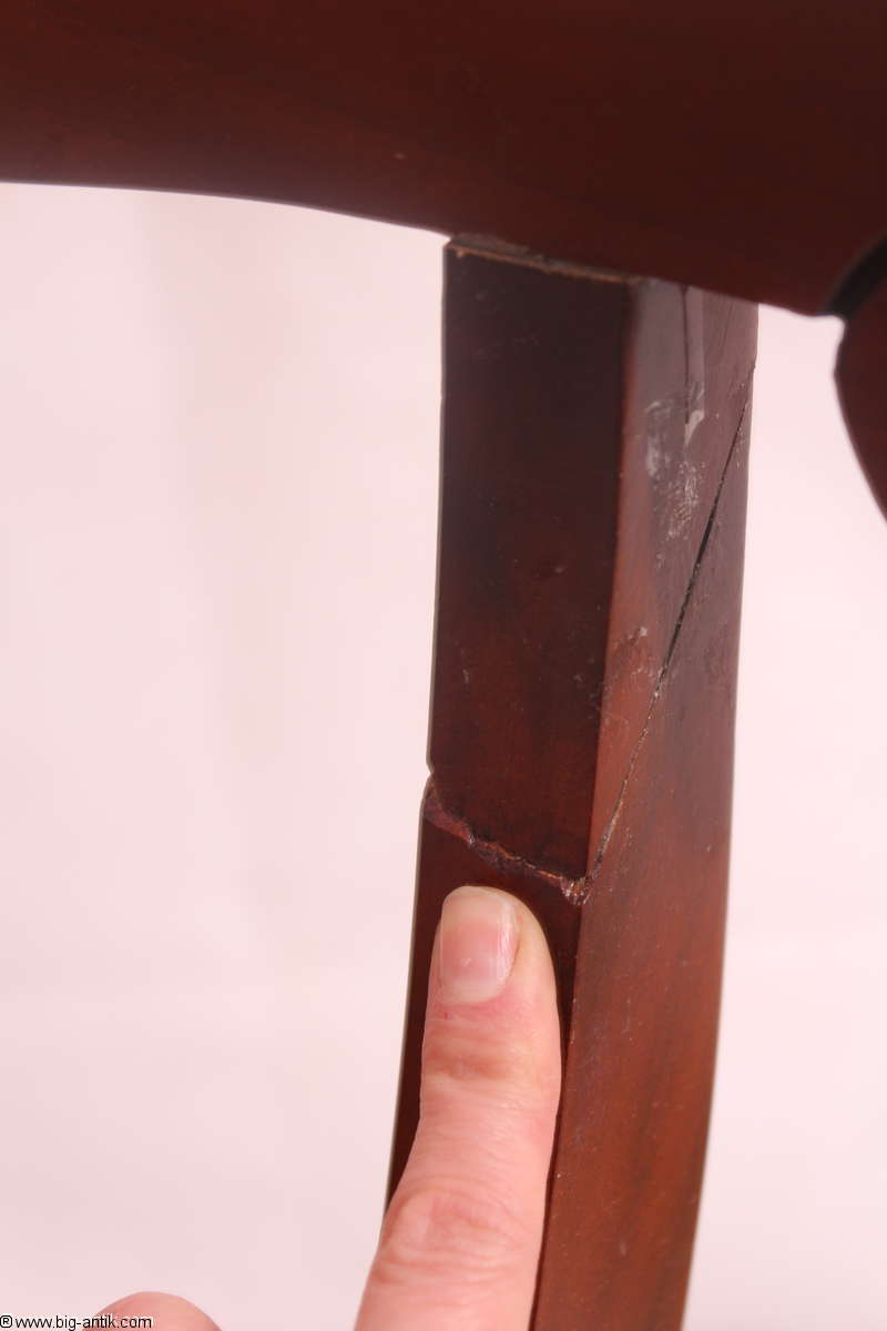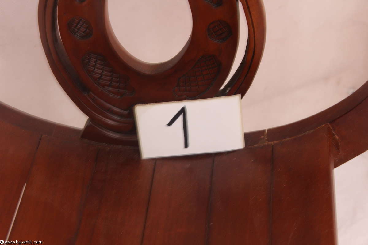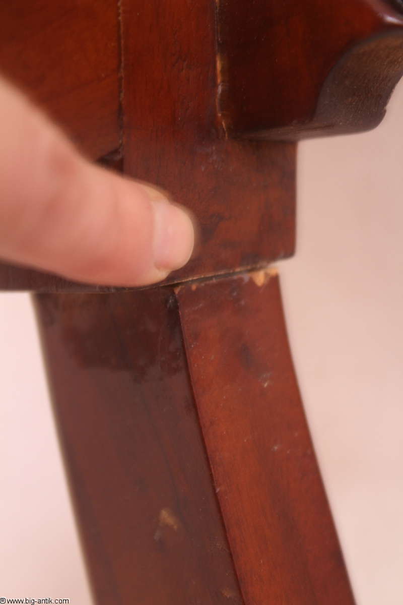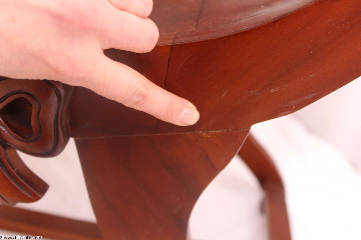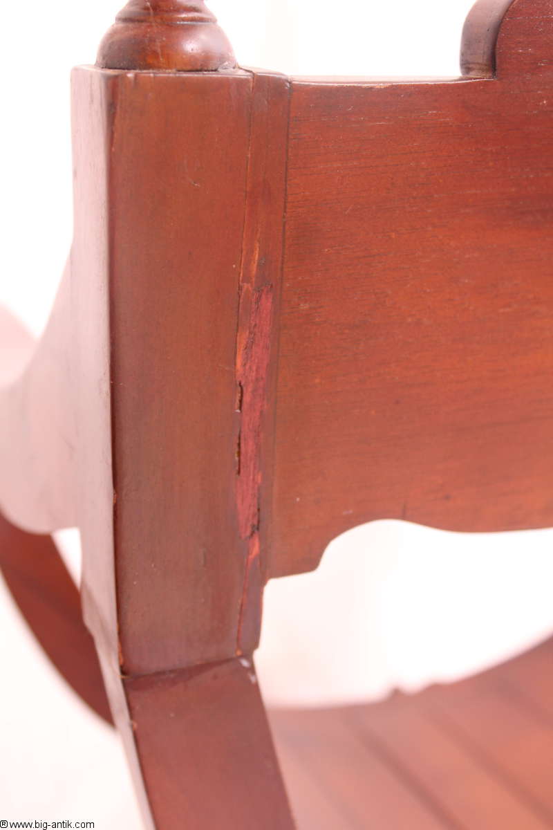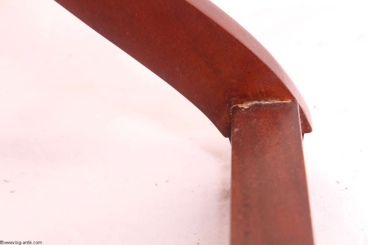 Angeboten wird ein schöner Armlehnenstuhl / Römer Stuhl / Thronstuhl / Scherenstuhl aus massivem Mahagoniholz. Die Rückenlehne ist fantastisch schön geschnitzt und Wappenförmig gestaltet. Die Armlehnen sind leicht geschwungen, die Sitzfläche ist sehr elegant halbrund geformt. Die nach außen gebogenen Beine sind mittels Holzverstrebung miteinander verbunden. Der formschöne Scherenstuhl weist einige Gebrauchsspuren auf u.a wurde der Stuhl an vielen Stellen geleimt, Bruch- bzw. Leimstellen, Kratzer (alles siehe Bilder), dennoch ist der wunderschöne Thronstuhl stabil.