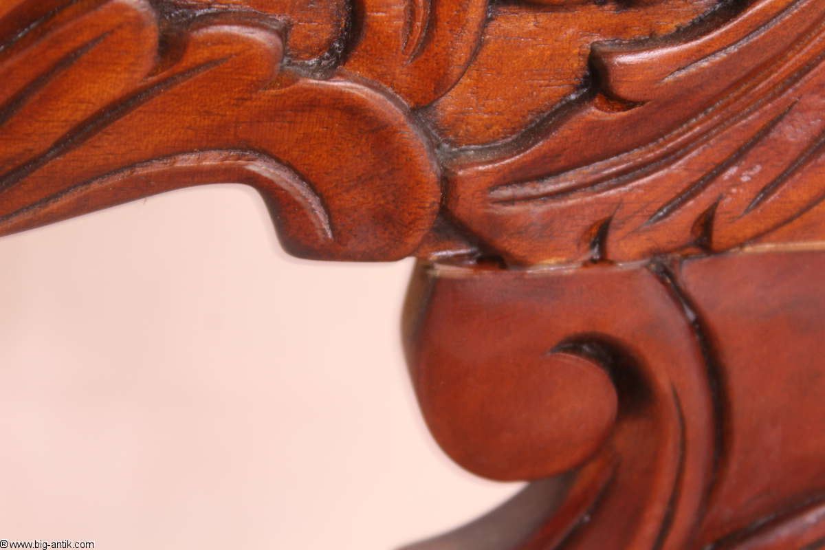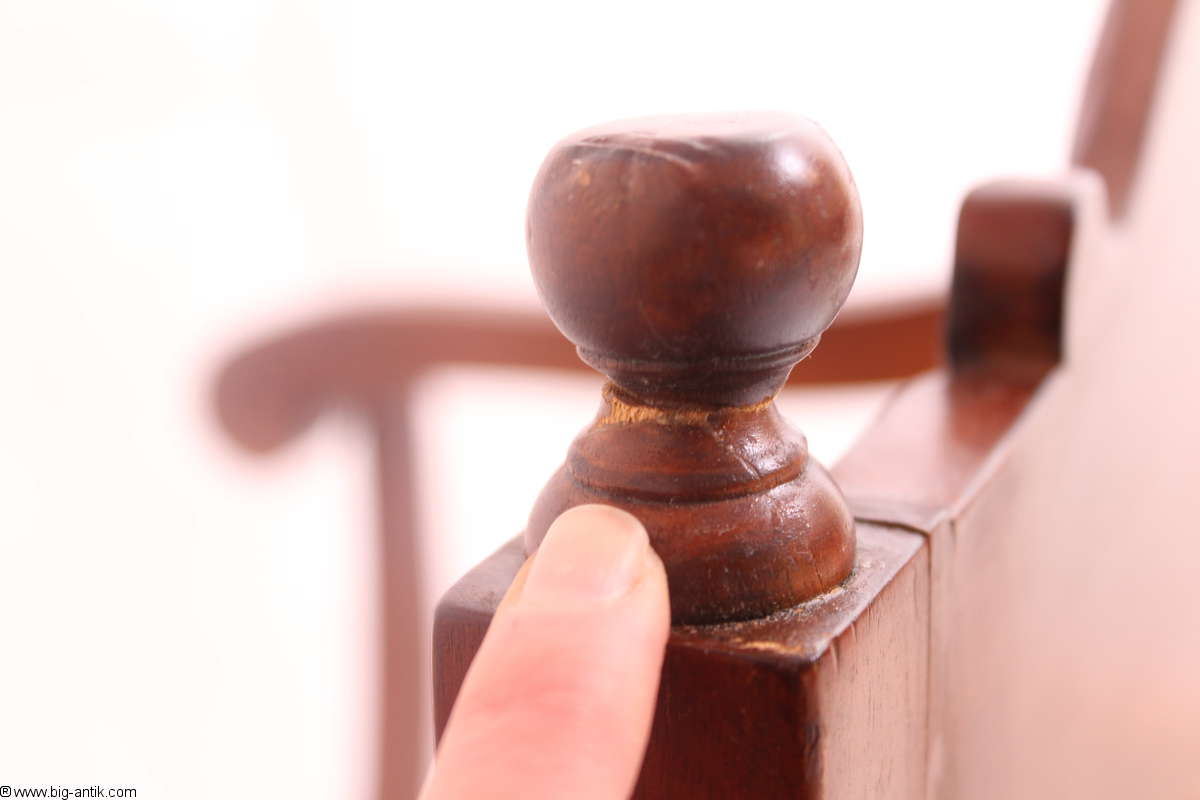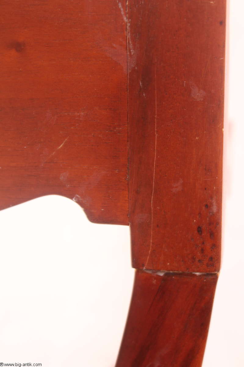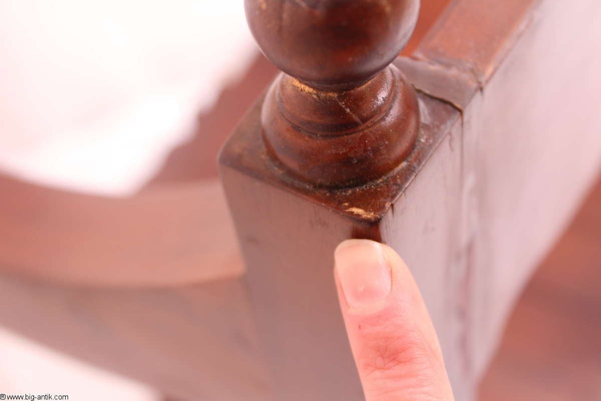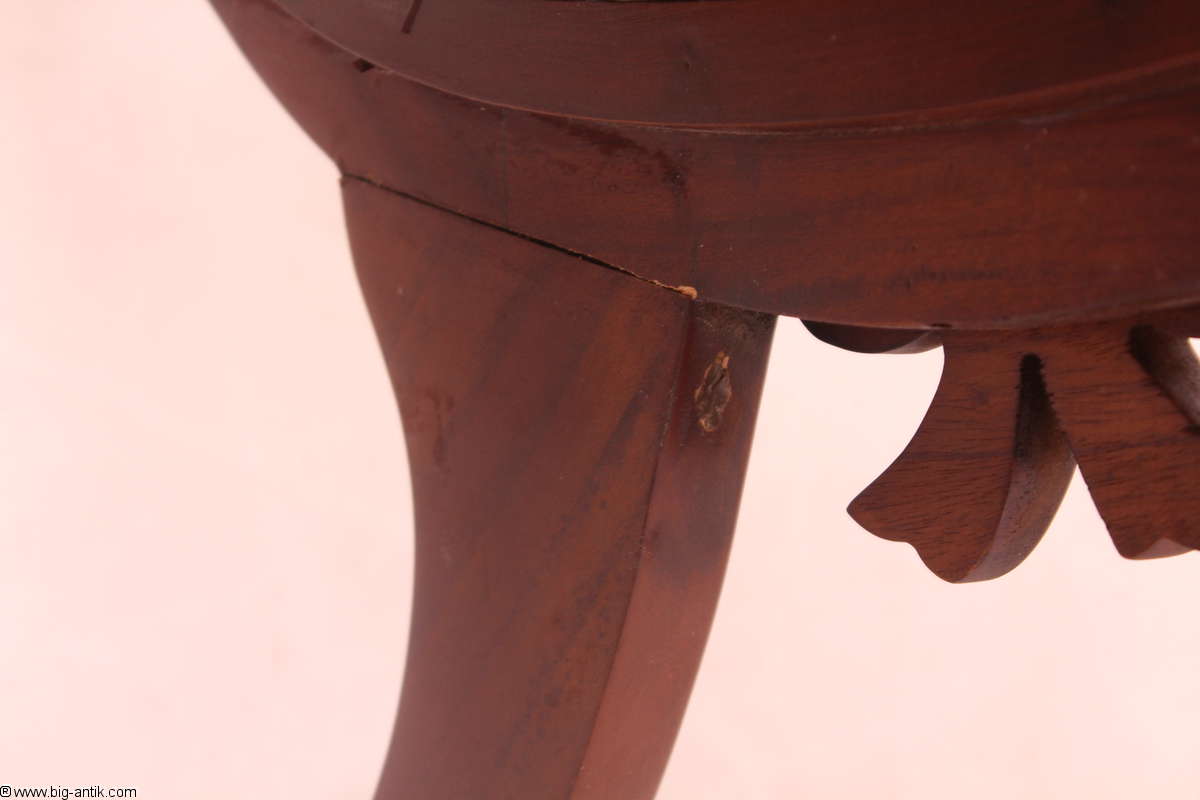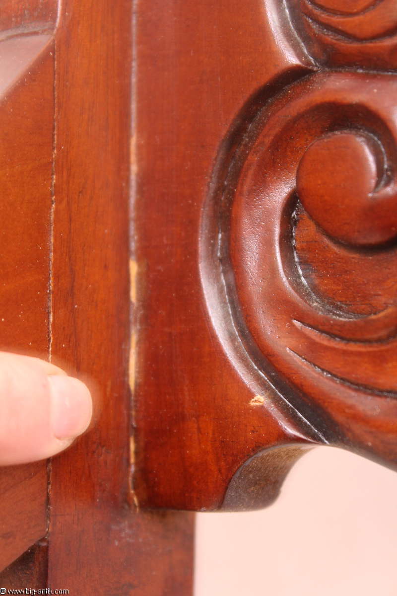 Angeboten wird ein schöner Armlehnenstuhl / Römer Stuhl / Thronstuhl / Scherenstuhl aus massivem Mahagoniholz. Die Rückenlehne ist fantastisch schön geschnitzt und Wappenförmig gestaltet. Die Armlehnen sind leicht geschwungen, die Sitzfläche ist sehr elegant halbrund geformt. Die nach außen gebogenen Beine sind mittels Holzverstrebung miteinander verbunden. Der formschöne Scherenstuhl weist einige Gebrauchsspuren auf u.a wurde der Stuhl an vielen Stellen geleimt, Bruch- bzw. Leimstellen, Kratzer (alles siehe Bilder), dennoch ist der wunderschöne Thronstuhl stabil.