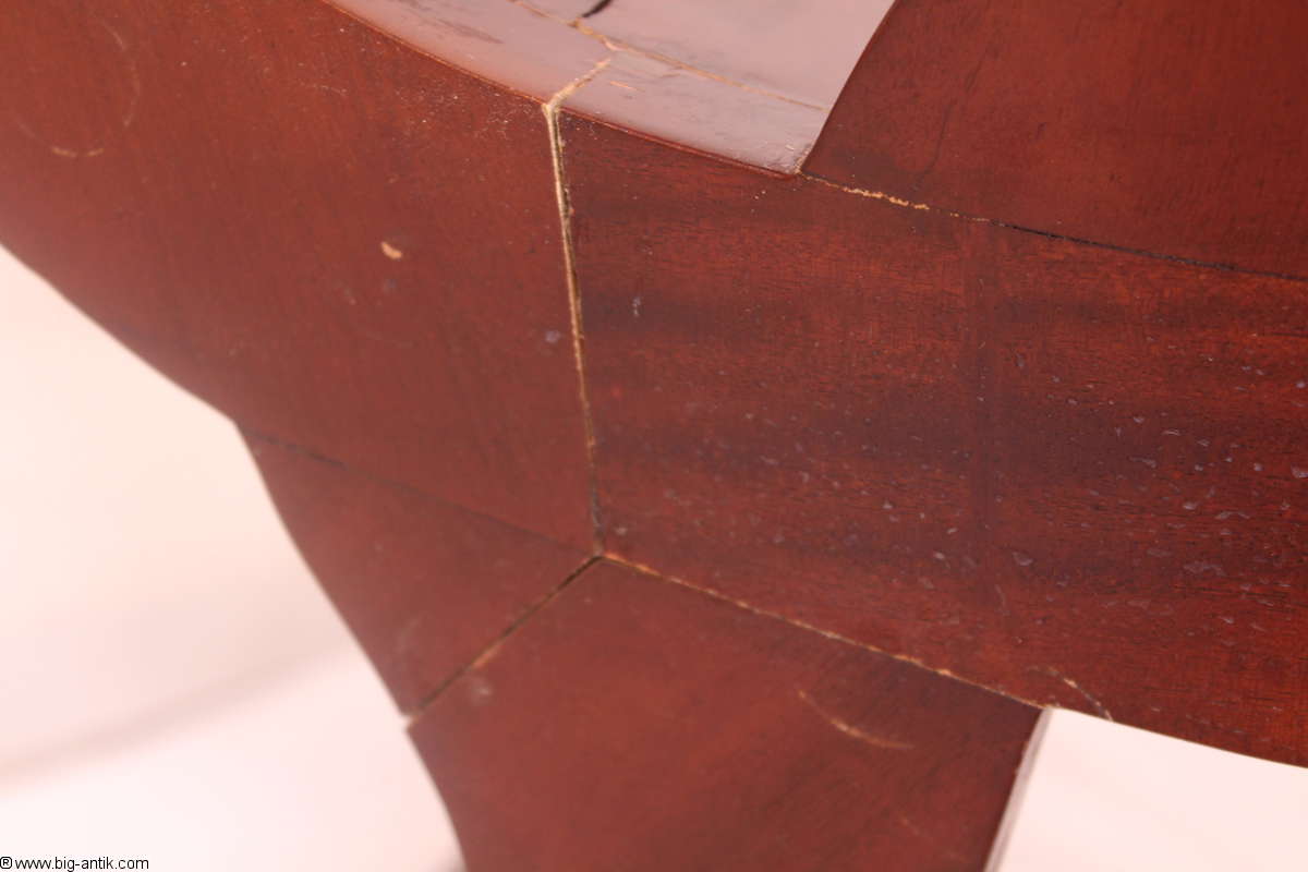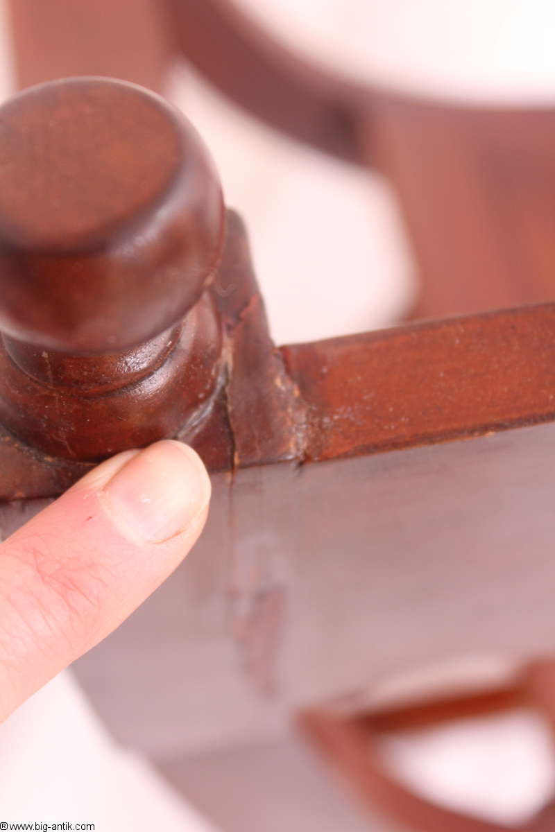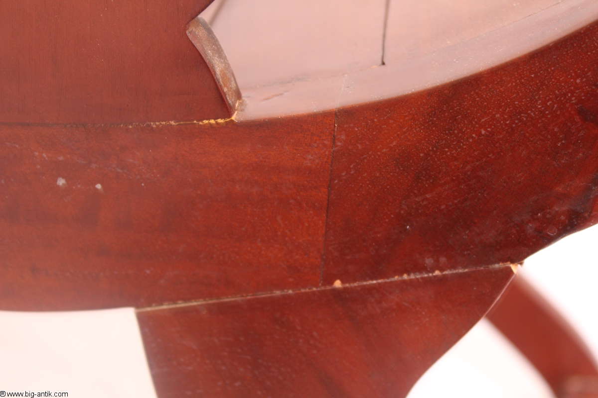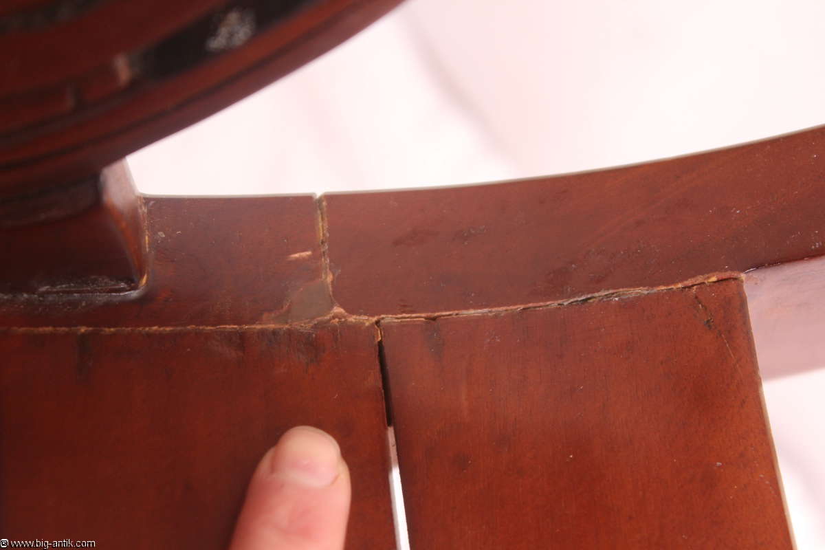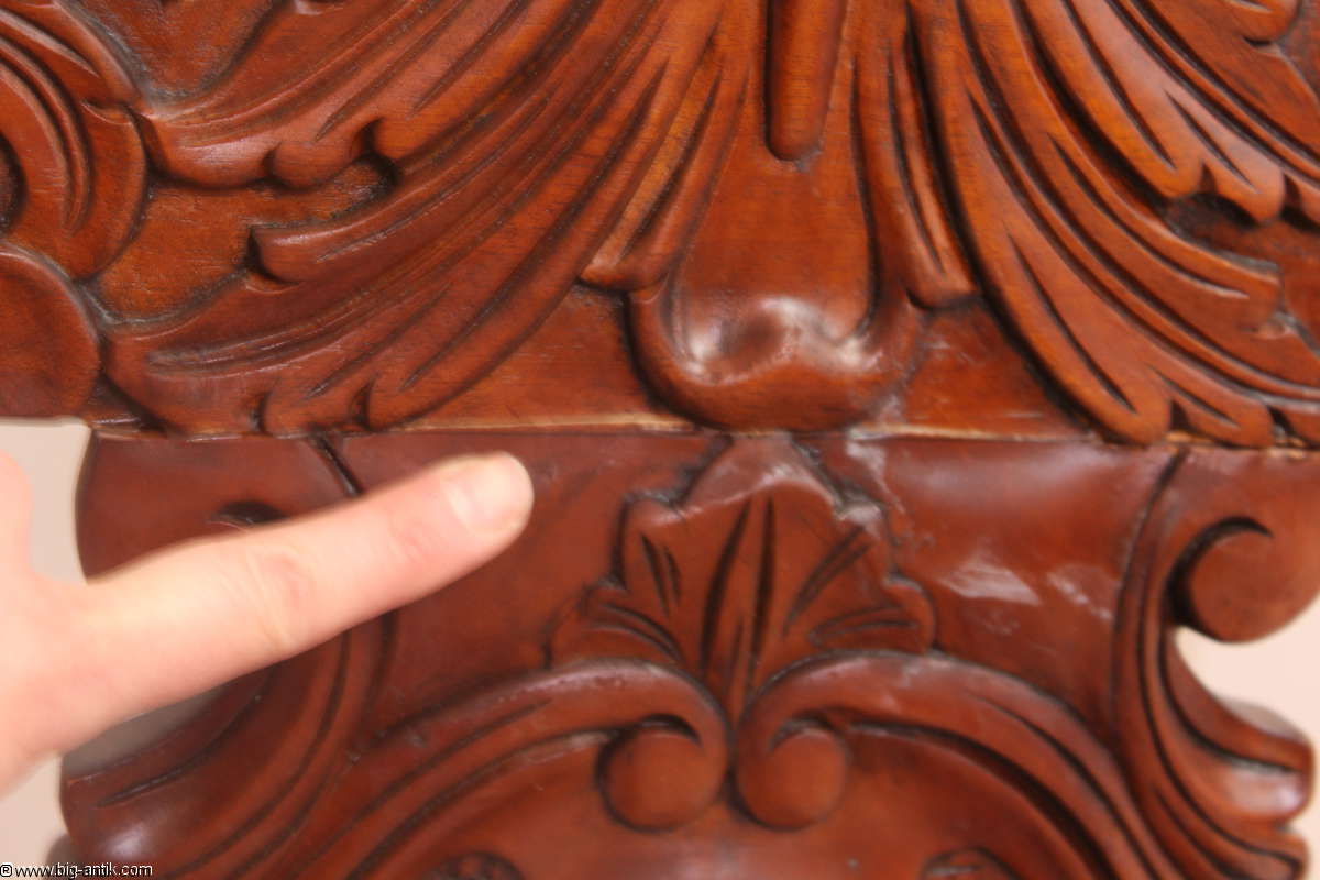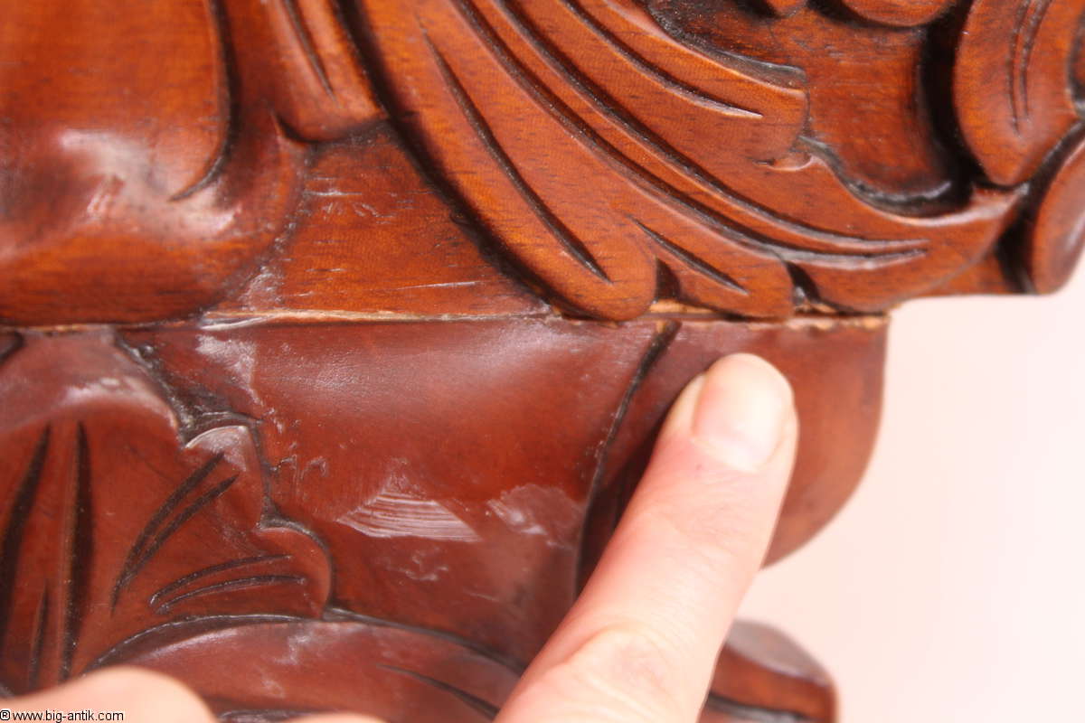 Angeboten wird ein schöner Armlehnenstuhl / Römer Stuhl / Thronstuhl / Scherenstuhl aus massivem Mahagoniholz. Die Rückenlehne ist fantastisch schön geschnitzt und Wappenförmig gestaltet. Die Armlehnen sind leicht geschwungen, die Sitzfläche ist sehr elegant halbrund geformt. Die nach außen gebogenen Beine sind mittels Holzverstrebung miteinander verbunden. Der formschöne Scherenstuhl weist einige Gebrauchsspuren auf u.a wurde der Stuhl an vielen Stellen geleimt, Bruch- bzw. Leimstellen, Kratzer (alles siehe Bilder), dennoch ist der wunderschöne Thronstuhl stabil.