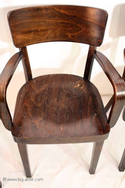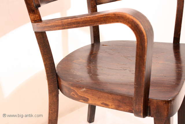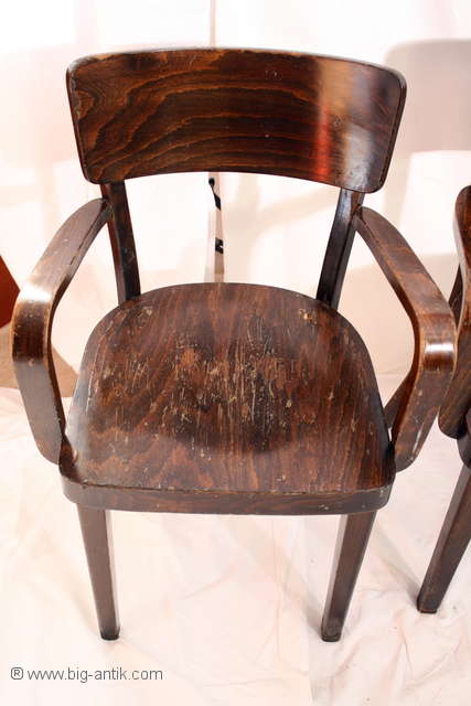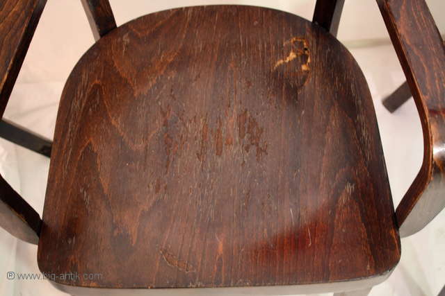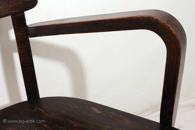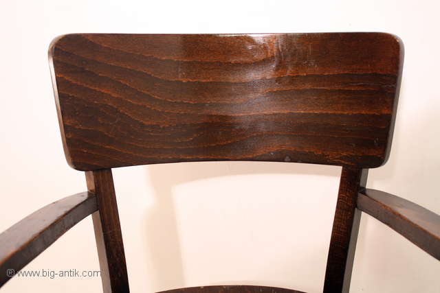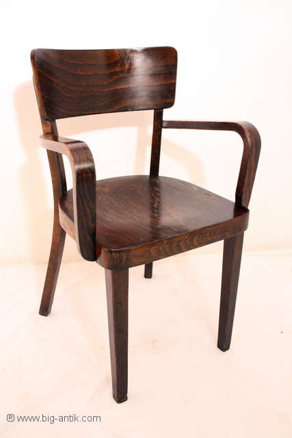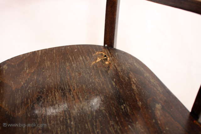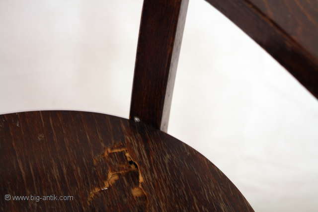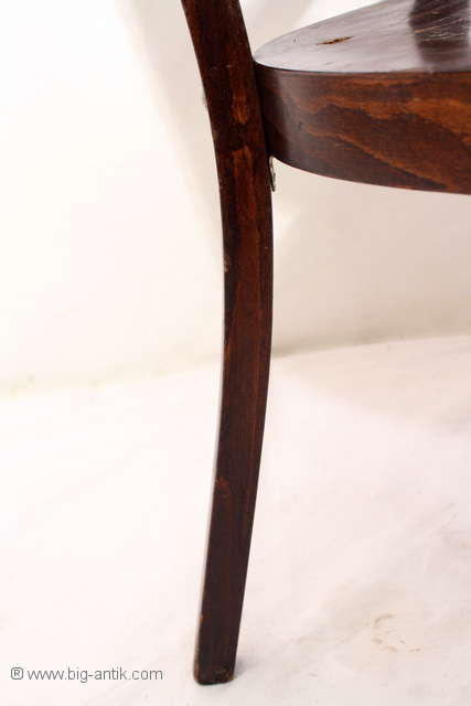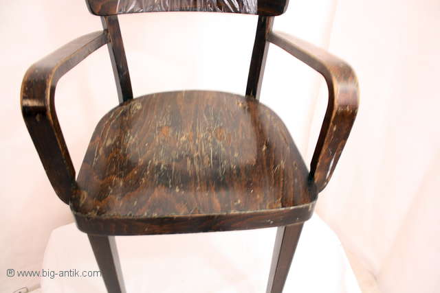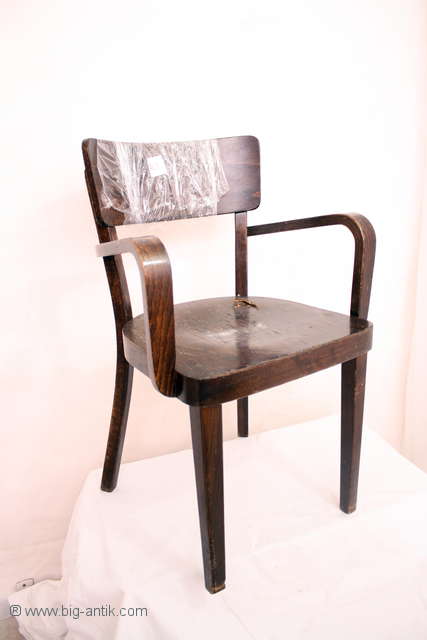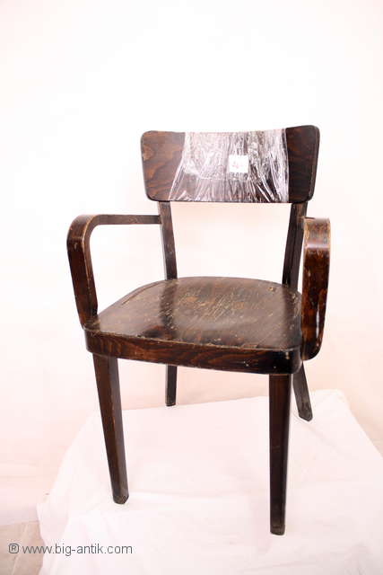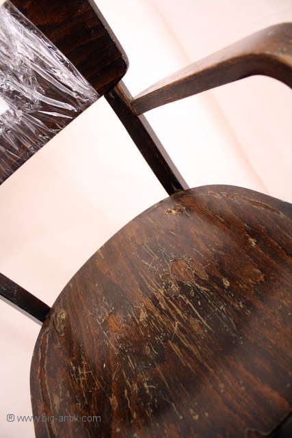 Angeboten wird ein sehr schöner nostalgischer Armlehnensstuhl / Holzstuhl / Bistrostuhl / Kneipenstuhl / Küchenstuhl / Schreibtischstuhl. Die eckigen Sitzfläche und Rückenlehne sind an den Kanten leicht abgerundet. Die Armlehnen sehr schön geformt. Das Holz ist in Palisander gebeizt. Am schönen Stuhl sind viele Gebrauchsspuren vorhanden u.a. Farbe ist an einigen Stellen abgeblättert, die Sitzfläche ist beschädigt und muss geflickt oder ersetzt werden (siehe Bilder) die Beine und Armlehnen sind z.T. wackelig. Der schöne Stuhl wir zum Aufarbeiten angeboten. Wir haben ca. 2 ähnliche Stühle im Angebot.