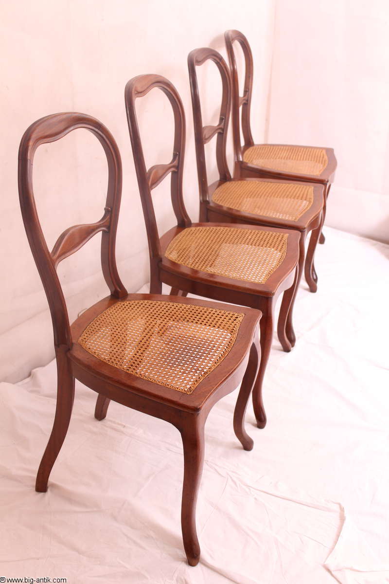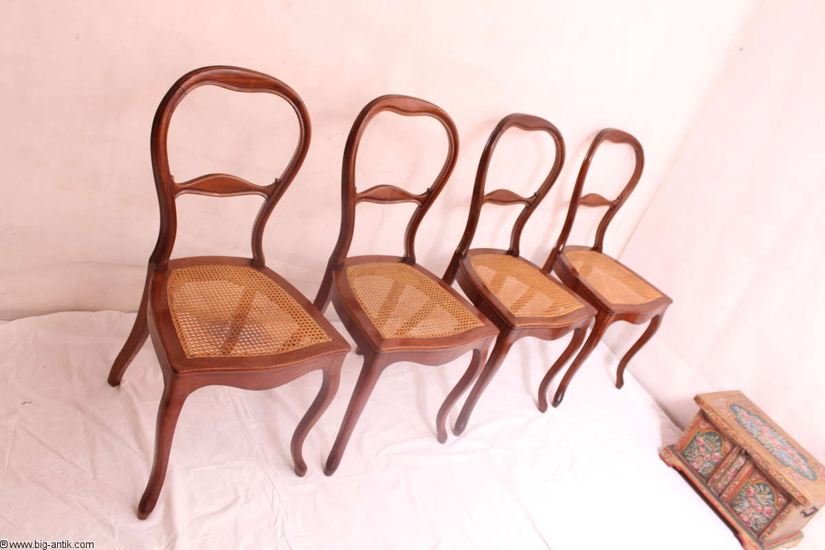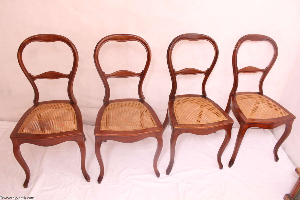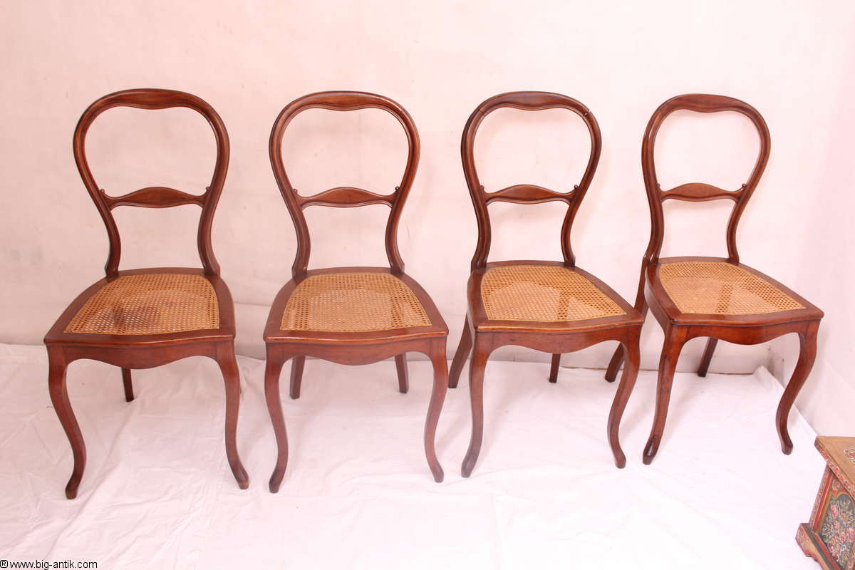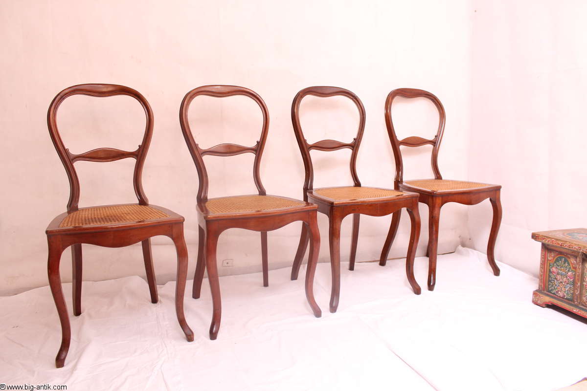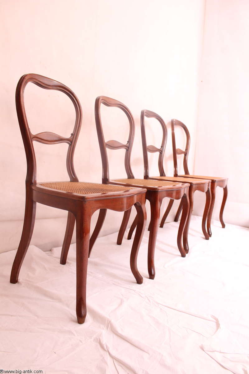 Angeboten werden 4 zauberhafte antike Biedermeier Stühle / Holzstühle / Medaillon Stühle / Salonstühle / Stühle aus massivem Nussbaumholz. Die formschönen Stühle besitzen eine geschwungene Rückenlehne, die Beine sind ebenfalls elegant geschwungen. Die Sitzflächen sind aus Geflecht gespannt. Die antiken Stühle weisen hier und da Gebrauchsspuren auf u.a. leichte Kratzer, Stoßstellen, 1 Stuhl leicht wackelig, kleine Risse im Holz (siehe Bilder), ansonsten befinden sich die wunderschönen Biedermeier Stühle in einem guten gebrauchten Zustand.