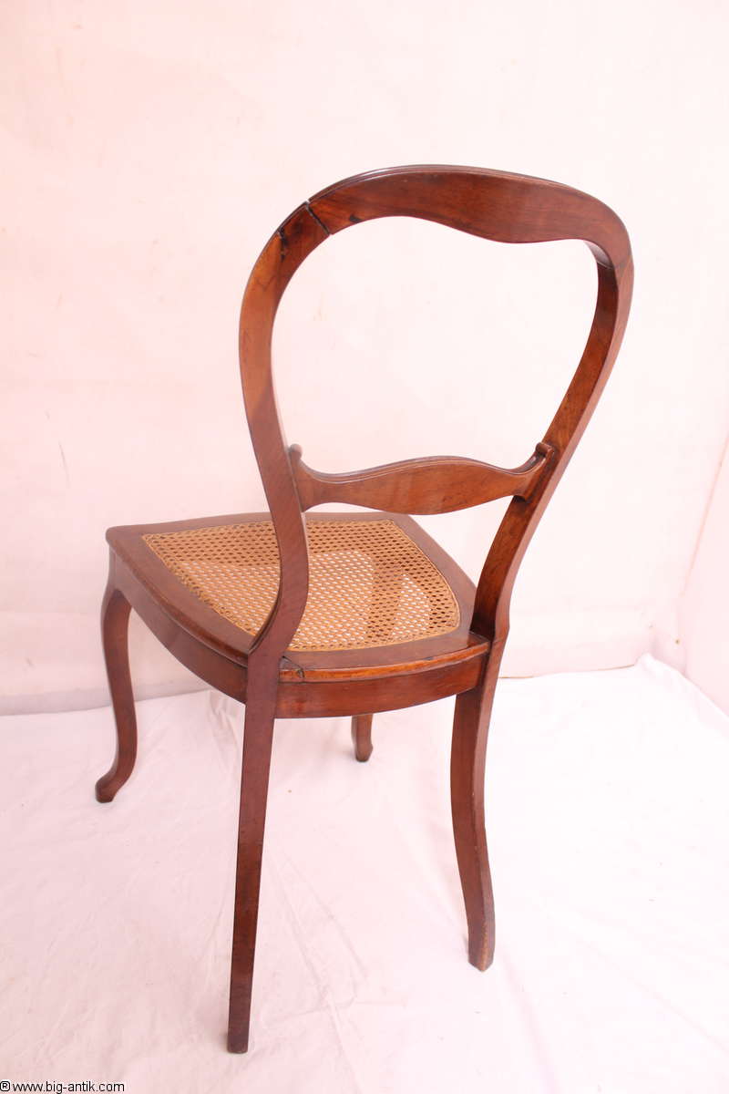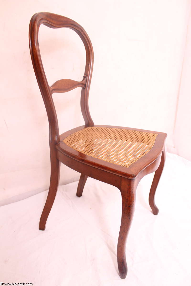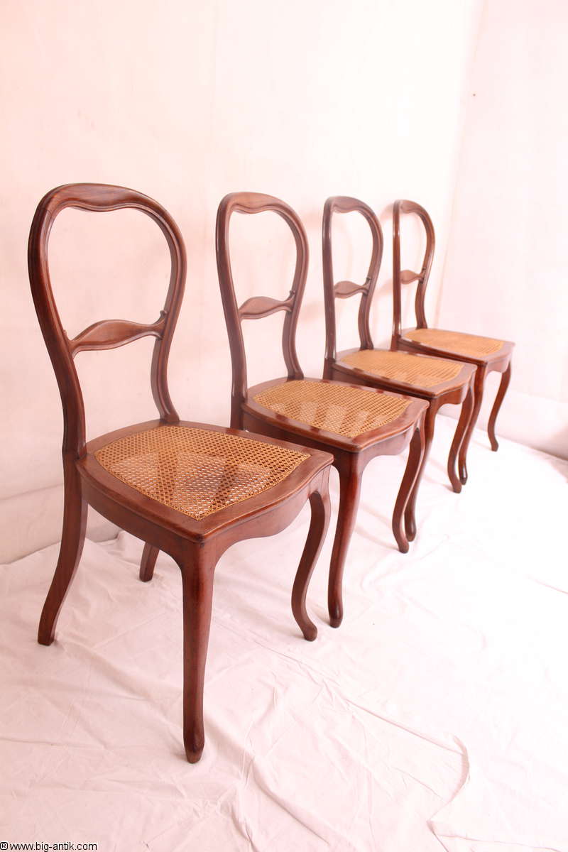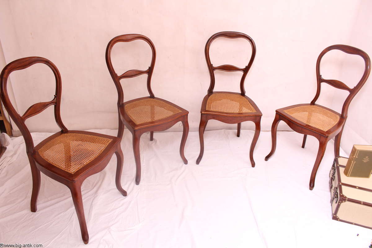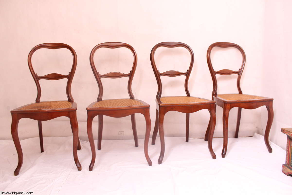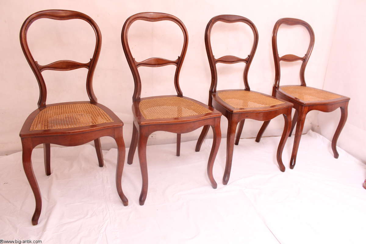 Angeboten werden 4 zauberhafte antike Biedermeier Stühle / Holzstühle / Medaillon Stühle / Salonstühle / Stühle aus massivem Nussbaumholz. Die formschönen Stühle besitzen eine geschwungene Rückenlehne, die Beine sind ebenfalls elegant geschwungen. Die Sitzflächen sind aus Geflecht gespannt. Die antiken Stühle weisen hier und da Gebrauchsspuren auf u.a. leichte Kratzer, Stoßstellen, 1 Stuhl leicht wackelig, kleine Risse im Holz (siehe Bilder), ansonsten befinden sich die wunderschönen Biedermeier Stühle in einem guten gebrauchten Zustand.