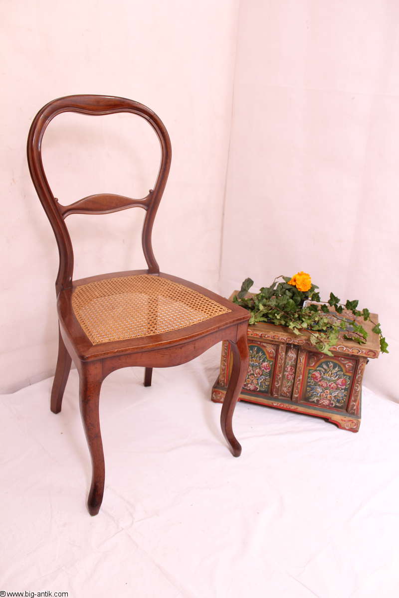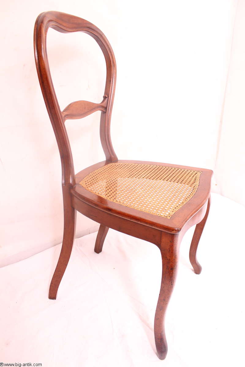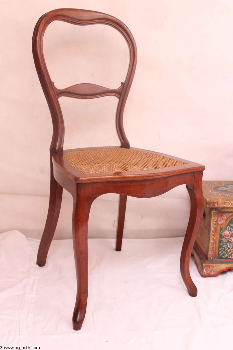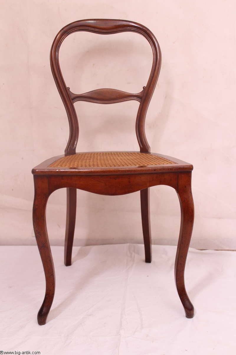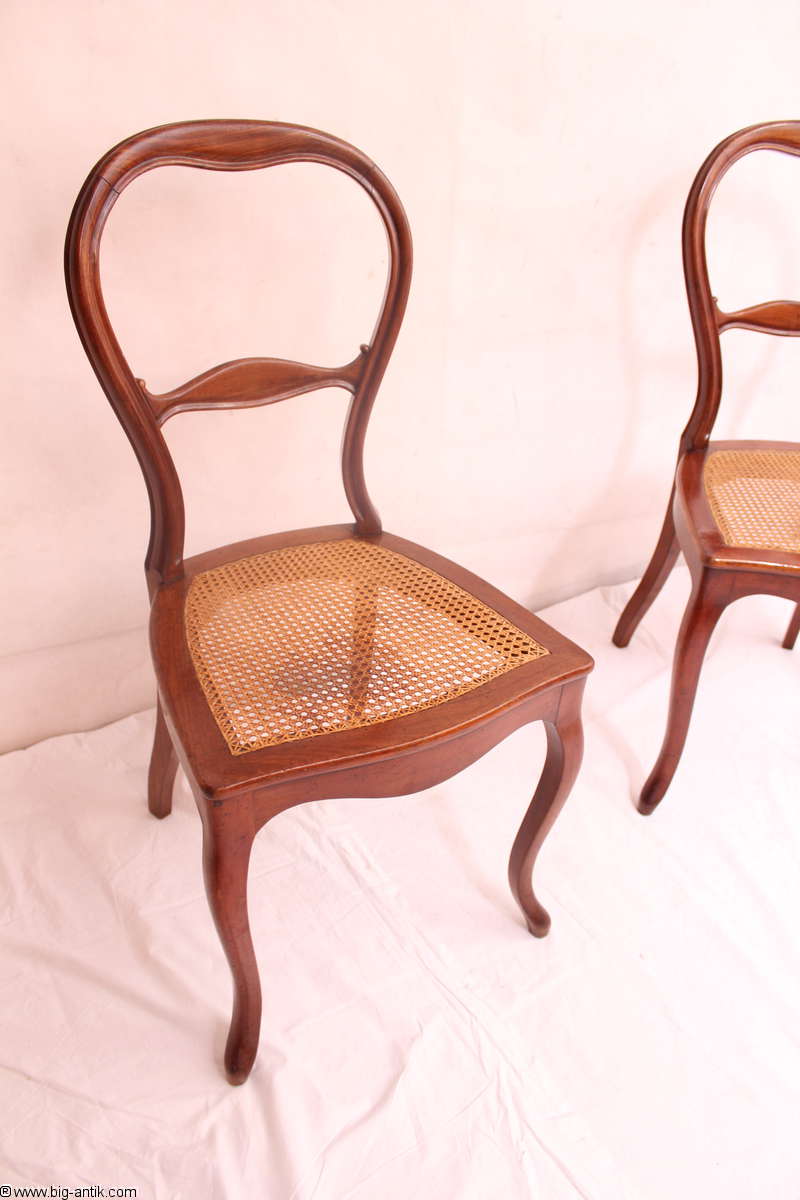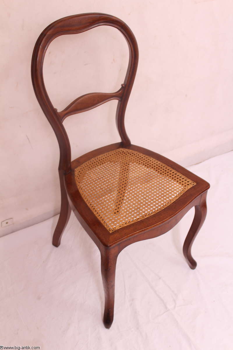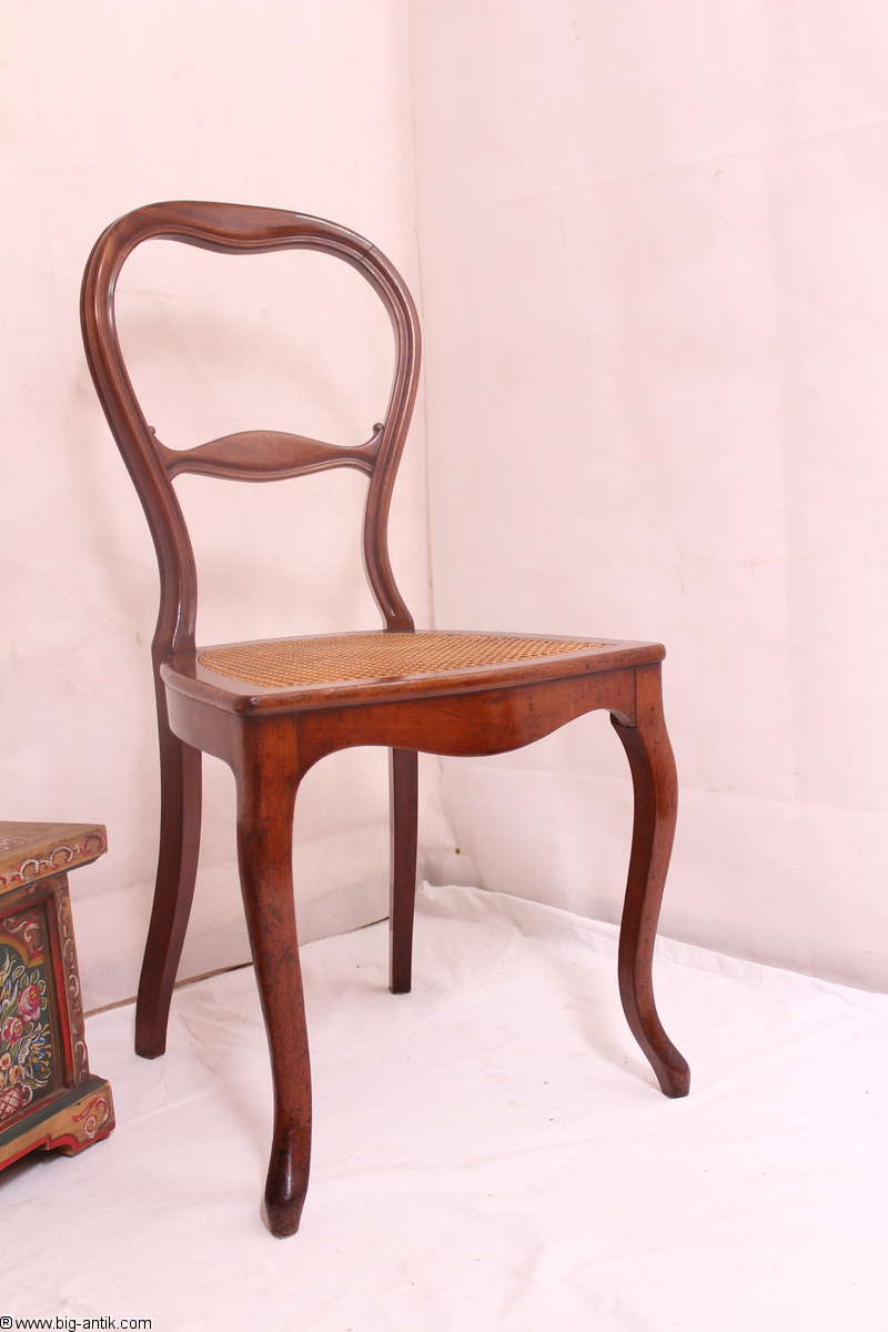 Angeboten werden 4 zauberhafte antike Biedermeier Stühle / Holzstühle / Medaillon Stühle / Salonstühle / Stühle aus massivem Nussbaumholz. Die formschönen Stühle besitzen eine geschwungene Rückenlehne, die Beine sind ebenfalls elegant geschwungen. Die Sitzflächen sind aus Geflecht gespannt. Die antiken Stühle weisen hier und da Gebrauchsspuren auf u.a. leichte Kratzer, Stoßstellen, 1 Stuhl leicht wackelig, kleine Risse im Holz (siehe Bilder), ansonsten befinden sich die wunderschönen Biedermeier Stühle in einem guten gebrauchten Zustand.
