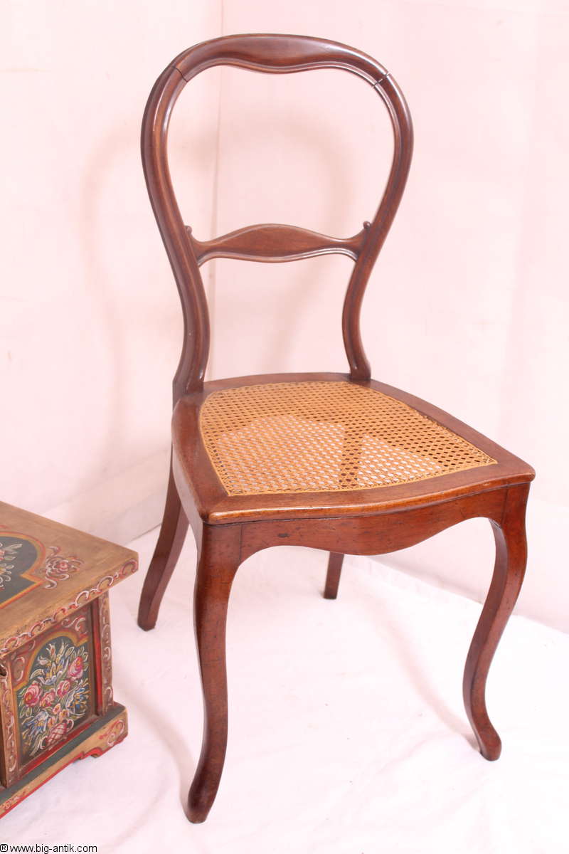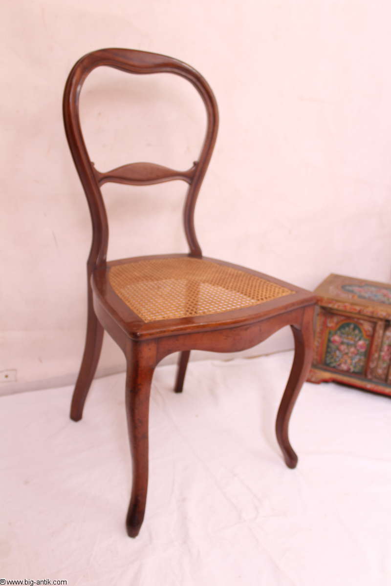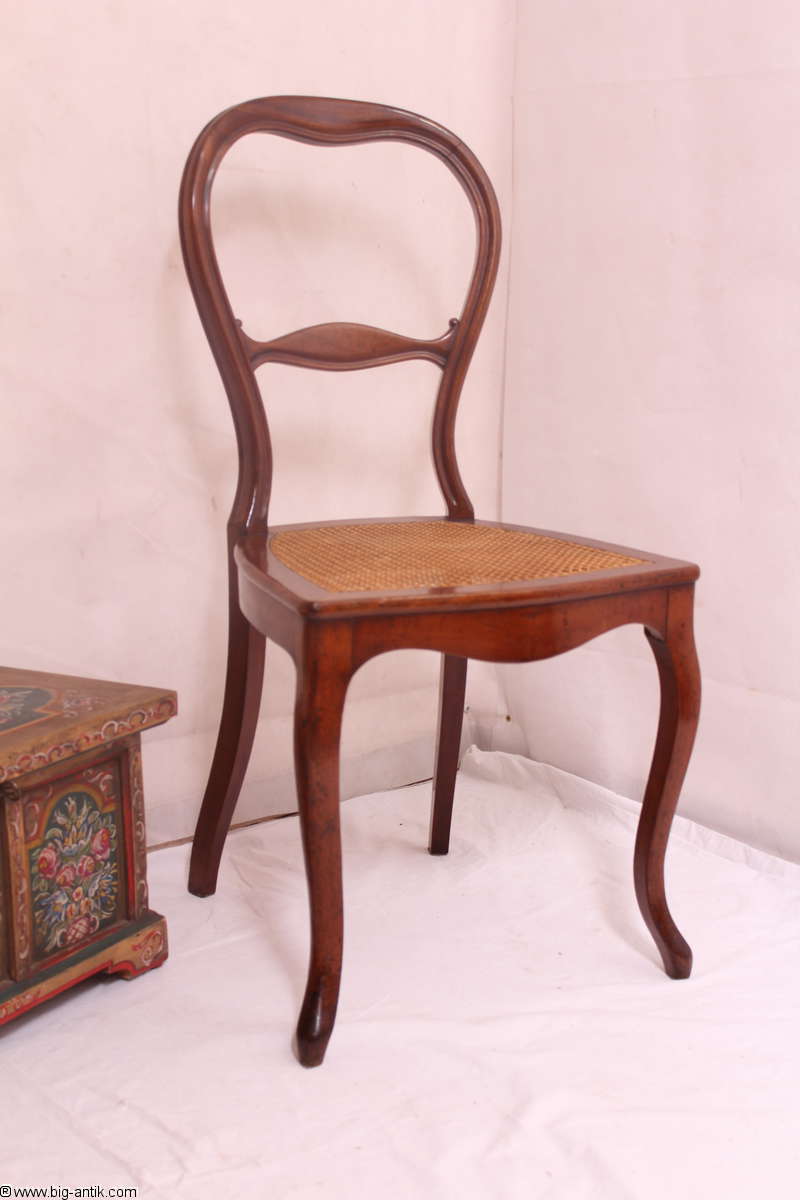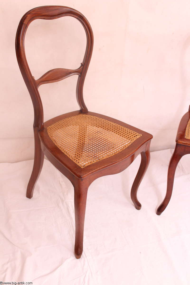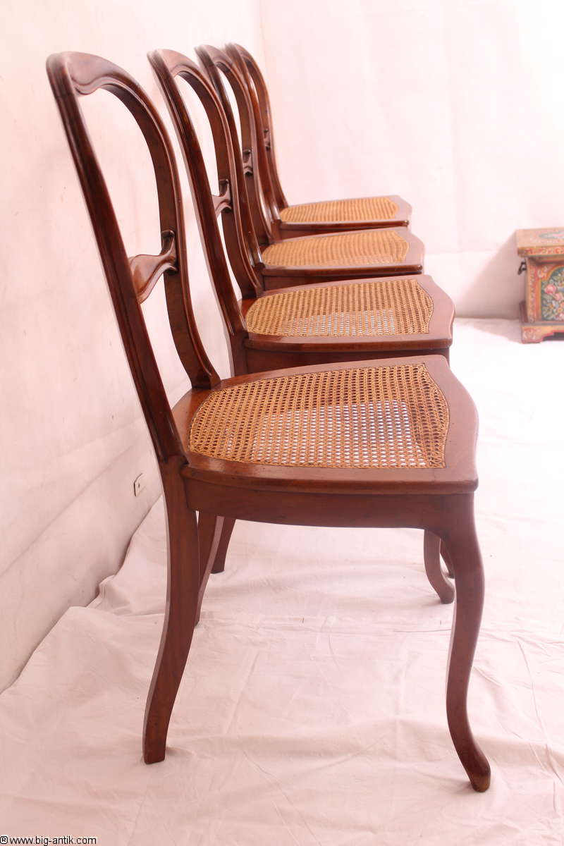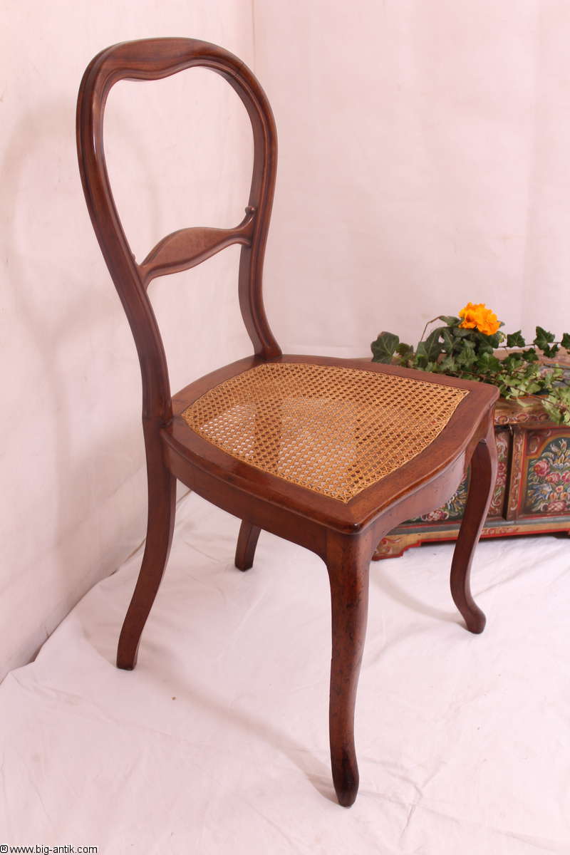 Angeboten werden 4 zauberhafte antike Biedermeier Stühle / Holzstühle / Medaillon Stühle / Salonstühle / Stühle aus massivem Nussbaumholz. Die formschönen Stühle besitzen eine geschwungene Rückenlehne, die Beine sind ebenfalls elegant geschwungen. Die Sitzflächen sind aus Geflecht gespannt. Die antiken Stühle weisen hier und da Gebrauchsspuren auf u.a. leichte Kratzer, Stoßstellen, 1 Stuhl leicht wackelig, kleine Risse im Holz (siehe Bilder), ansonsten befinden sich die wunderschönen Biedermeier Stühle in einem guten gebrauchten Zustand.