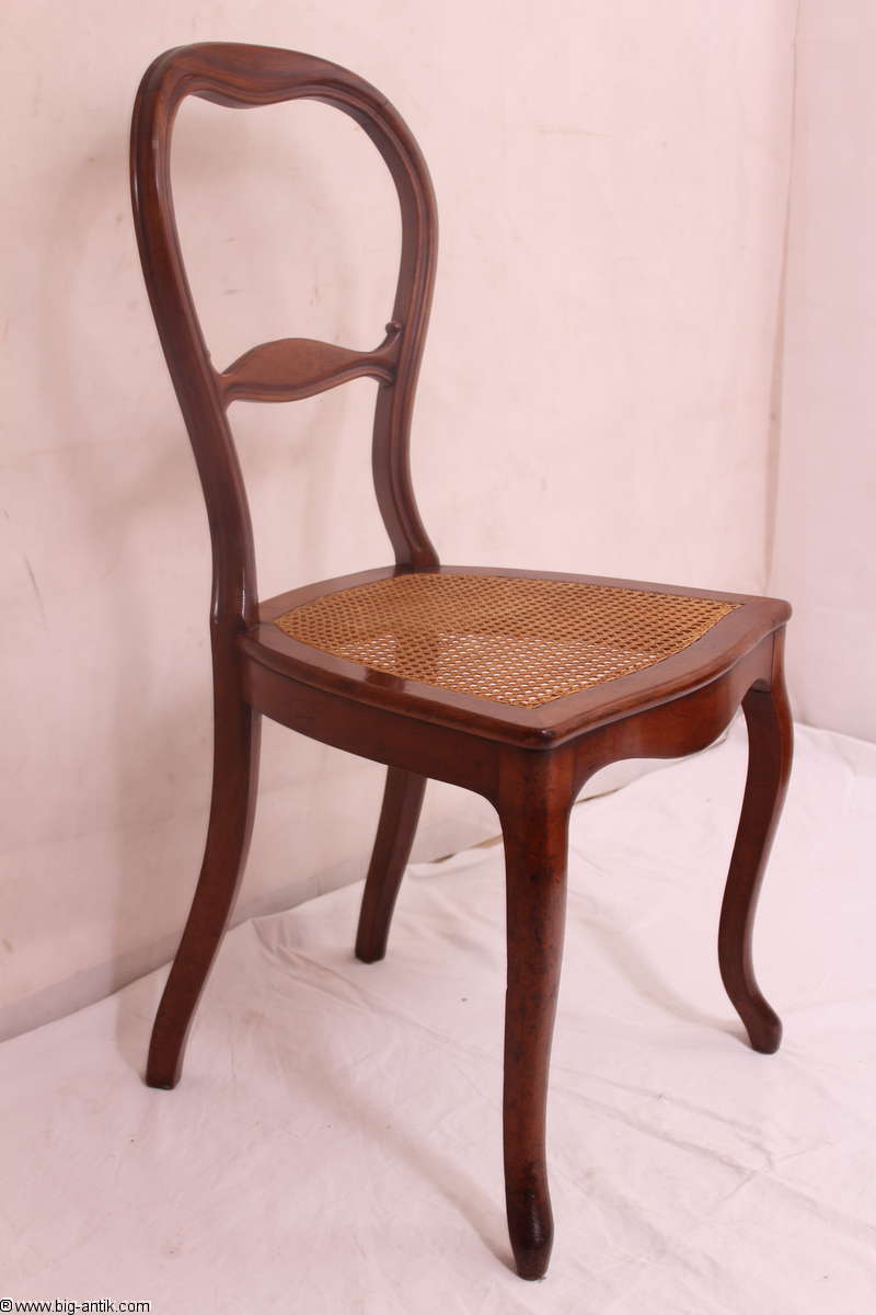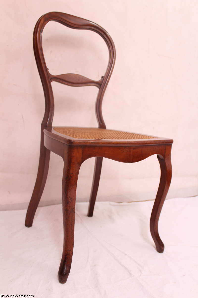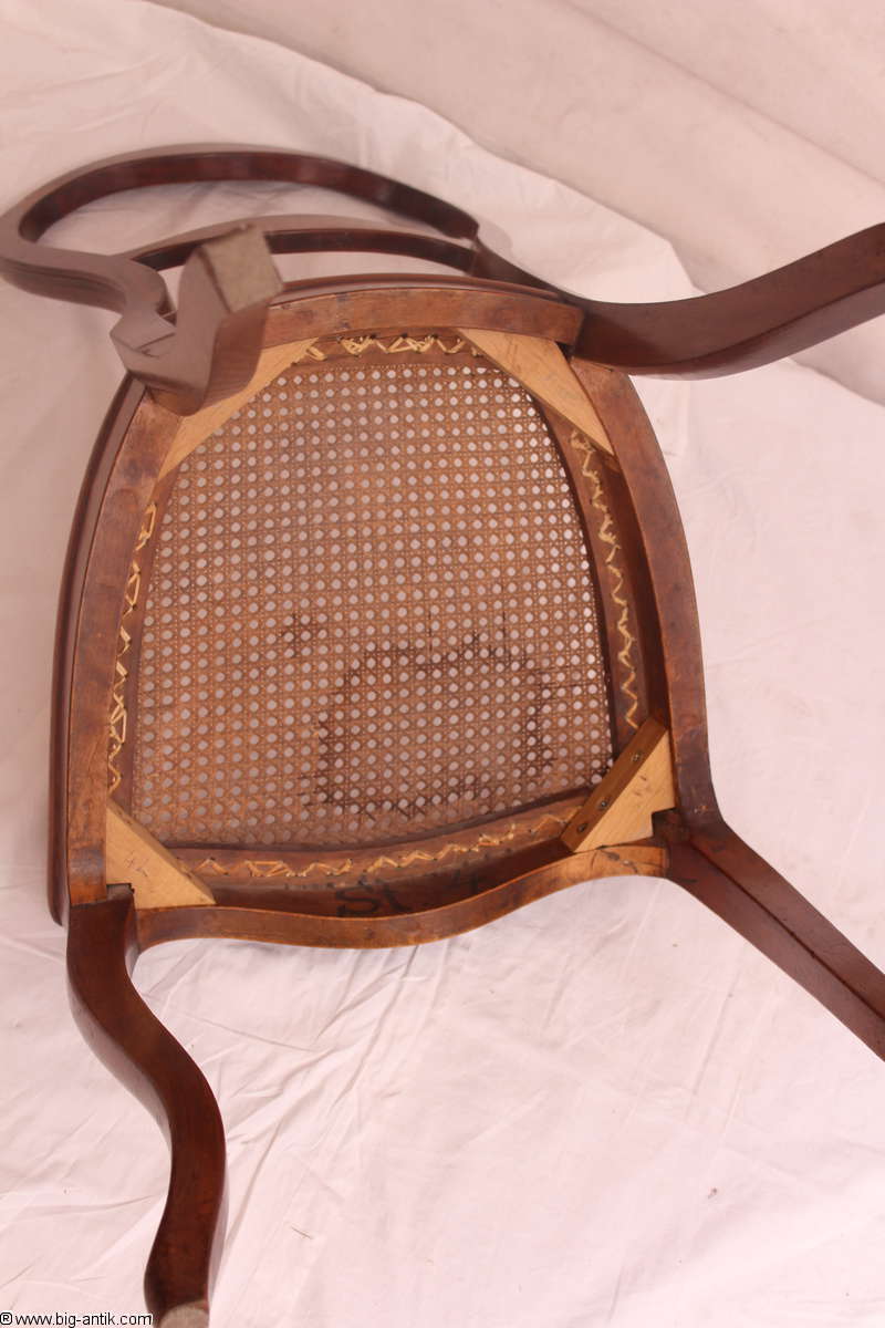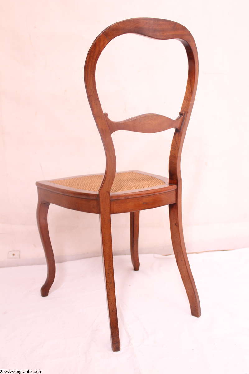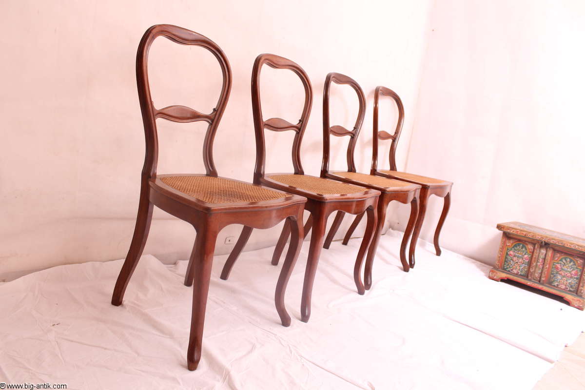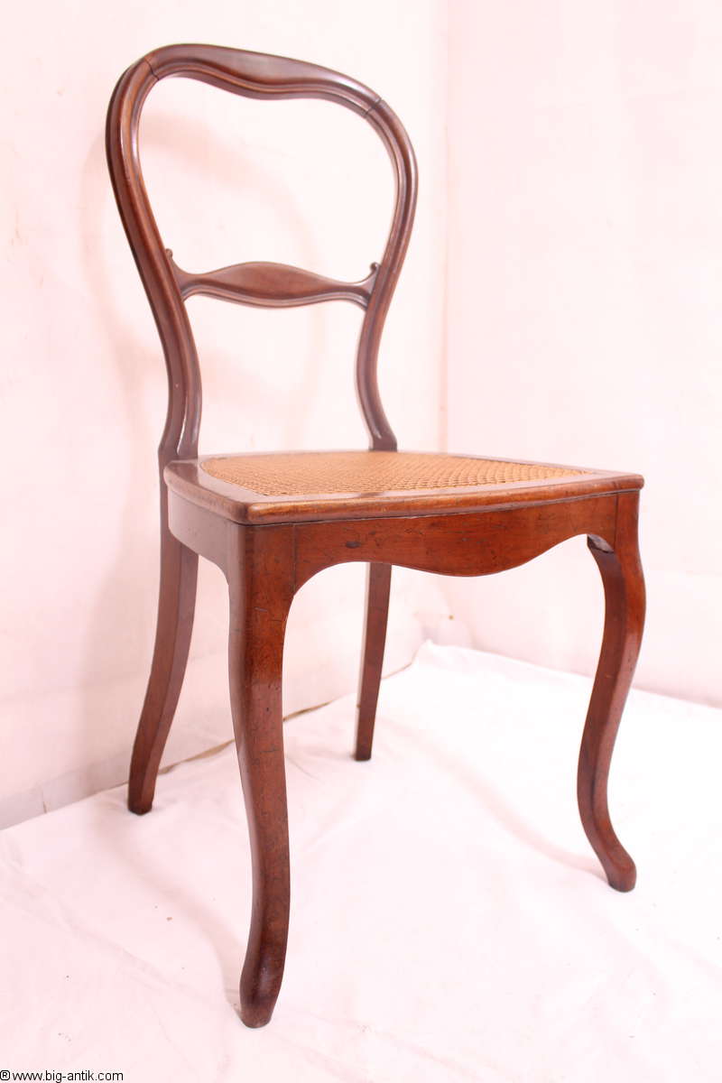Angeboten werden 4 zauberhafte antike Biedermeier Stühle / Holzstühle / Medaillon Stühle / Salonstühle / Stühle aus massivem Nussbaumholz. Die formschönen Stühle besitzen eine geschwungene Rückenlehne, die Beine sind ebenfalls elegant geschwungen. Die Sitzflächen sind aus Geflecht gespannt. Die antiken Stühle weisen hier und da Gebrauchsspuren auf u.a. leichte Kratzer, Stoßstellen, 1 Stuhl leicht wackelig, kleine Risse im Holz (siehe Bilder), ansonsten befinden sich die wunderschönen Biedermeier Stühle in einem guten gebrauchten Zustand.