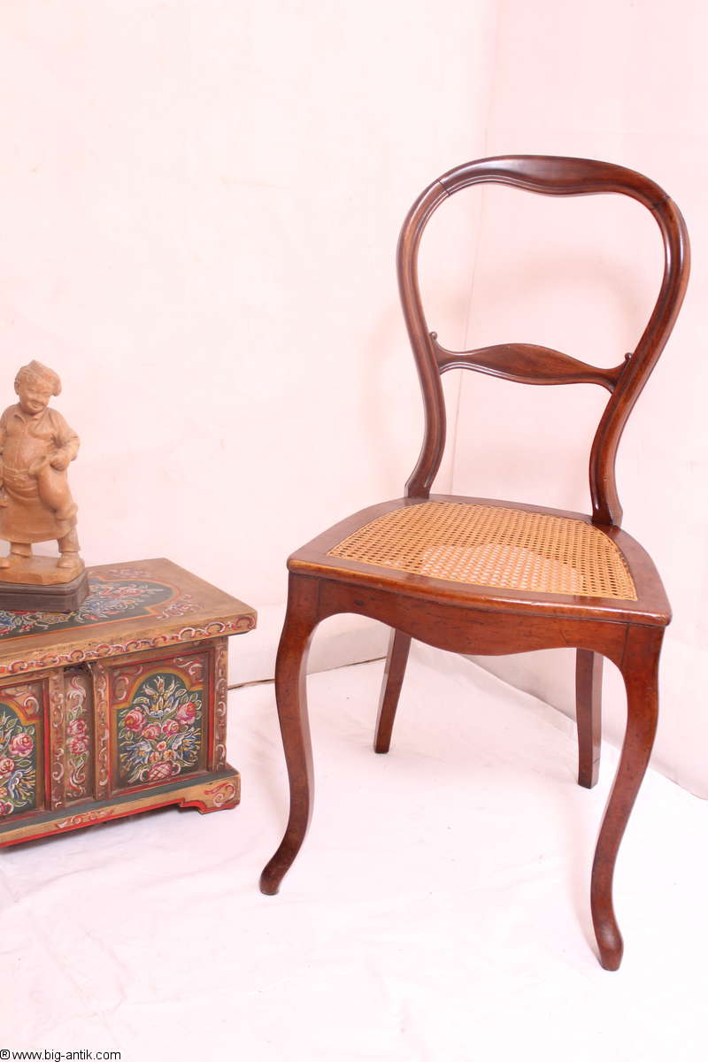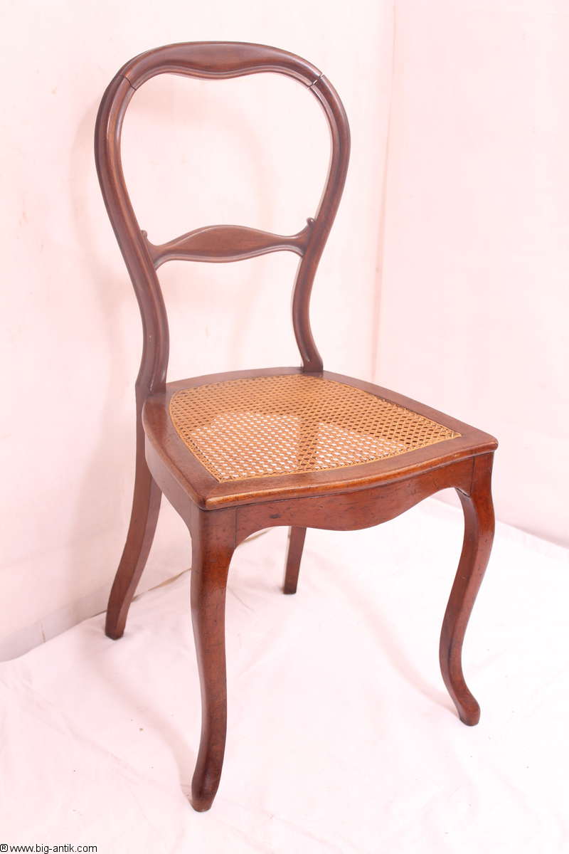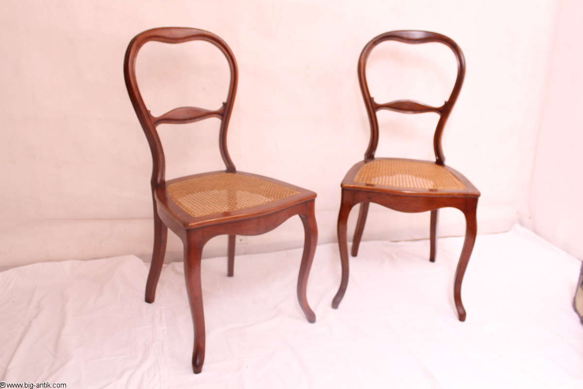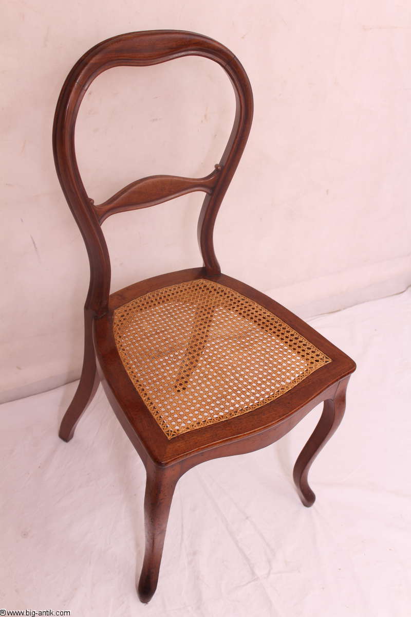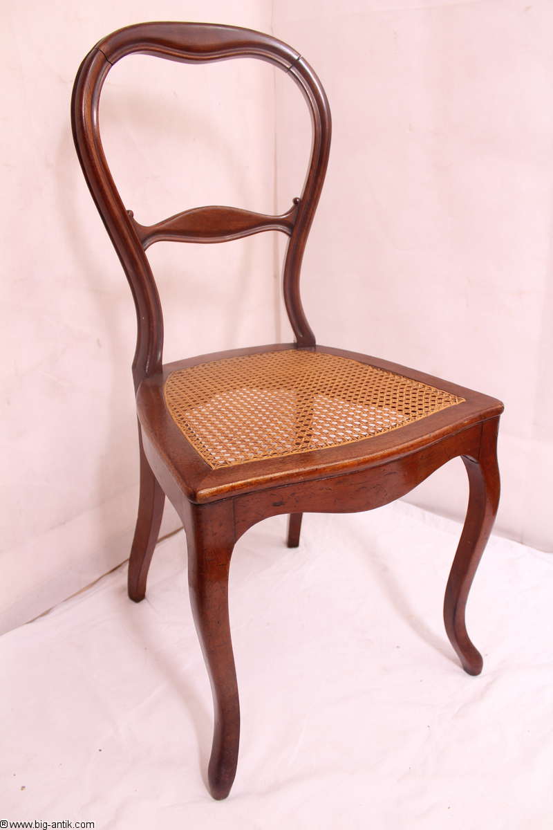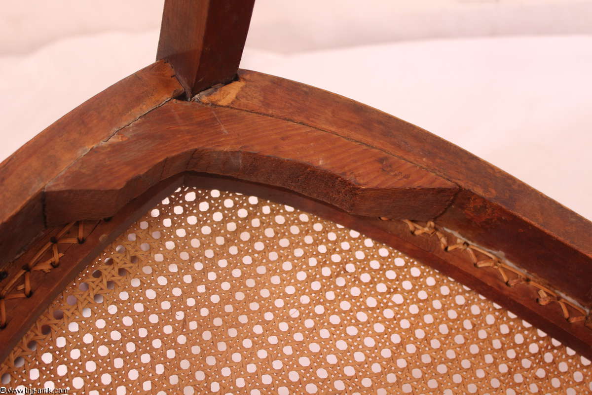 Angeboten werden 4 zauberhafte antike Biedermeier Stühle / Holzstühle / Medaillon Stühle / Salonstühle / Stühle aus massivem Nussbaumholz. Die formschönen Stühle besitzen eine geschwungene Rückenlehne, die Beine sind ebenfalls elegant geschwungen. Die Sitzflächen sind aus Geflecht gespannt. Die antiken Stühle weisen hier und da Gebrauchsspuren auf u.a. leichte Kratzer, Stoßstellen, 1 Stuhl leicht wackelig, kleine Risse im Holz (siehe Bilder), ansonsten befinden sich die wunderschönen Biedermeier Stühle in einem guten gebrauchten Zustand.