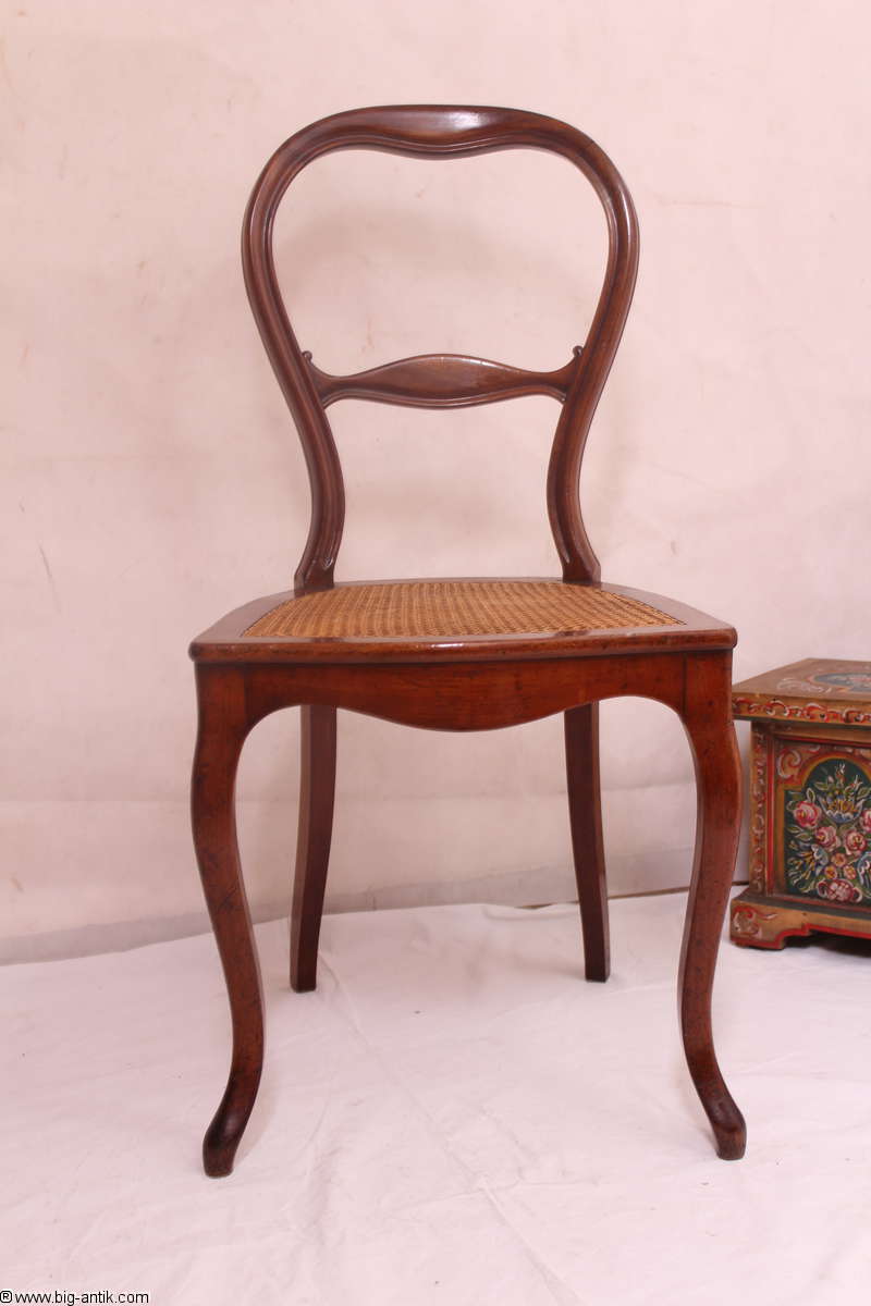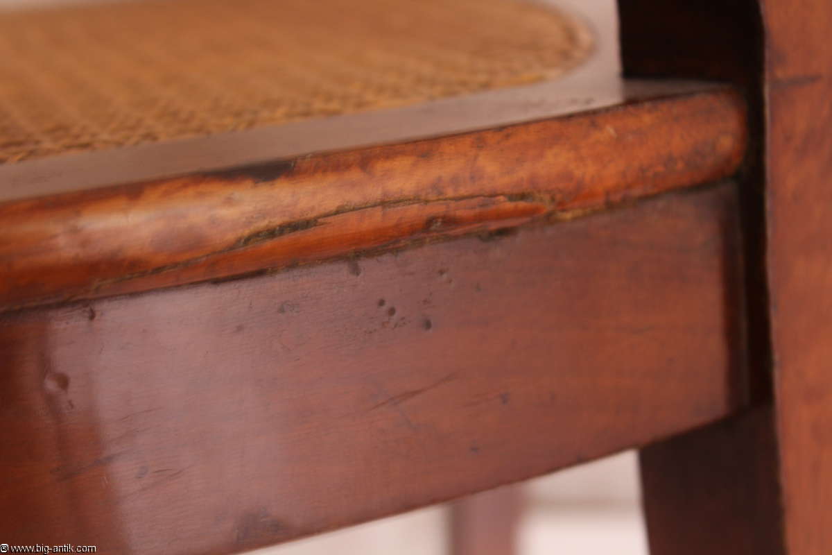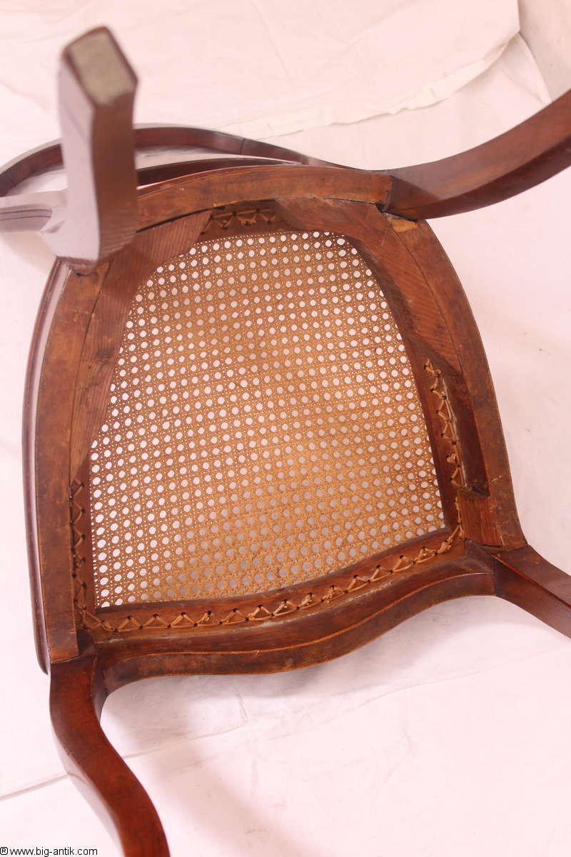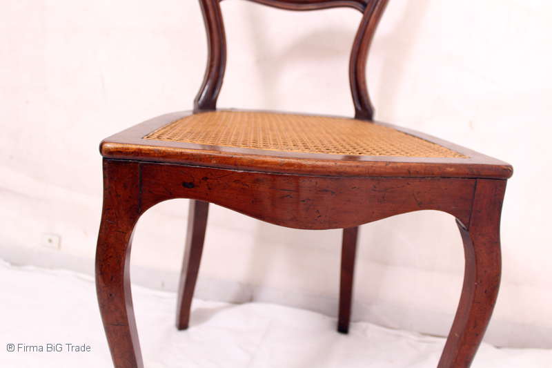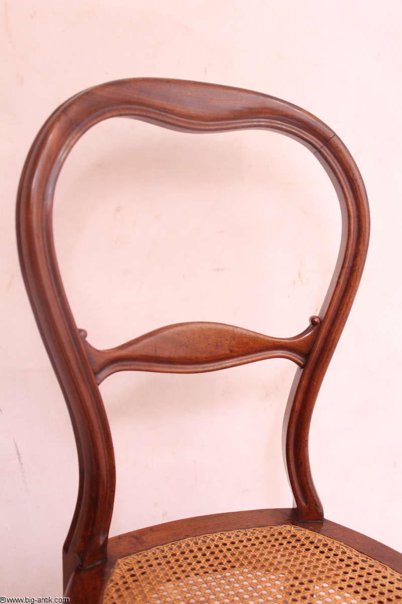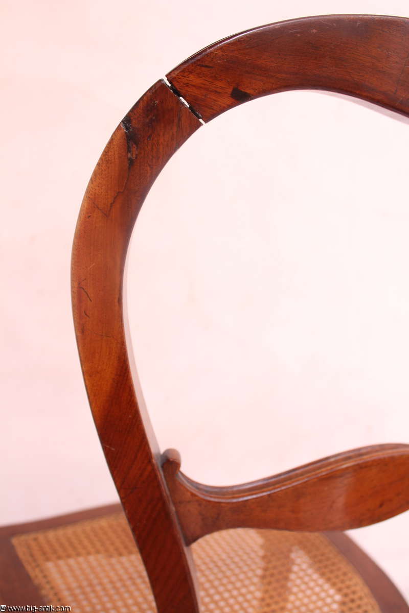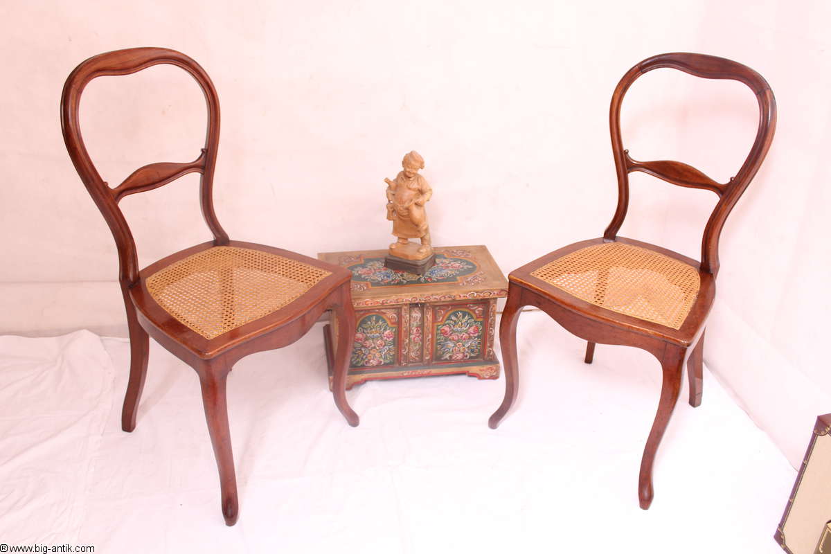 Angeboten werden 4 zauberhafte antike Biedermeier Stühle / Holzstühle / Medaillon Stühle / Salonstühle / Stühle aus massivem Nussbaumholz. Die formschönen Stühle besitzen eine geschwungene Rückenlehne, die Beine sind ebenfalls elegant geschwungen. Die Sitzflächen sind aus Geflecht gespannt. Die antiken Stühle weisen hier und da Gebrauchsspuren auf u.a. leichte Kratzer, Stoßstellen, 1 Stuhl leicht wackelig, kleine Risse im Holz (siehe Bilder), ansonsten befinden sich die wunderschönen Biedermeier Stühle in einem guten gebrauchten Zustand.