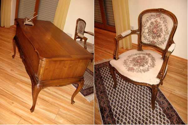 Angeboen wird ein sehr Chippendale Schreibtisch aus Nußbaumholz. Der schöne Schreibtisch ist an den Beinen und Kannten sehr schön geschnitzt. Er hat 5 schöne geräumige Schuladen. Alle Schlüssel sind vorhanden. Dazu gibt es auch ein passender Armlehnenstuhl im gleichen Stil mit schönen geschnitzt Beinen und Lehnen. Der Stof des Stuhl weist einen kleinen Stoffschaden aus (siehe Bilder). Ansonsten sind die beiden Möbel in einem sehr guten und wohnfertigen Zustand.