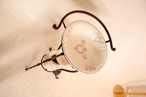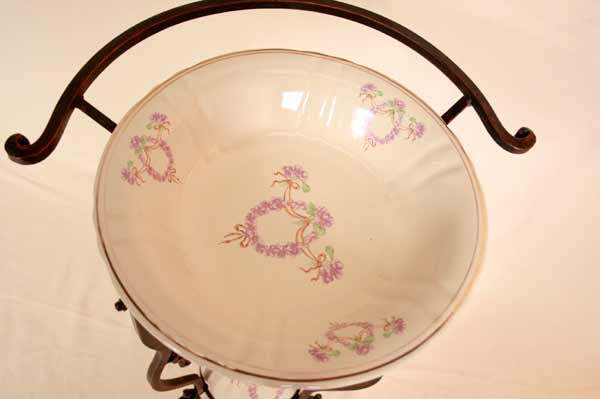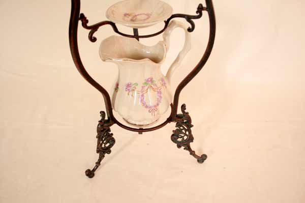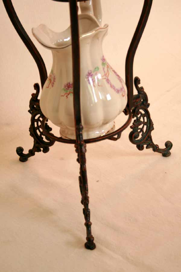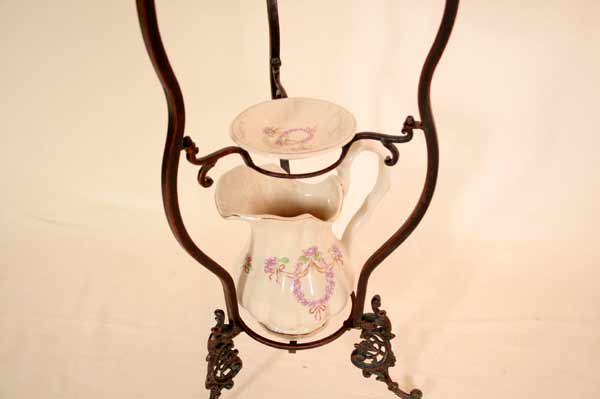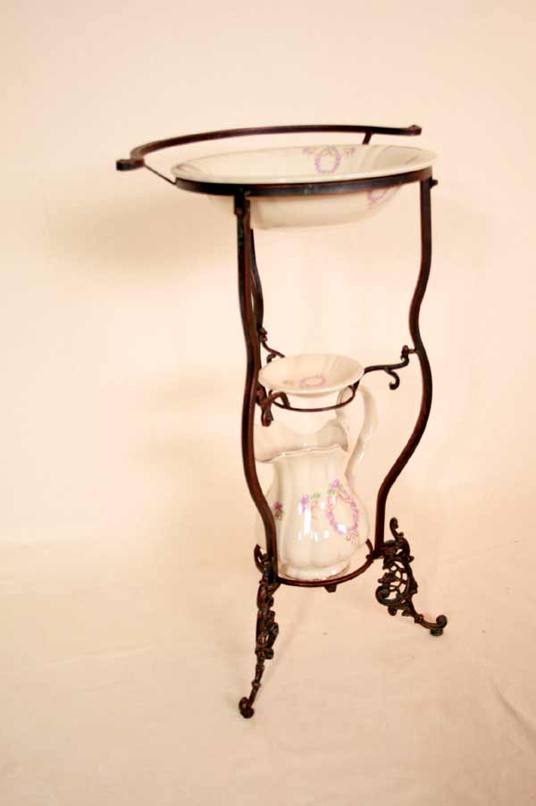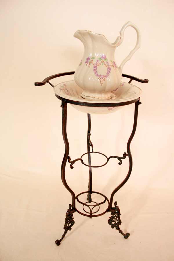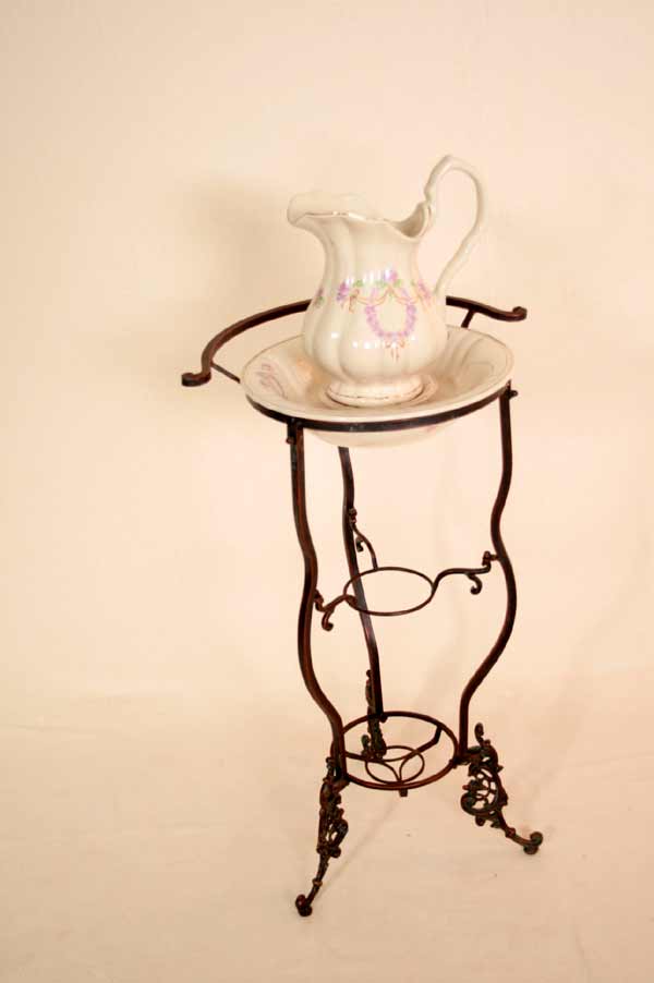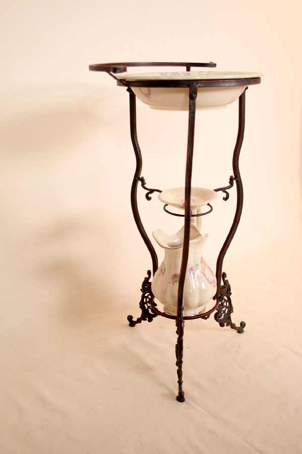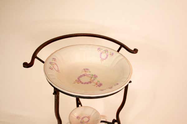 Angeboten wird ein wunderschöner und ausgefallener sehr edler und runder Waschtisch / Wasch Set im antiken Stil. Der schön verzierter Waschtisch ist aus Schmiedeeisen traumhaft patiniert und mit vielen Details verziert. Dazu wird ein fünfteiliges Porzellan Wasch Set wie abgebildet geliefert (der Nachtopf und der Seifen- oder Bürstenbehälter sind auch dabei!).
