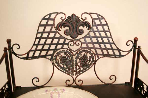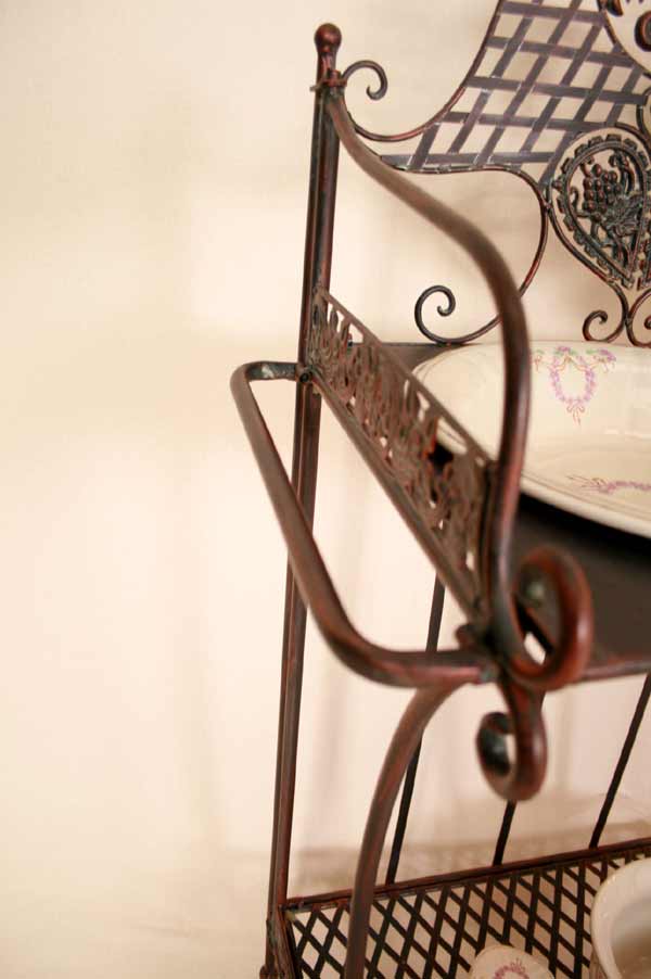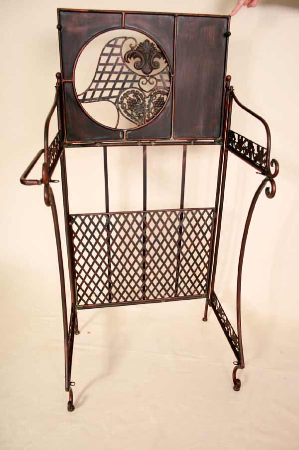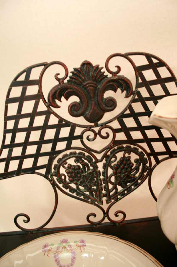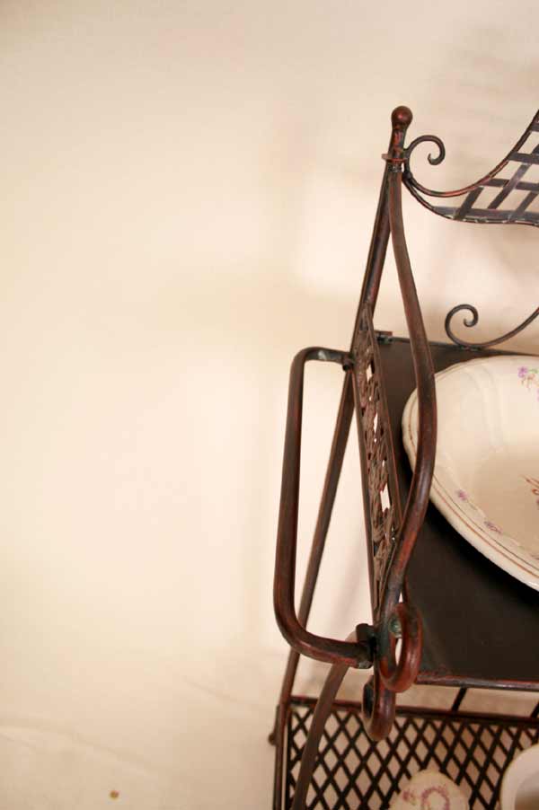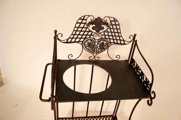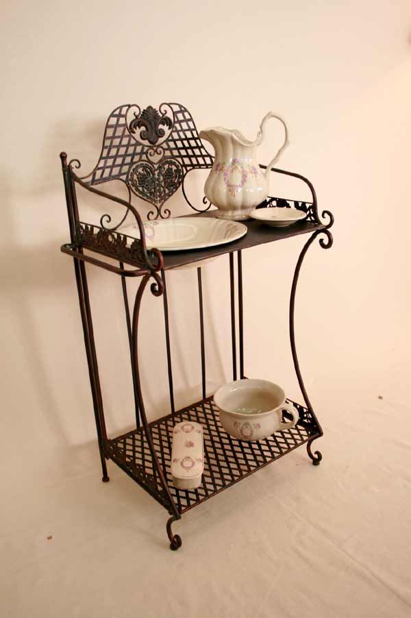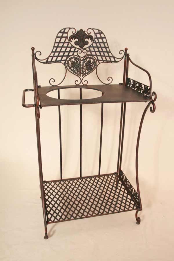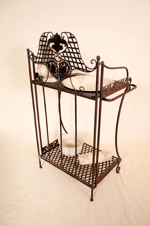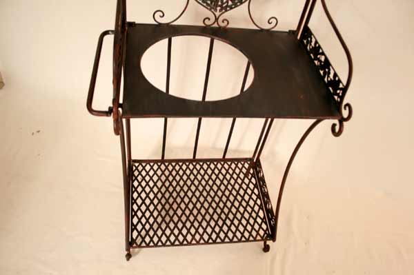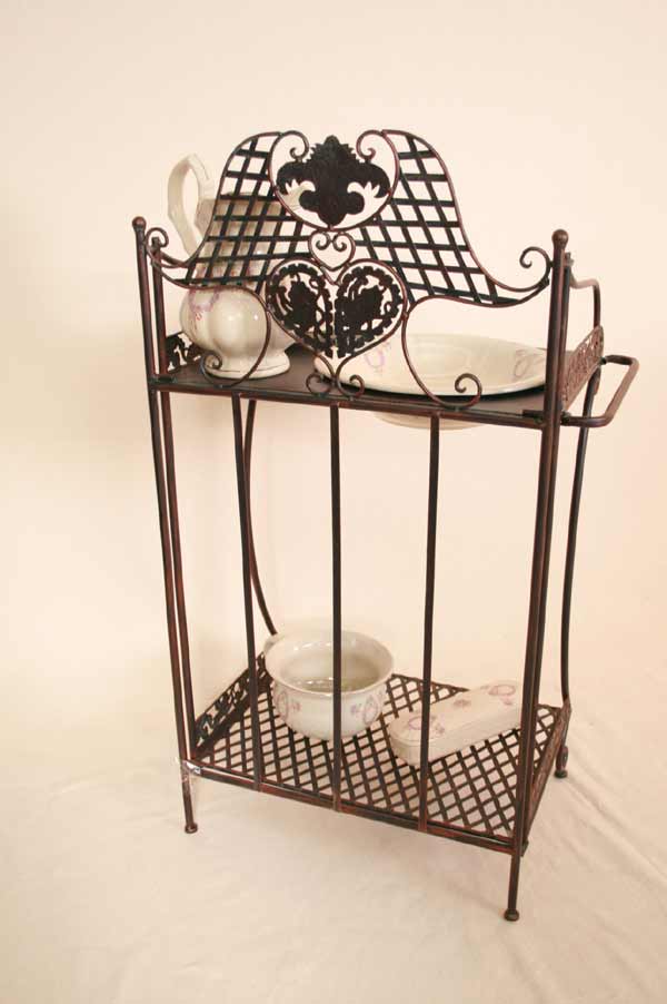 Angeboten wird ein zauberhafter Waschtisch / Klapptisch / Schmiedeeisen / Schminktisch / Flurtisch / Badetisch im antiken Stil. Der, schön verzierter Waschtisch ist aus Schmiedeeisen traumhaft patiniert und mit vielen Details verziert. Der Tisch besitzt zwei Ablageplatten. Die obere Ablageplatte besitzt eine große Öffnung für den Schüssel. Der Tisch ist zusammenklappbar.