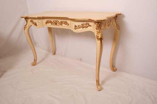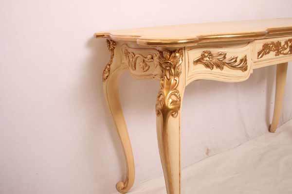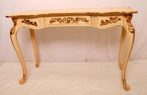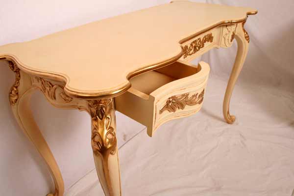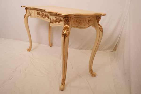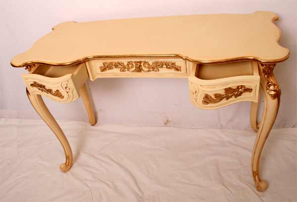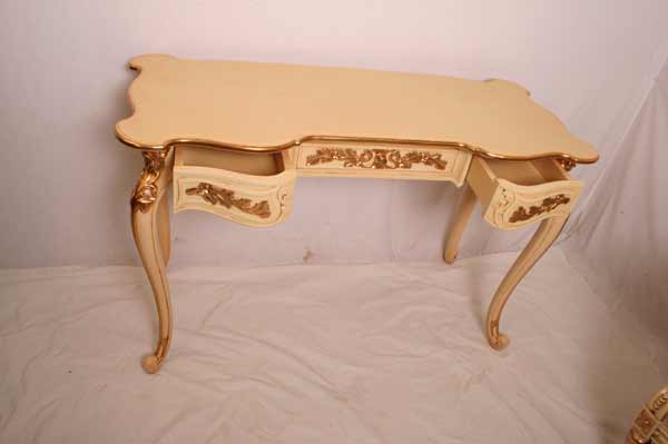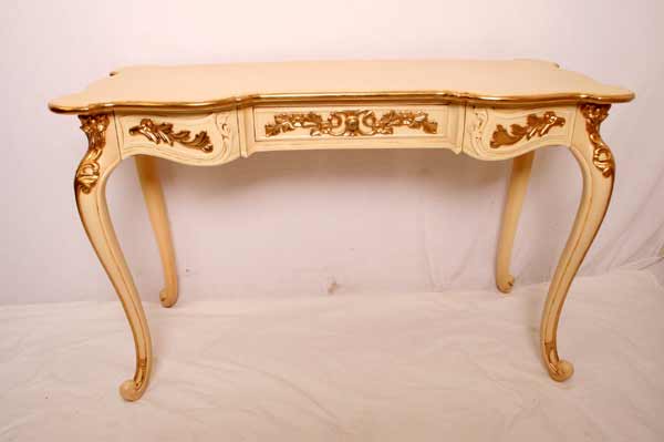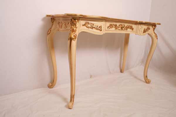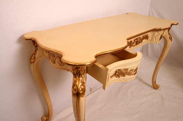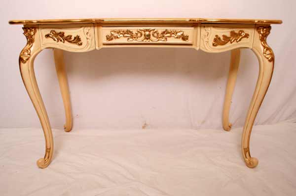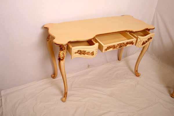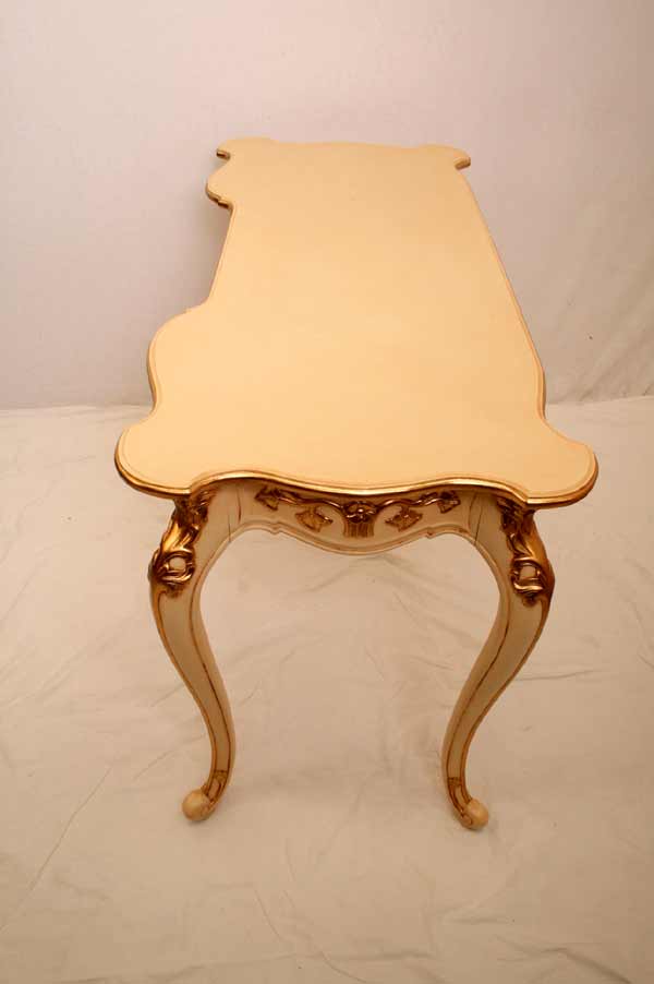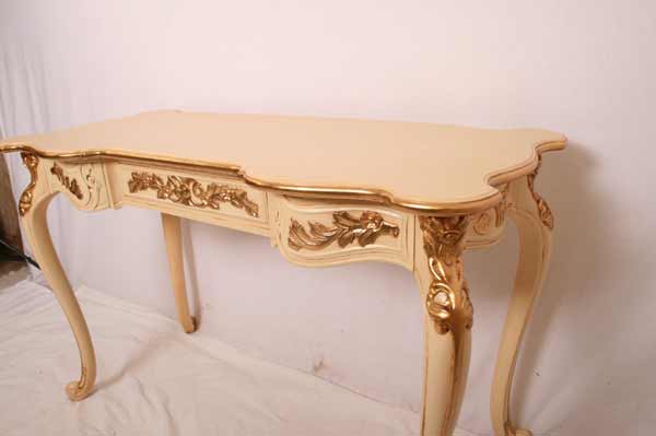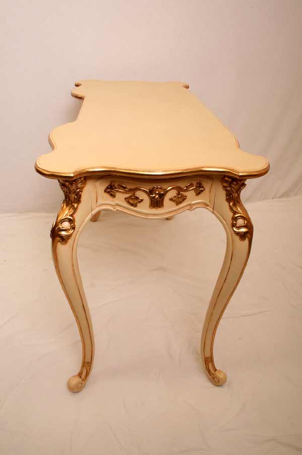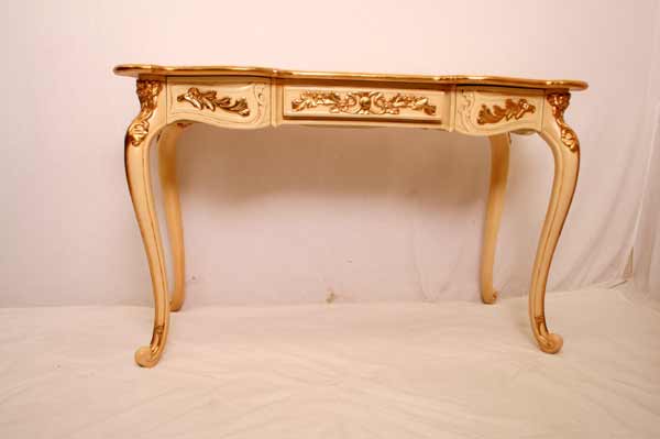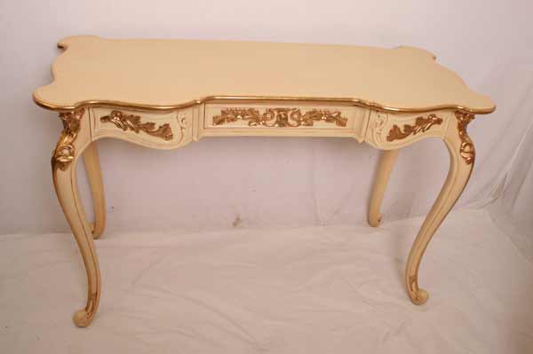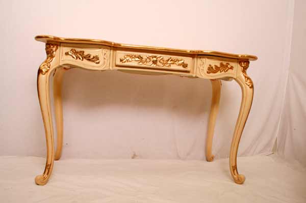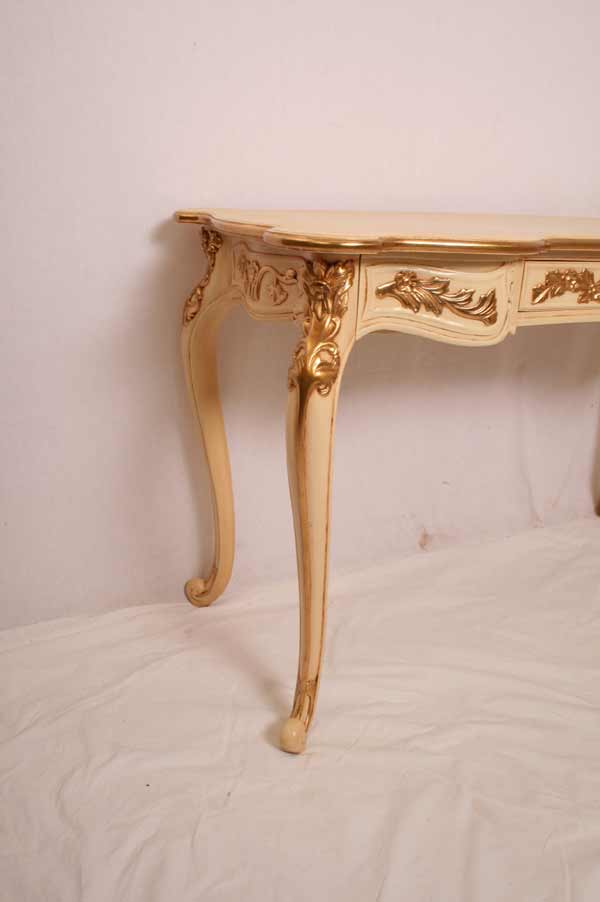 Angeboten wird ein traumhaft schöner Chippendale Damenschreibtisch / Konsole aus massivem Mahagoni Holz. Die Frontseite ist sehr elegant wellig gestaltet. Der schöne Schreibtisch besitzt 3 Schubladen. Der Tisch ist rundherum geschnitzt. Die Beine sind fantastisch schön geschwungen. Der Tisch ist Goldweiß gehalten, die Schnitzereien sowie die Umrandung ist mit Blattgold verziert. Diese Exemplar hat 2 Risse an der rechten Seite (siehe Bilder) und ist deshalb günstiger. Der edle Damenschreibtisch ist eine Augenweide für jeden Raum. Passende Möbel in dieser Art finden Sie in unserem Shop (siehe auch die letzten Bilder).