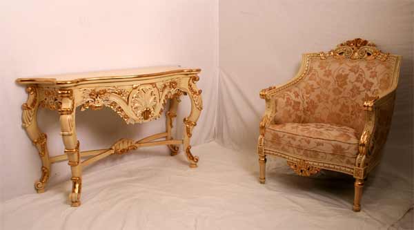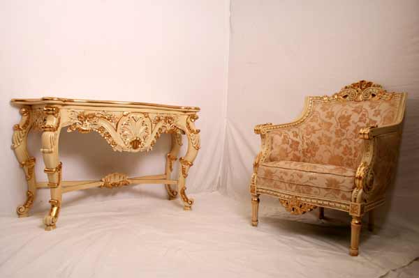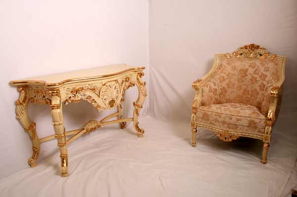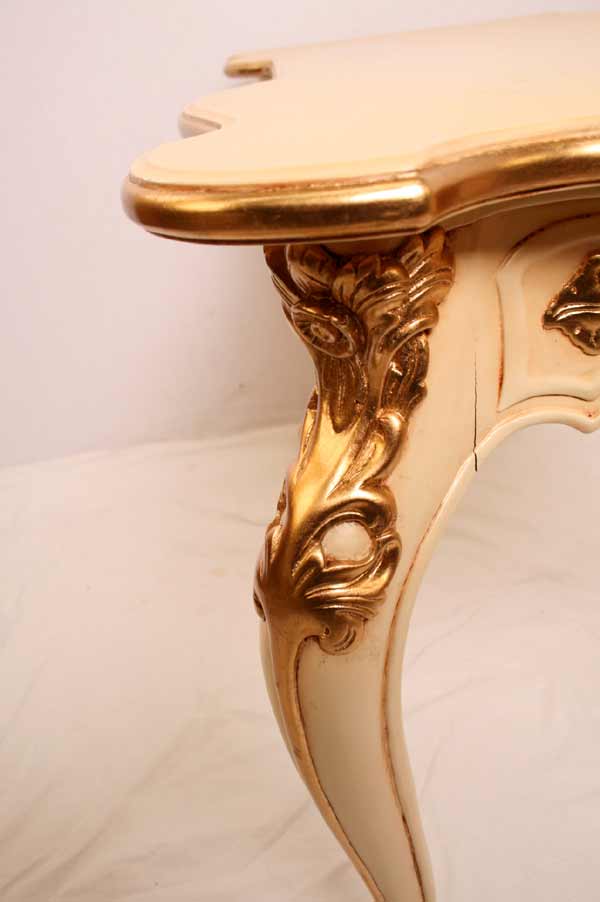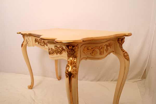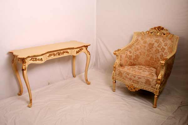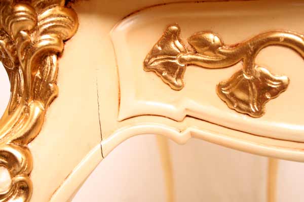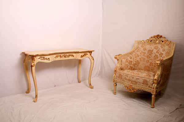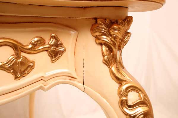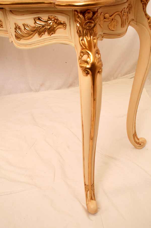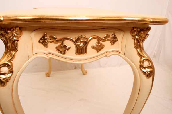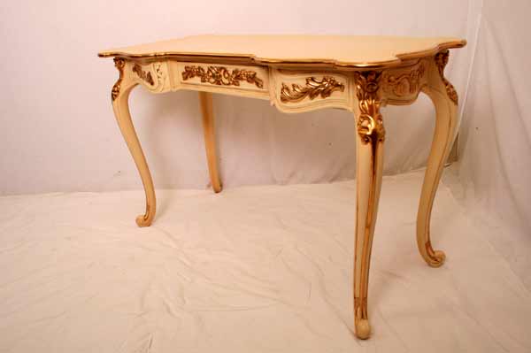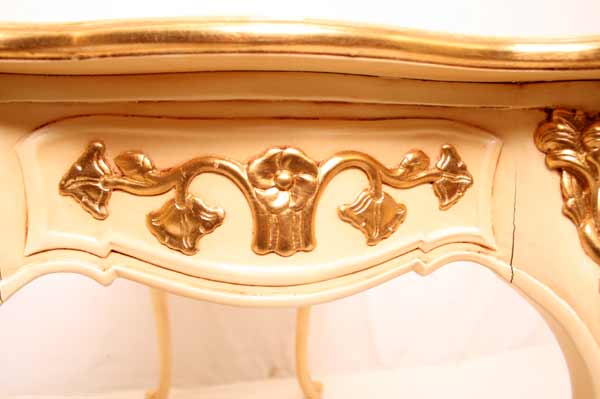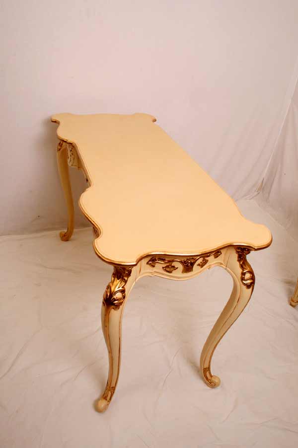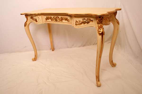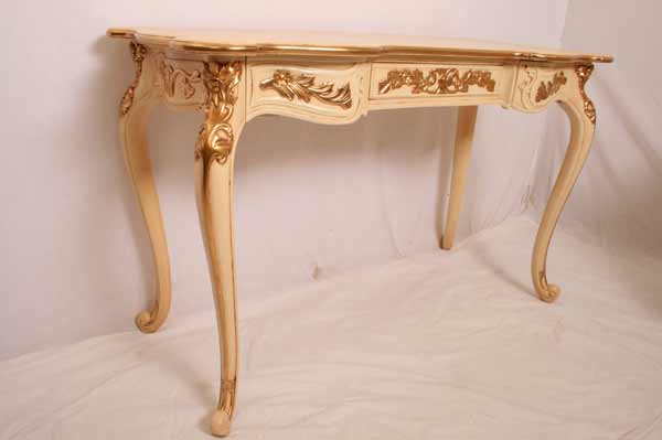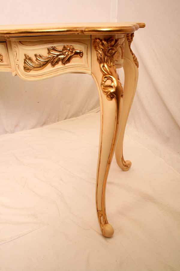 Angeboten wird ein traumhaft schöner Chippendale Damenschreibtisch / Konsole aus massivem Mahagoni Holz. Die Frontseite ist sehr elegant wellig gestaltet. Der schöne Schreibtisch besitzt 3 Schubladen. Der Tisch ist rundherum geschnitzt. Die Beine sind fantastisch schön geschwungen. Der Tisch ist Goldweiß gehalten, die Schnitzereien sowie die Umrandung ist mit Blattgold verziert. Diese Exemplar hat 2 Risse an der rechten Seite (siehe Bilder) und ist deshalb günstiger. Der edle Damenschreibtisch ist eine Augenweide für jeden Raum. Passende Möbel in dieser Art finden Sie in unserem Shop (siehe auch die letzten Bilder).