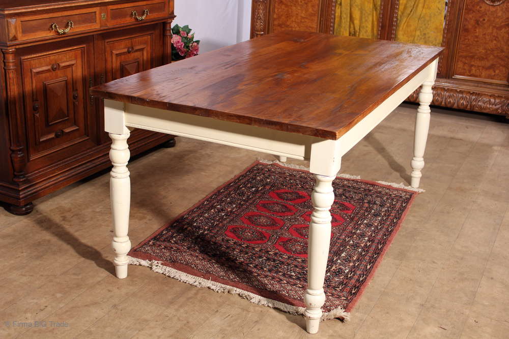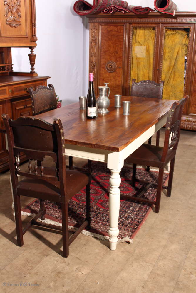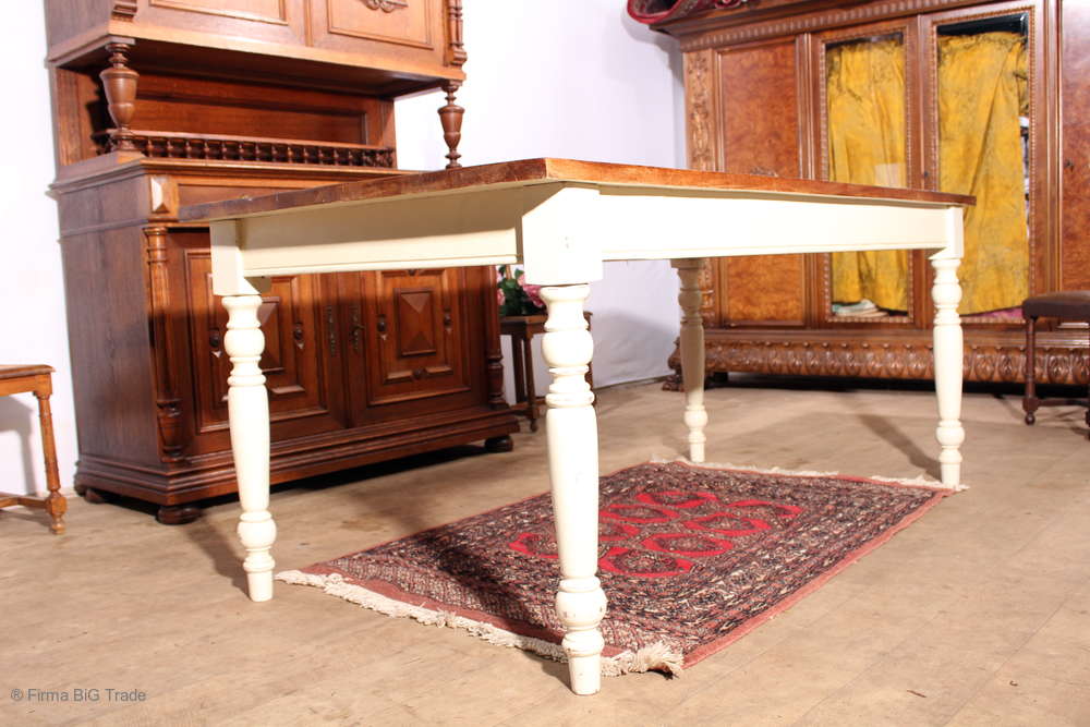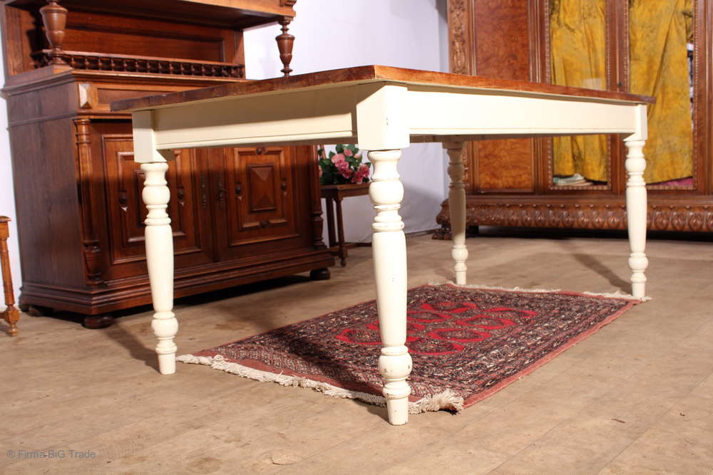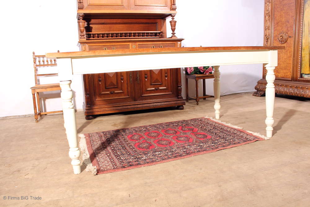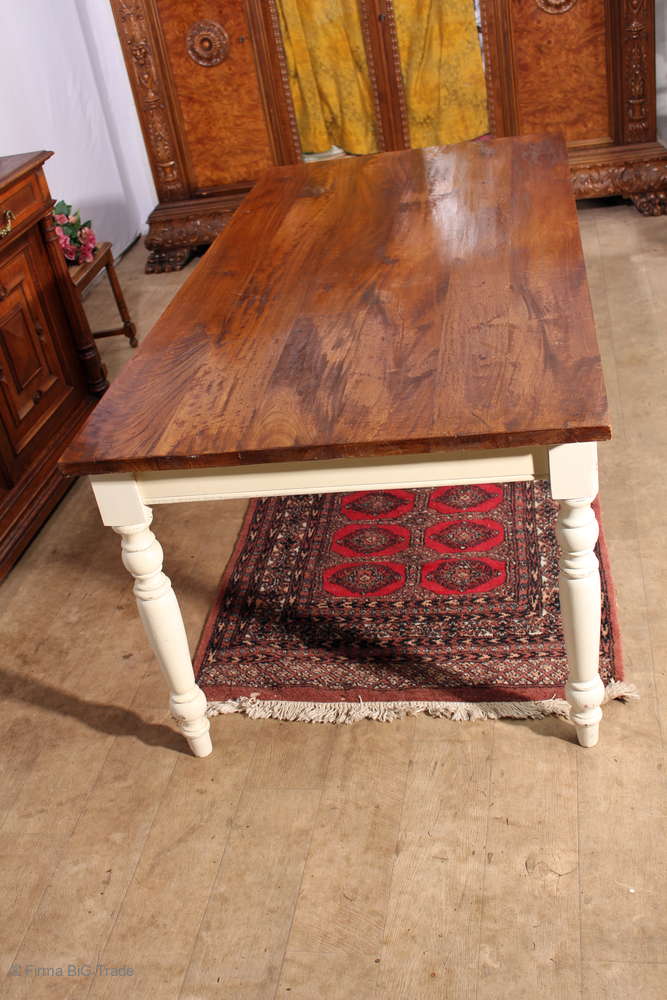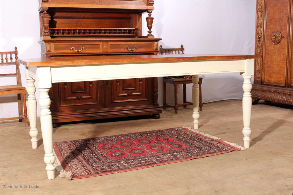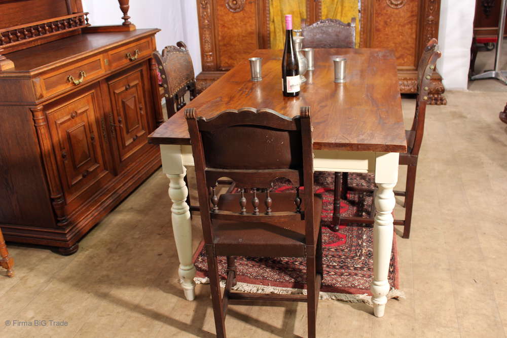 Angeboten wird ein wunderschöner Landhaus Esstisch / Küchentisch / Bauerntisch / Gesindetisch/ Tafeltisch / Banketttisch aus massivem Weichholz. Die abschraubbaren Beine des großen Tisches sind sehr schön gedrechselt. Das Gestell ist weiß lackiert und die Tischplatte kontrastreich im Mittelbraun gebeizt. Der großer Landhaustisch weist Alters- und Gebrauchsspuren auf u.a. Kratzer, Abrieb- und Stoßstellen und Flecken, an einem Fuß ist ein Stück Holz abgebrochen (siehe Bilder), ansonsten befindet sich der schöne Landhaus Tisch in einem guten gebrauchten und stabilen Zustand und kann sofort eingesetzt werden.