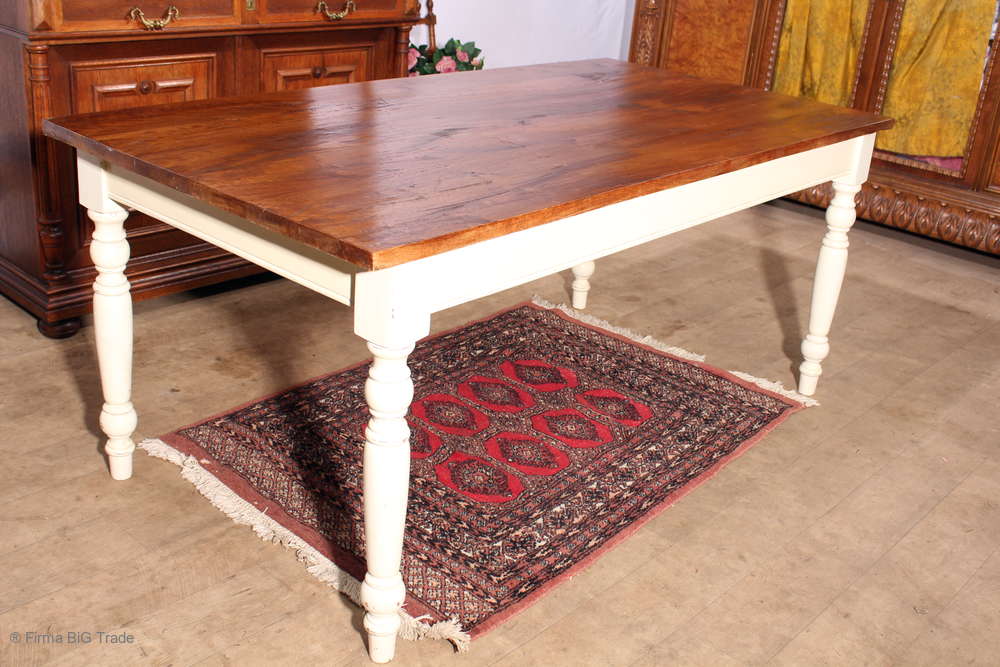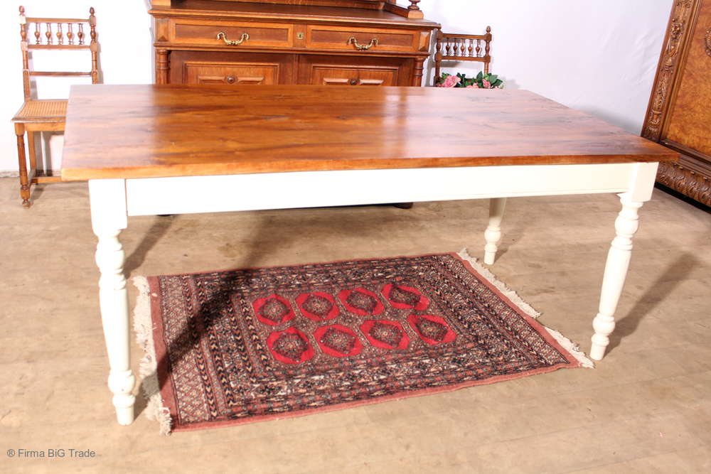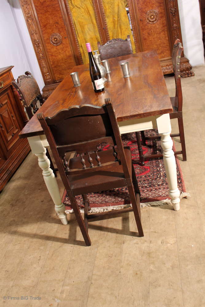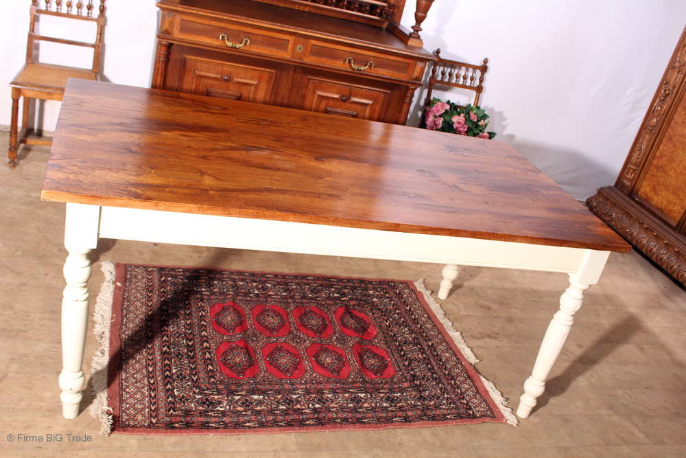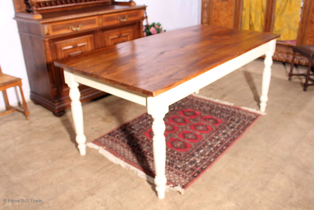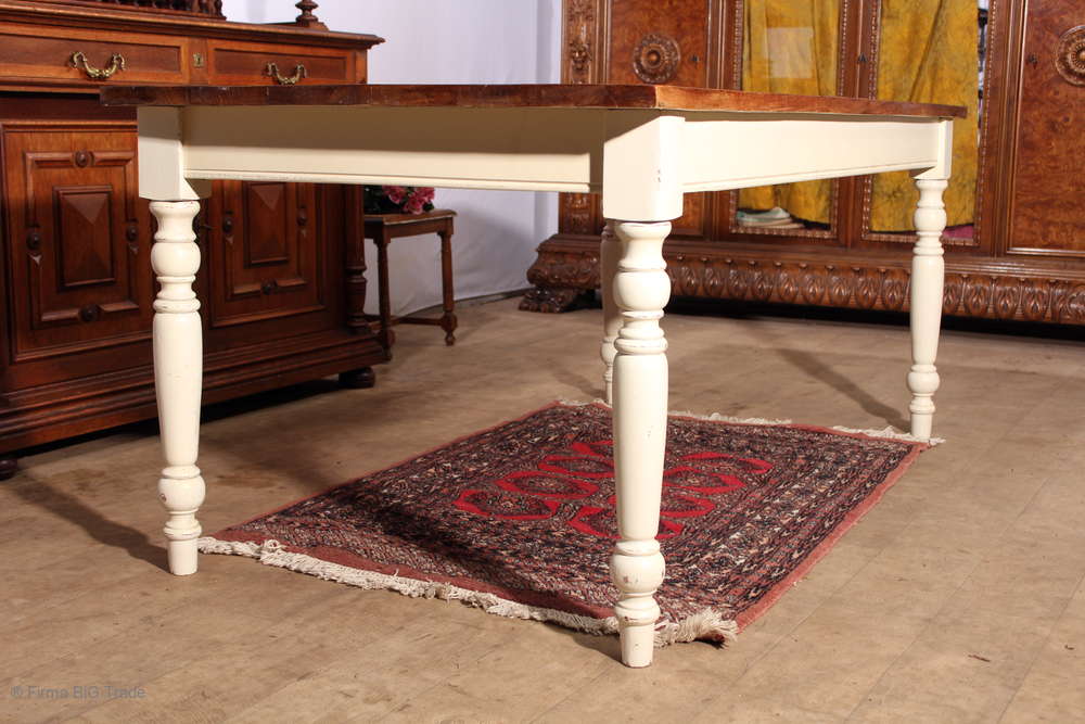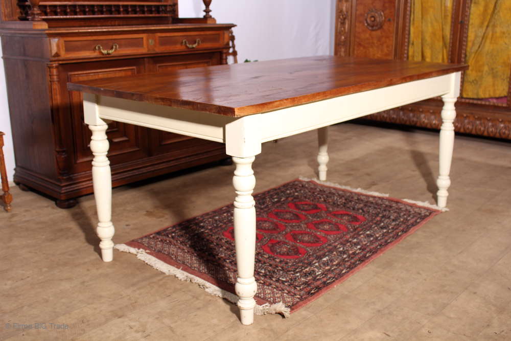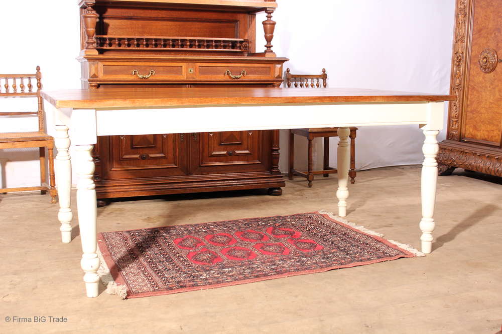 Angeboten wird ein wunderschöner Landhaus Esstisch / Küchentisch / Bauerntisch / Gesindetisch/ Tafeltisch / Banketttisch aus massivem Weichholz. Die abschraubbaren Beine des großen Tisches sind sehr schön gedrechselt. Das Gestell ist weiß lackiert und die Tischplatte kontrastreich im Mittelbraun gebeizt. Der großer Landhaustisch weist Alters- und Gebrauchsspuren auf u.a. Kratzer, Abrieb- und Stoßstellen und Flecken, an einem Fuß ist ein Stück Holz abgebrochen (siehe Bilder), ansonsten befindet sich der schöne Landhaus Tisch in einem guten gebrauchten und stabilen Zustand und kann sofort eingesetzt werden.