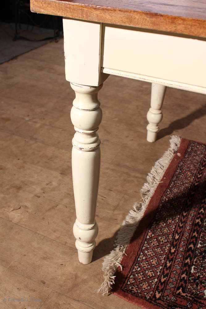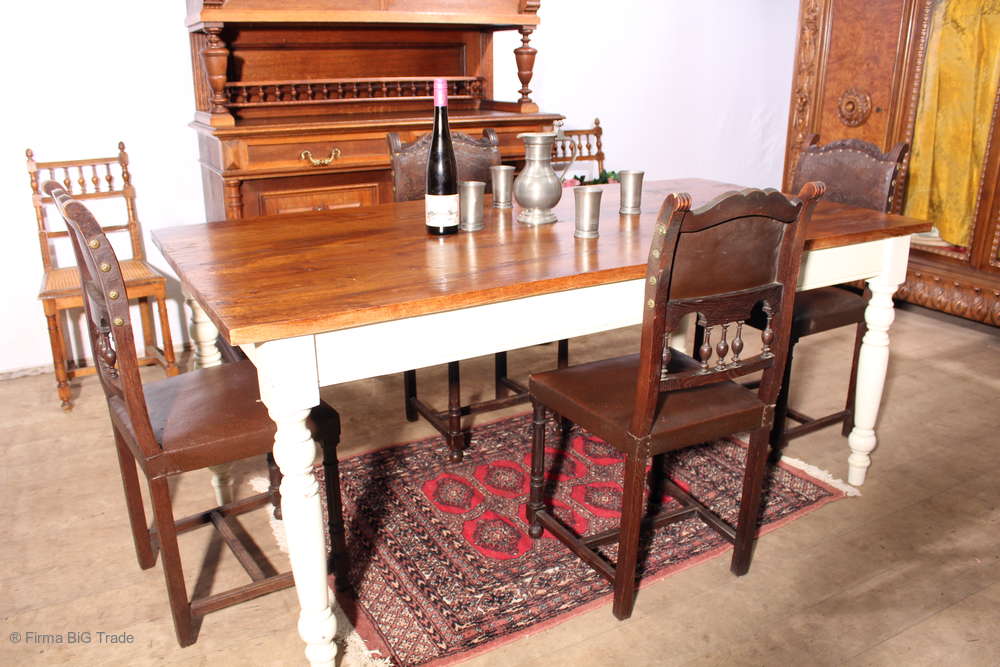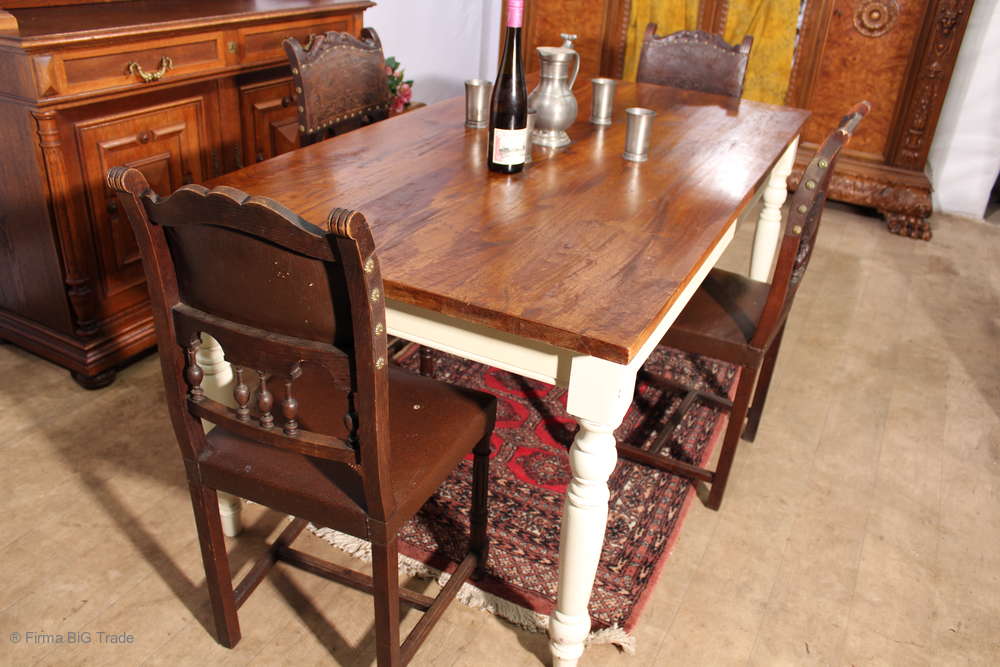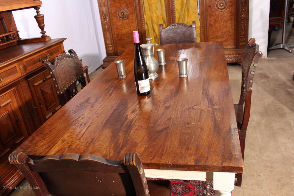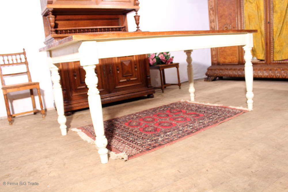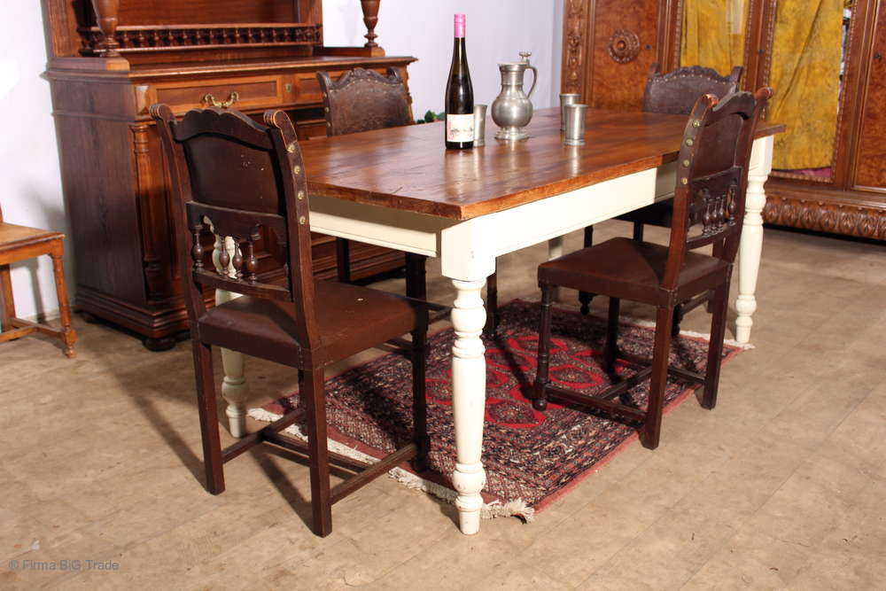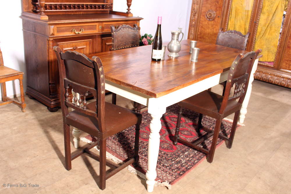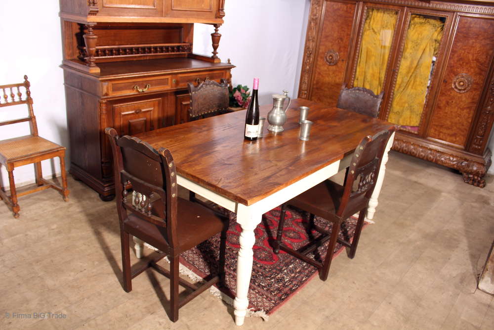 Angeboten wird ein wunderschöner Landhaus Esstisch / Küchentisch / Bauerntisch / Gesindetisch/ Tafeltisch / Banketttisch aus massivem Weichholz. Die abschraubbaren Beine des großen Tisches sind sehr schön gedrechselt. Das Gestell ist weiß lackiert und die Tischplatte kontrastreich im Mittelbraun gebeizt. Der großer Landhaustisch weist Alters- und Gebrauchsspuren auf u.a. Kratzer, Abrieb- und Stoßstellen und Flecken, an einem Fuß ist ein Stück Holz abgebrochen (siehe Bilder), ansonsten befindet sich der schöne Landhaus Tisch in einem guten gebrauchten und stabilen Zustand und kann sofort eingesetzt werden.