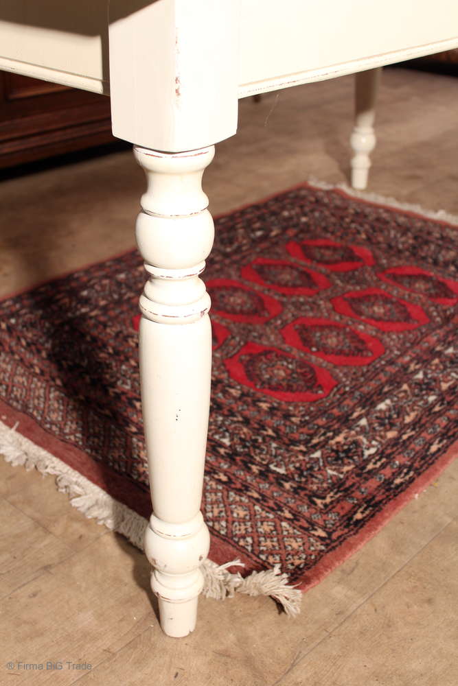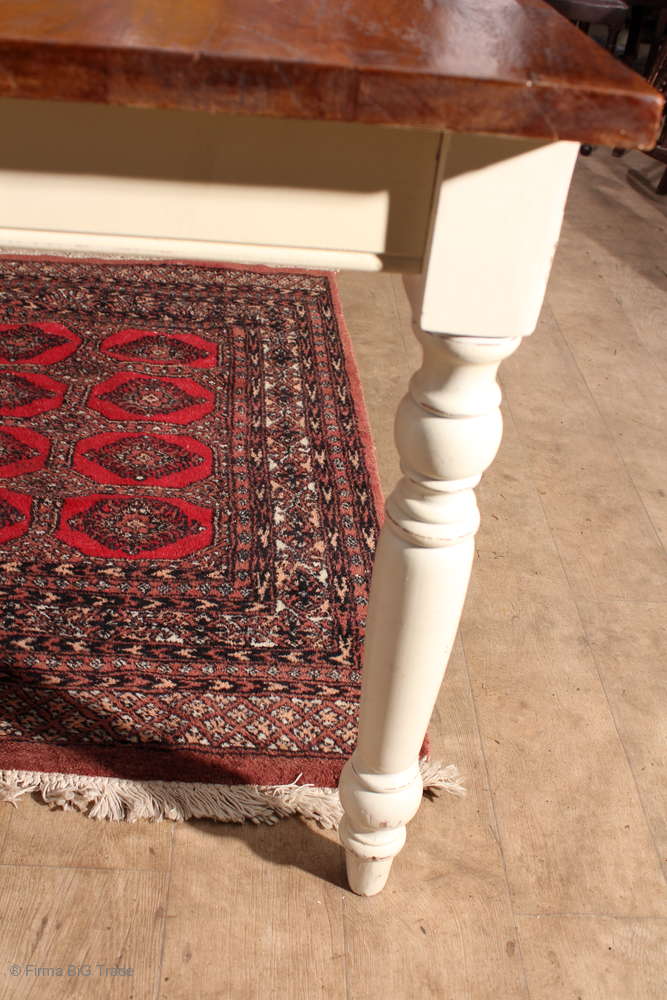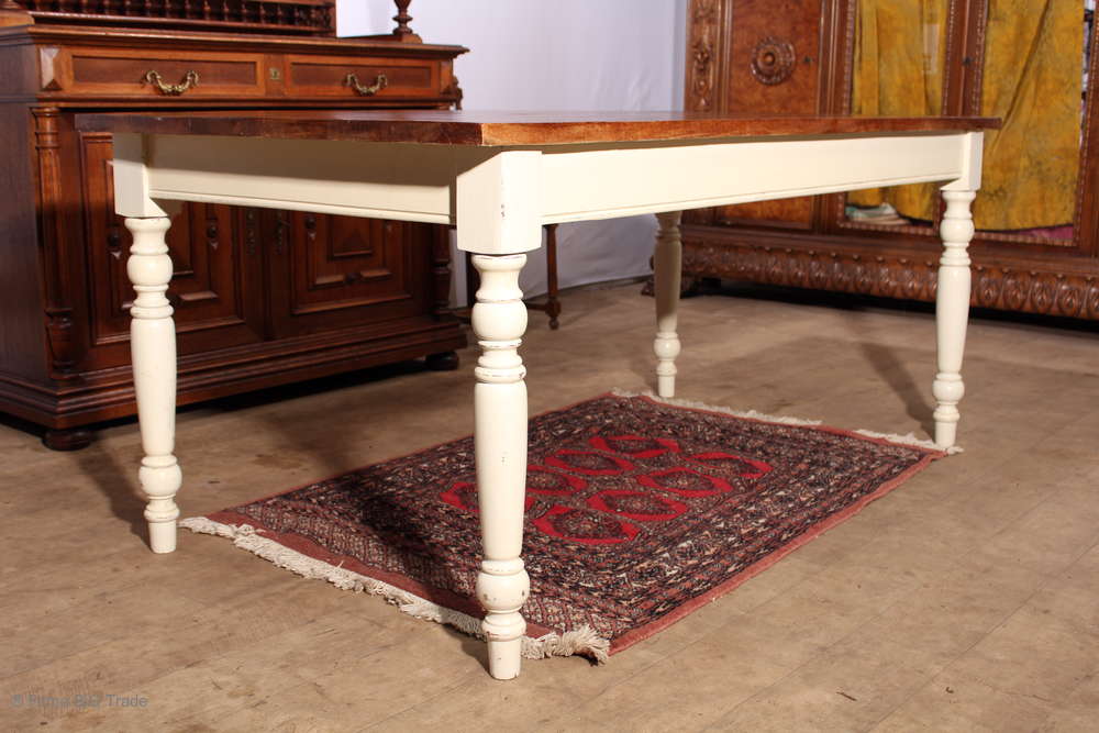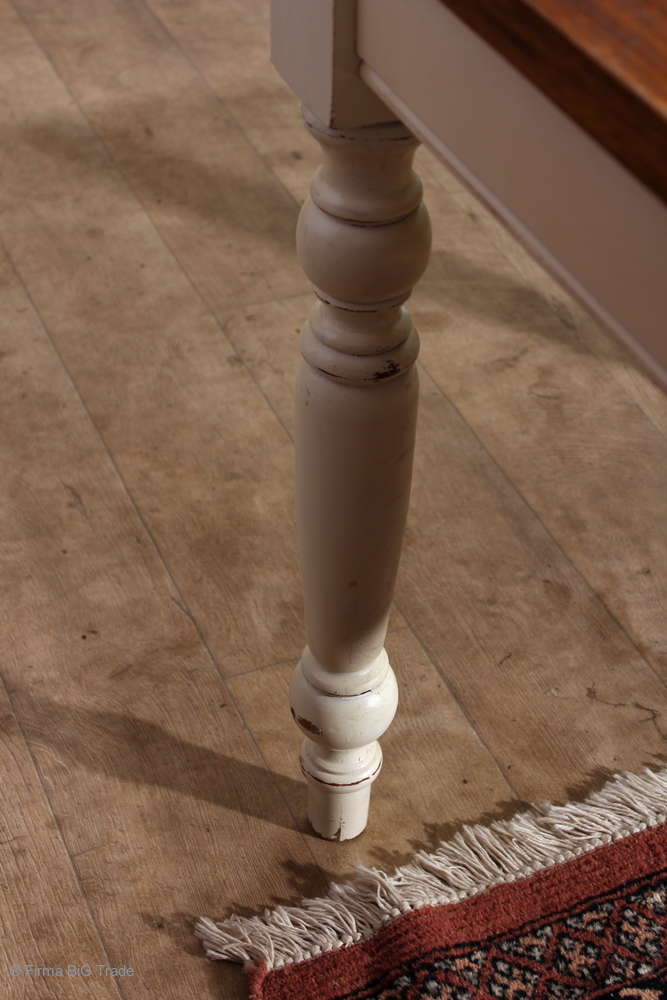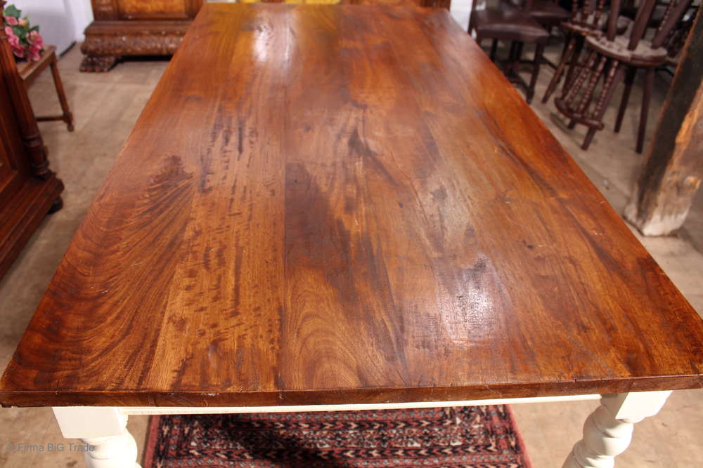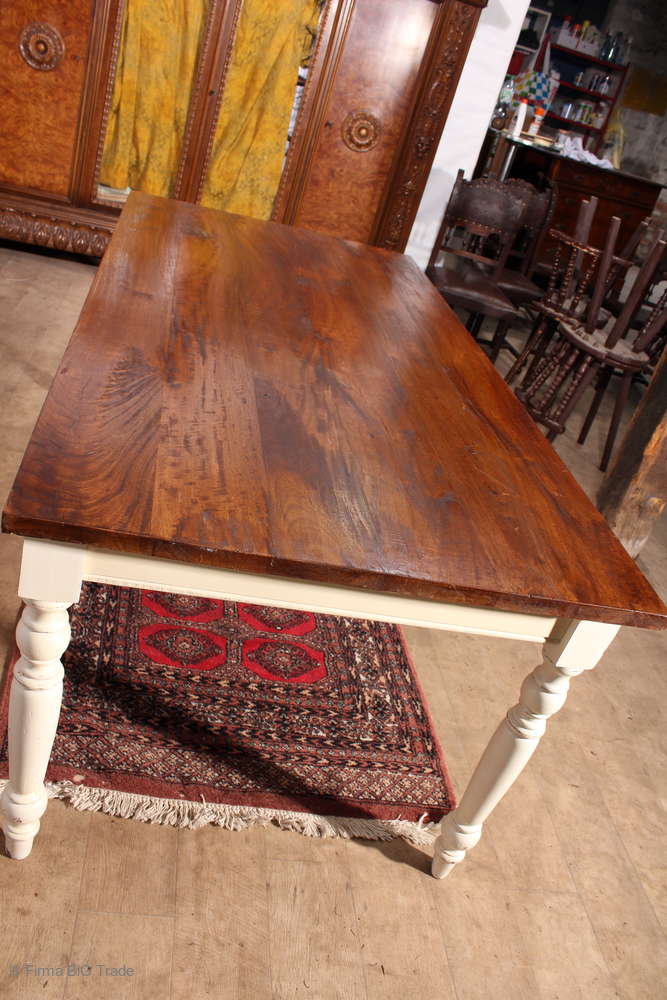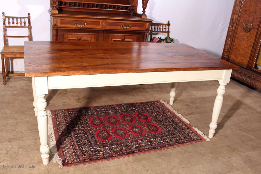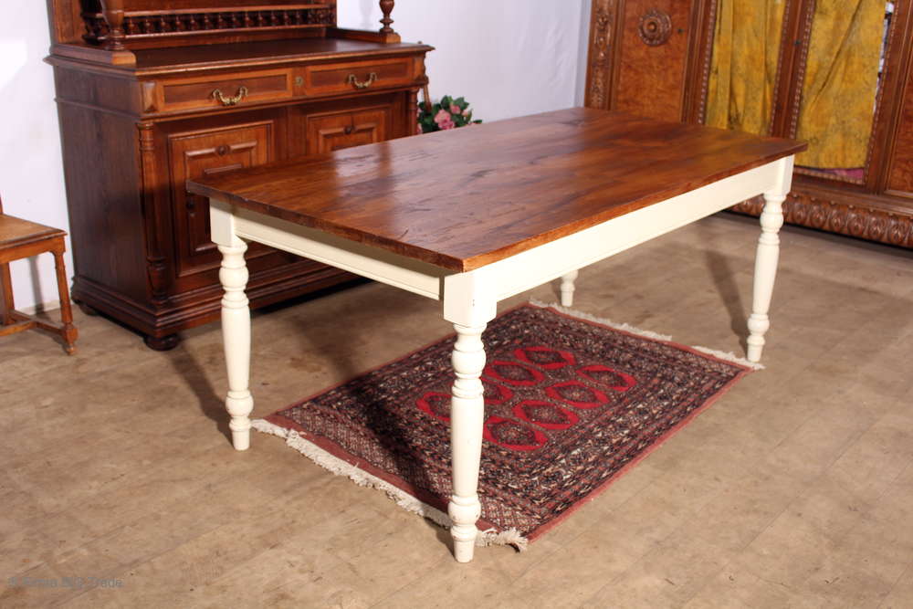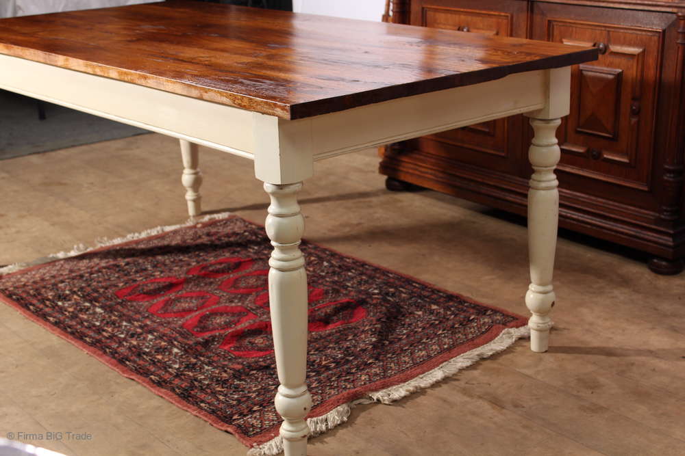 Angeboten wird ein wunderschöner Landhaus Esstisch / Küchentisch / Bauerntisch / Gesindetisch/ Tafeltisch / Banketttisch aus massivem Weichholz. Die abschraubbaren Beine des großen Tisches sind sehr schön gedrechselt. Das Gestell ist weiß lackiert und die Tischplatte kontrastreich im Mittelbraun gebeizt. Der großer Landhaustisch weist Alters- und Gebrauchsspuren auf u.a. Kratzer, Abrieb- und Stoßstellen und Flecken, an einem Fuß ist ein Stück Holz abgebrochen (siehe Bilder), ansonsten befindet sich der schöne Landhaus Tisch in einem guten gebrauchten und stabilen Zustand und kann sofort eingesetzt werden.