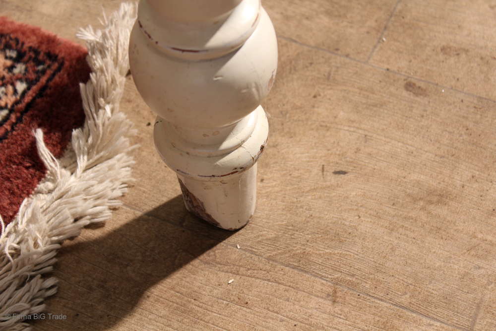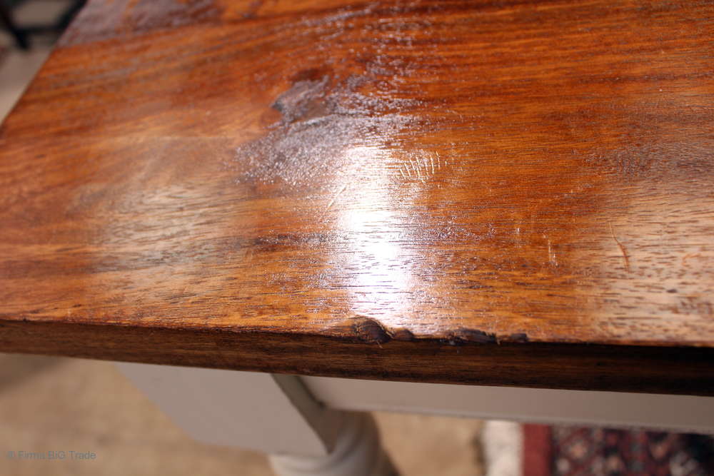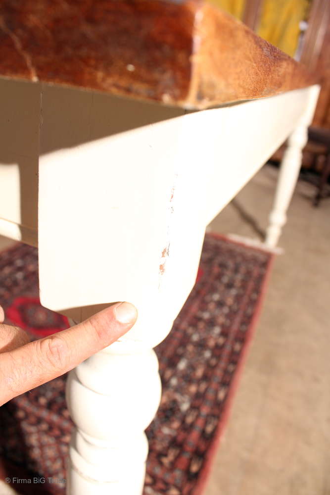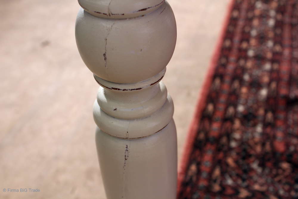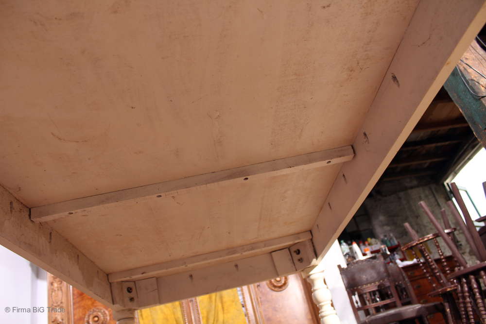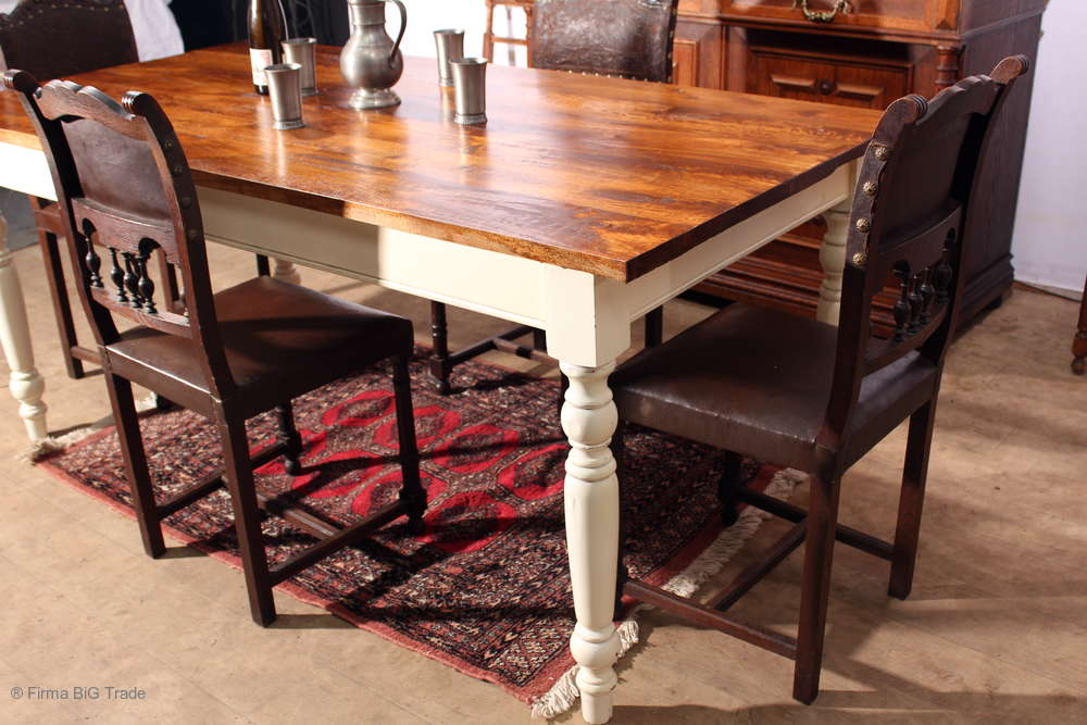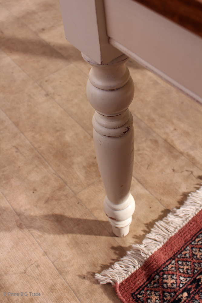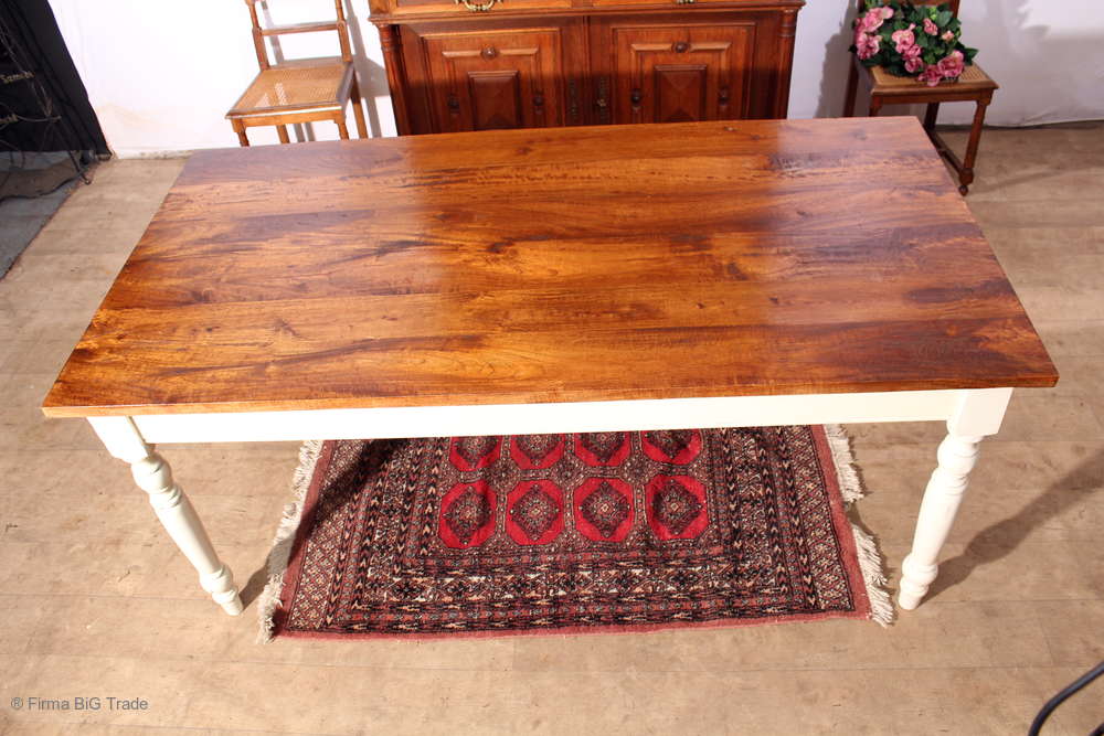 Angeboten wird ein wunderschöner Landhaus Esstisch / Küchentisch / Bauerntisch / Gesindetisch/ Tafeltisch / Banketttisch aus massivem Weichholz. Die abschraubbaren Beine des großen Tisches sind sehr schön gedrechselt. Das Gestell ist weiß lackiert und die Tischplatte kontrastreich im Mittelbraun gebeizt. Der großer Landhaustisch weist Alters- und Gebrauchsspuren auf u.a. Kratzer, Abrieb- und Stoßstellen und Flecken, an einem Fuß ist ein Stück Holz abgebrochen (siehe Bilder), ansonsten befindet sich der schöne Landhaus Tisch in einem guten gebrauchten und stabilen Zustand und kann sofort eingesetzt werden.