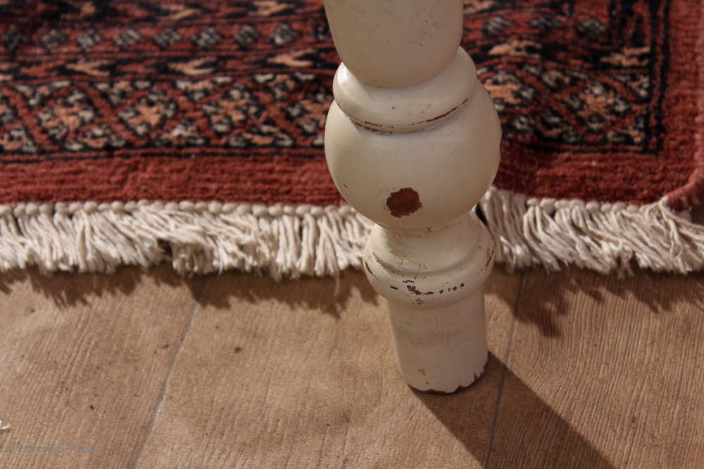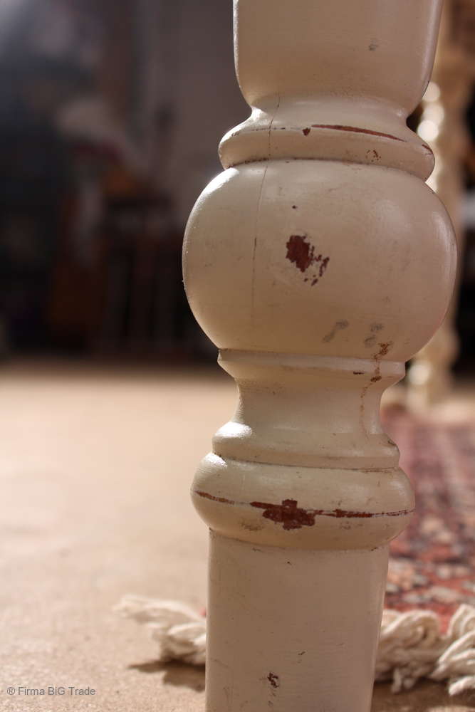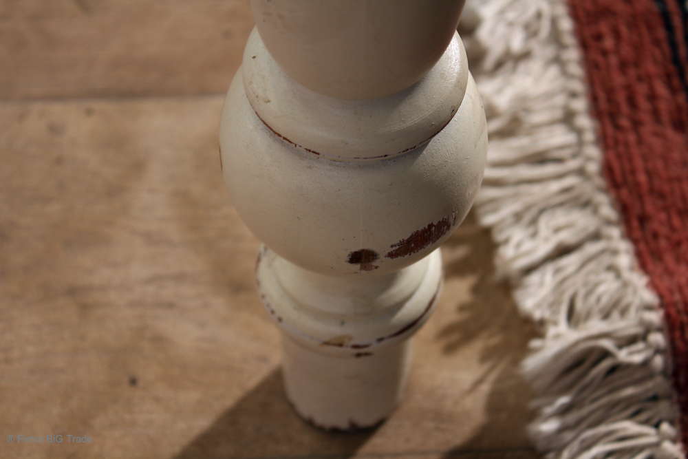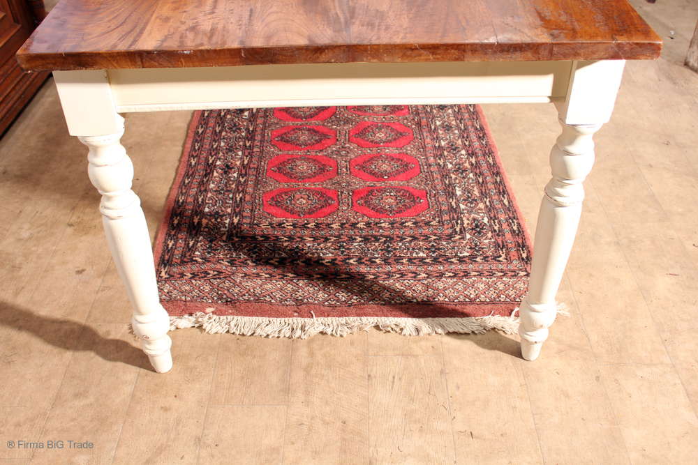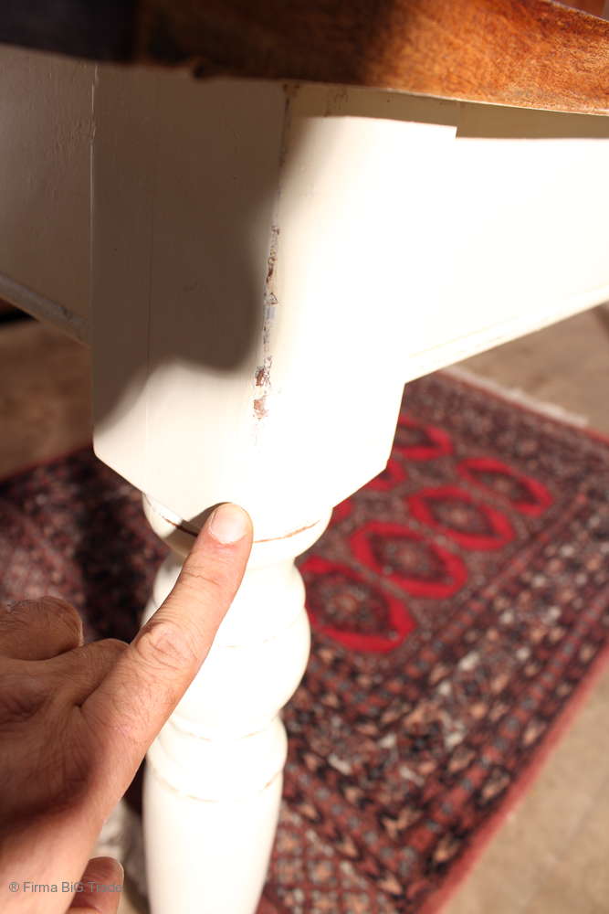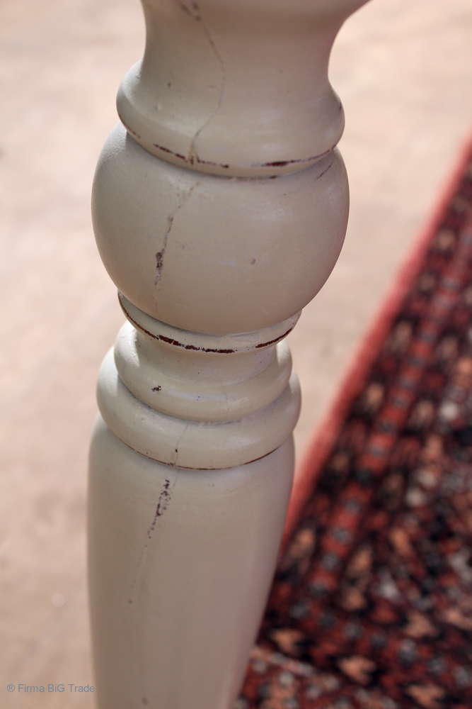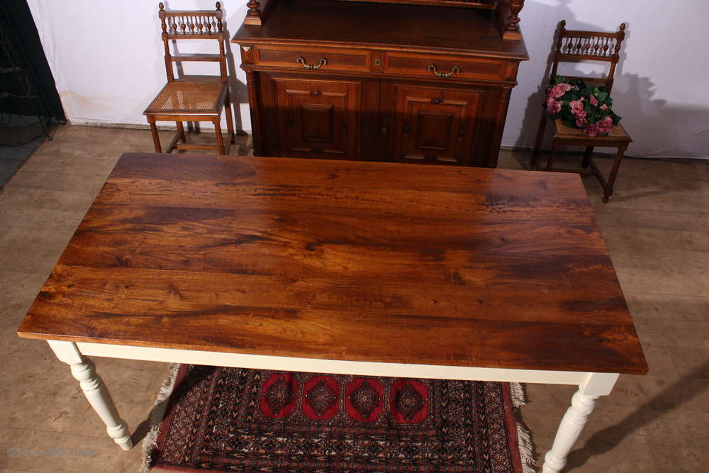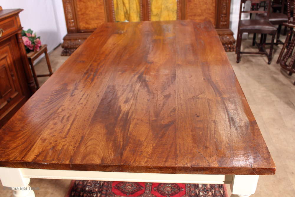 Angeboten wird ein wunderschöner Landhaus Esstisch / Küchentisch / Bauerntisch / Gesindetisch/ Tafeltisch / Banketttisch aus massivem Weichholz. Die abschraubbaren Beine des großen Tisches sind sehr schön gedrechselt. Das Gestell ist weiß lackiert und die Tischplatte kontrastreich im Mittelbraun gebeizt. Der großer Landhaustisch weist Alters- und Gebrauchsspuren auf u.a. Kratzer, Abrieb- und Stoßstellen und Flecken, an einem Fuß ist ein Stück Holz abgebrochen (siehe Bilder), ansonsten befindet sich der schöne Landhaus Tisch in einem guten gebrauchten und stabilen Zustand und kann sofort eingesetzt werden.