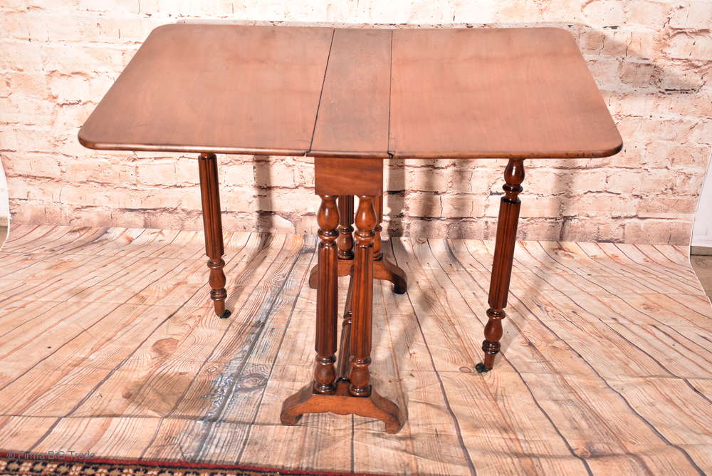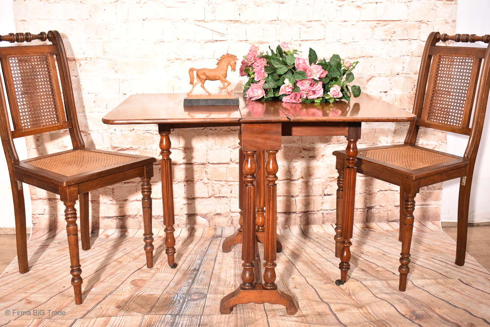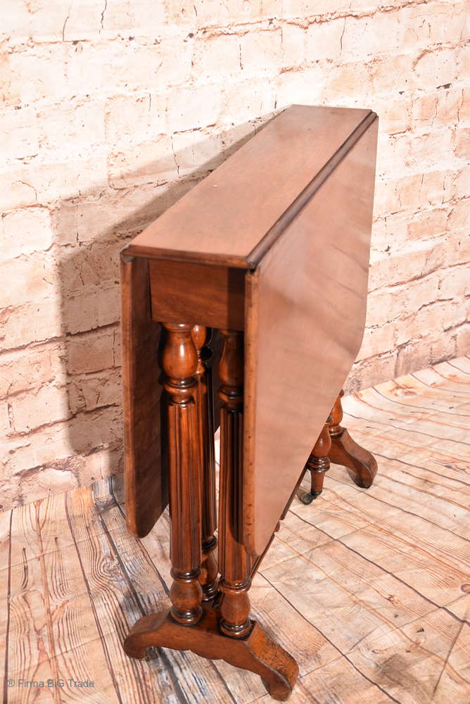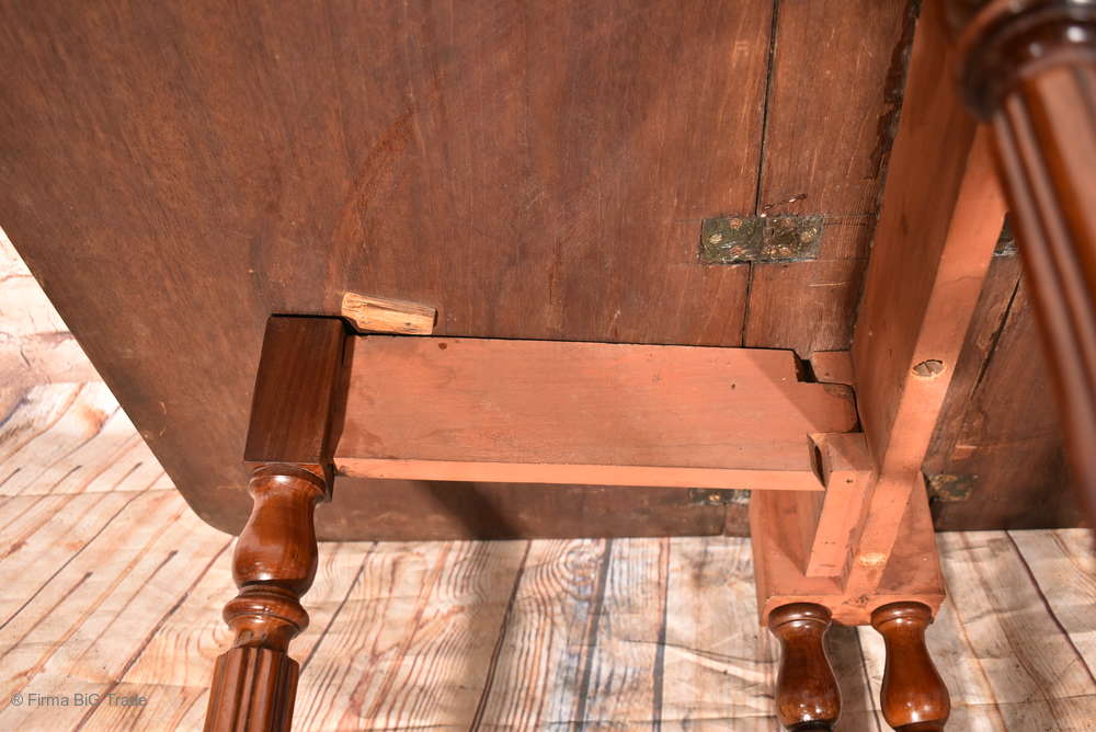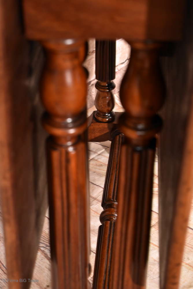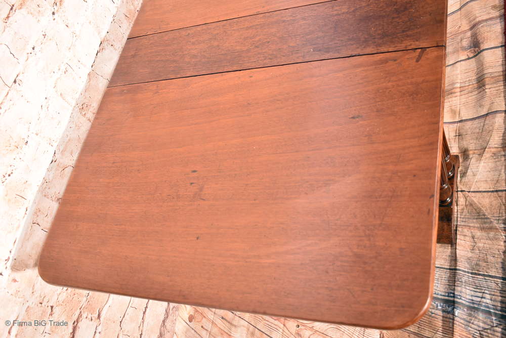Angeboten wir ein seltener und ausgefallener antiker Jugendstil Klapptisch / Kaffeetisch / Kinderspieltisch / Beistelltisch / Couchtisch aus massivem Holz. Der Ausgefallene Tisch hat 2 Seitenklappen und kann platzsparend zusammengeklappt werden. Das Gestell in der Mitte besteht aus 4 gedrechselten und gerillten Säulen, die auf formschönen Bügel ähnlichen Füßen stehen, unter den Seitenklappen verstaut sich jeweils ein weiteres Standbein mit kleinen Rollen. Am antiken und eleganten Klapptisch sind Alters- und Gebrauchsspuren u.a. Kratzer, Stoßstellen und Flecken vorhanden (siehe Bilder), der antike Klapptisch befindet sich aber in einem guten und stabilen Zustand.