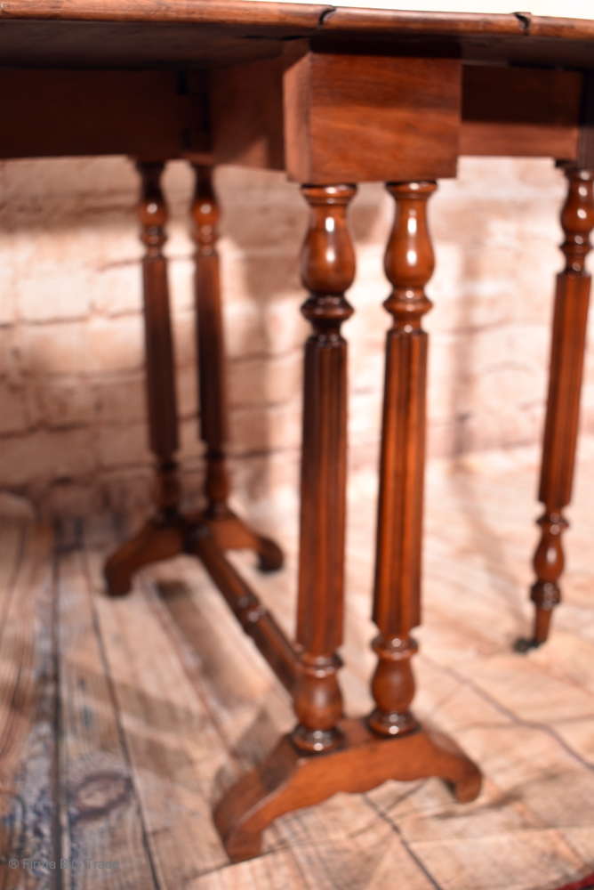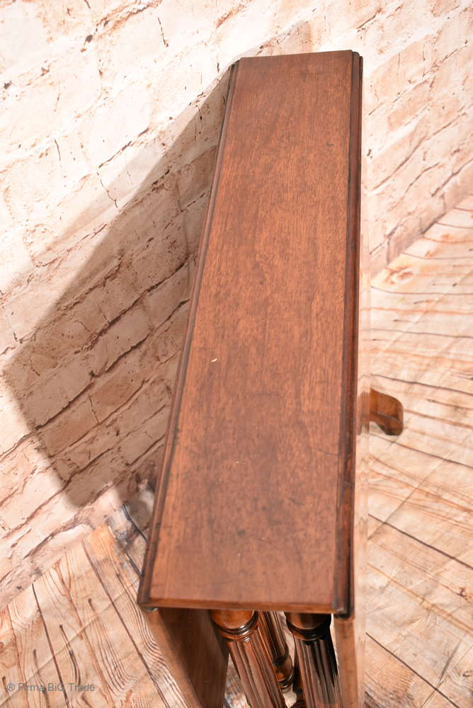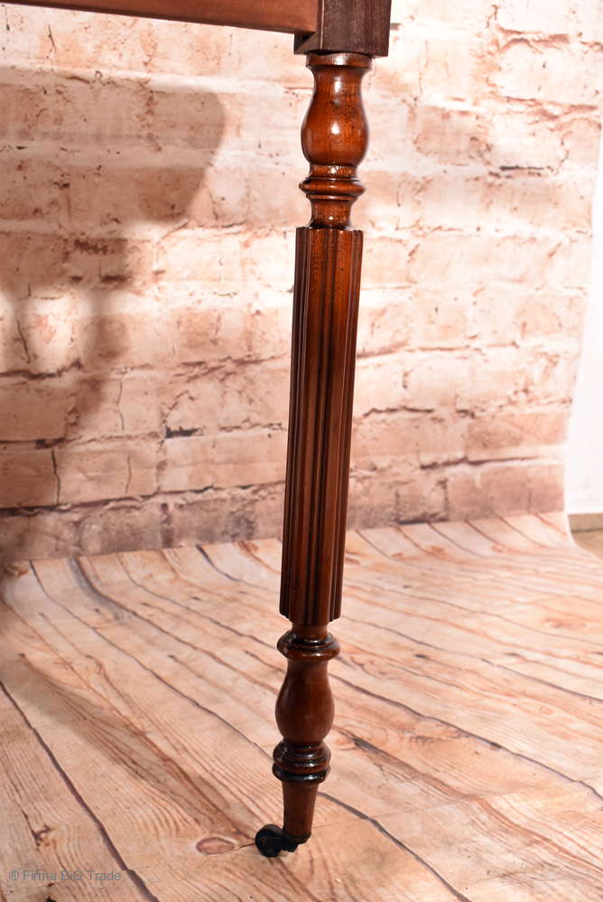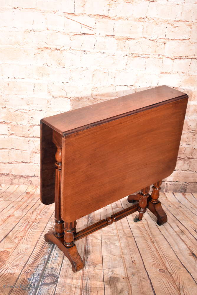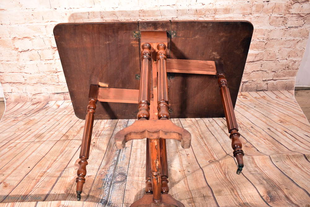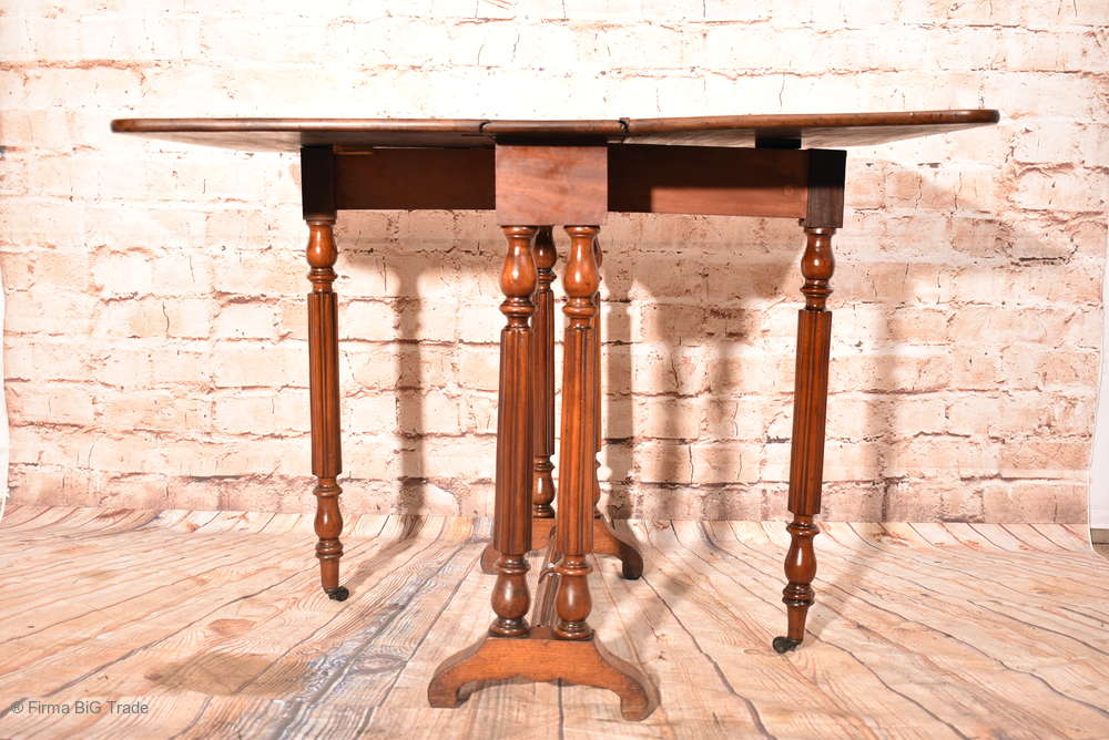 Angeboten wir ein seltener und ausgefallener antiker Jugendstil Klapptisch / Kaffeetisch / Kinderspieltisch / Beistelltisch / Couchtisch aus massivem Holz. Der Ausgefallene Tisch hat 2 Seitenklappen und kann platzsparend zusammengeklappt werden. Das Gestell in der Mitte besteht aus 4 gedrechselten und gerillten Säulen, die auf formschönen Bügel ähnlichen Füßen stehen, unter den Seitenklappen verstaut sich jeweils ein weiteres Standbein mit kleinen Rollen. Am antiken und eleganten Klapptisch sind Alters- und Gebrauchsspuren u.a. Kratzer, Stoßstellen und Flecken vorhanden (siehe Bilder), der antike Klapptisch befindet sich aber in einem guten und stabilen Zustand.