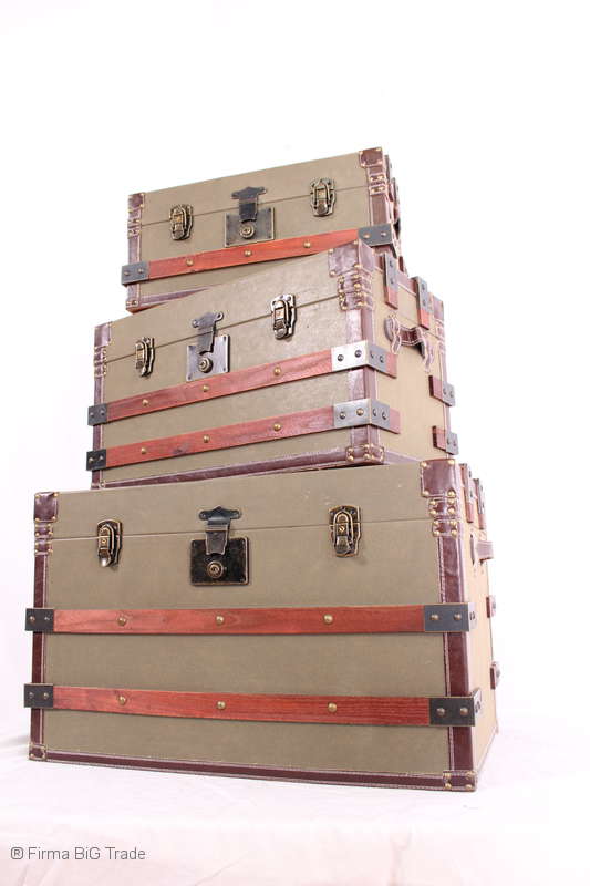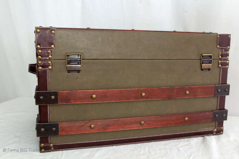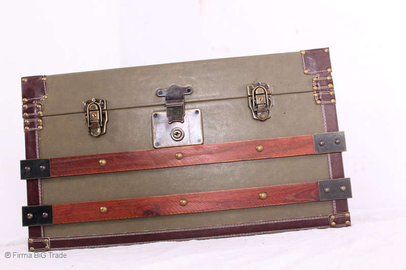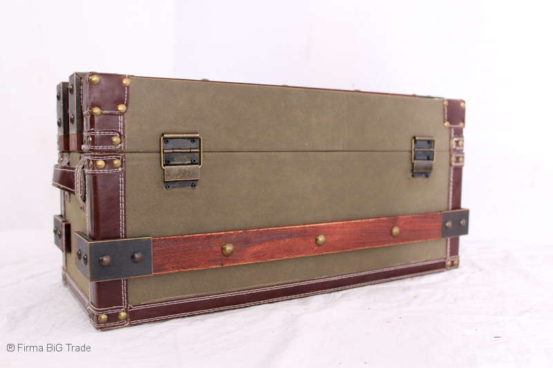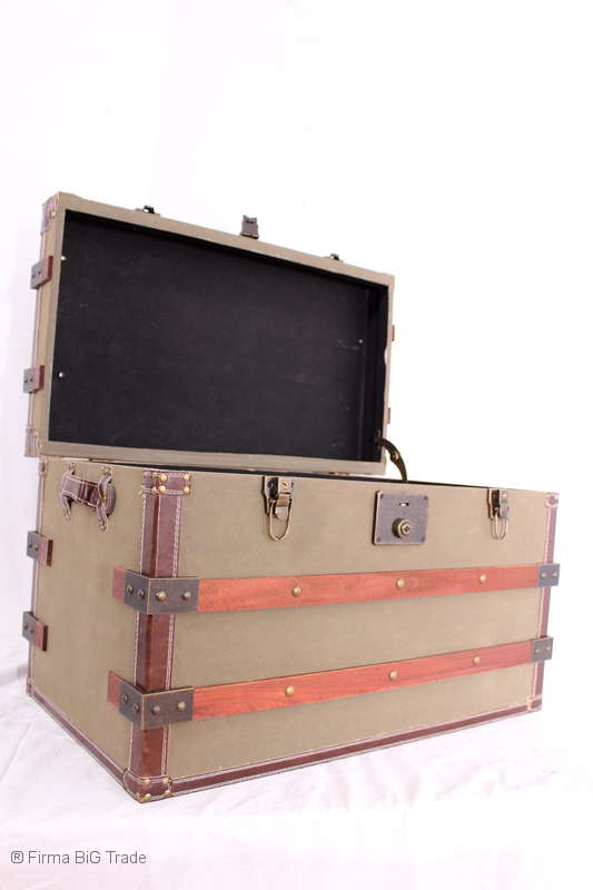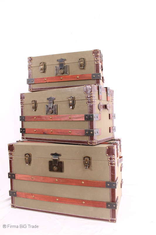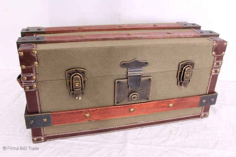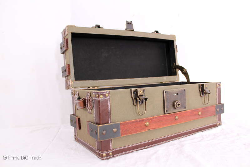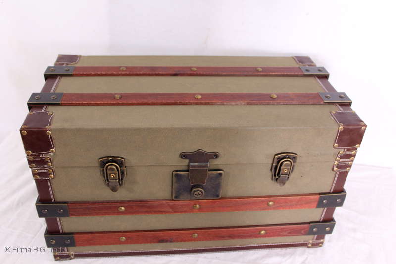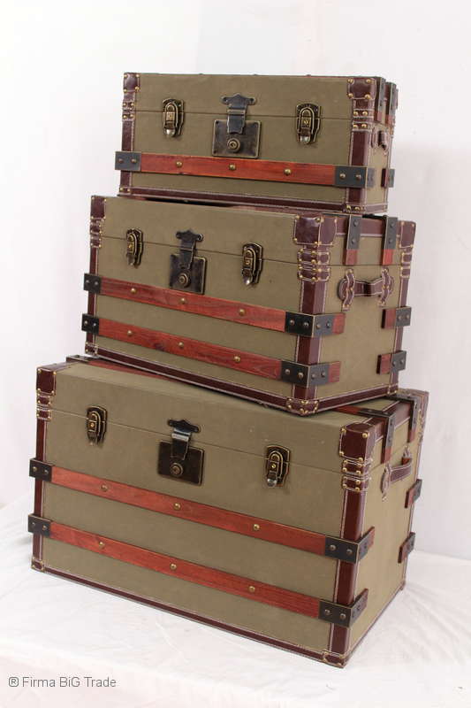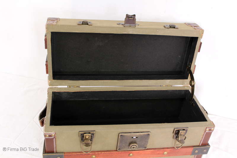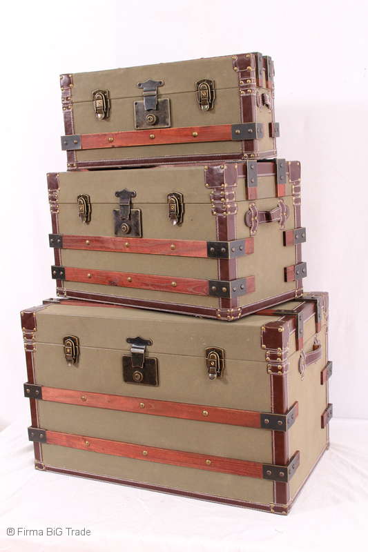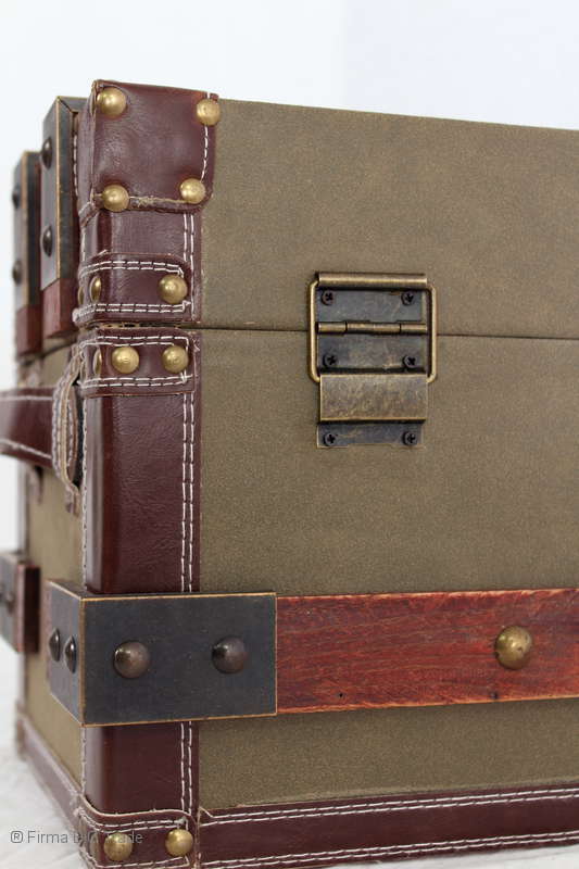 Angeboten wird ein schönes Kutscherkoffer Set bestehend aus 3 Koffer / Transportkiste / Flachdeckeltruhe / Wäschetruhe / Koffer / Tisch im antiken Stil. Die schönen Koffer besitzen zwei Klappschlösser und ein Schloss ohne Schlüssel. Der olivgrüne Koffer ist mit Holzlatten und an den Kanten mit Lederriemen und Metallkappen verstärkt. An den Seiten befinden sich Tragegriffe. Die schönen Koffer sind neu, können aber hier und da produktionsbedingte Fehler aufweisen. Die Koffer haben unterschiedliche Größen.