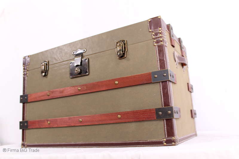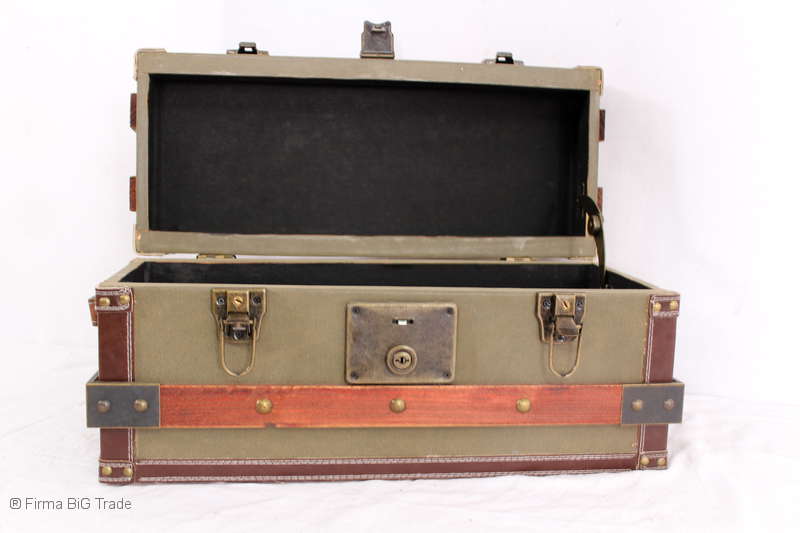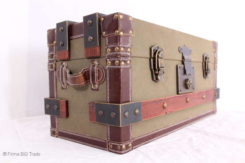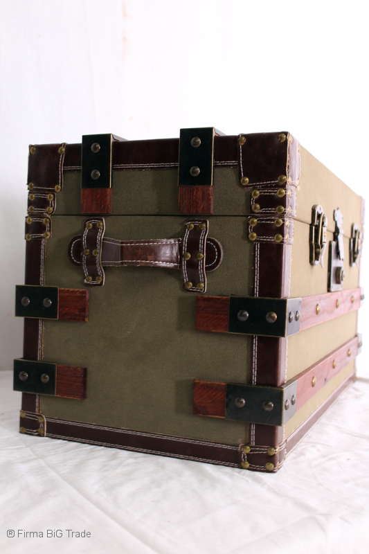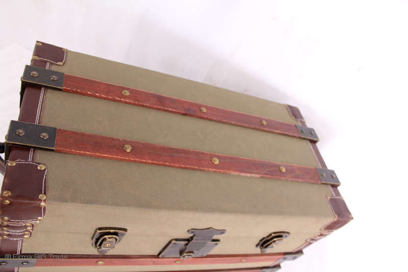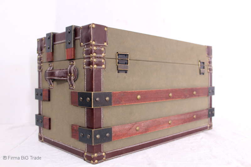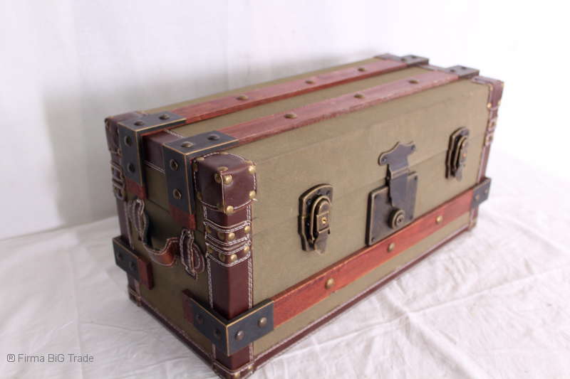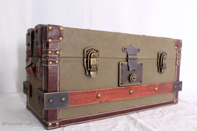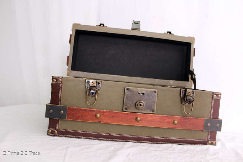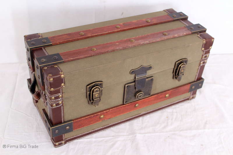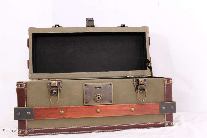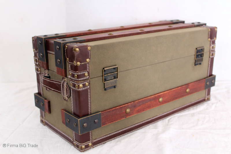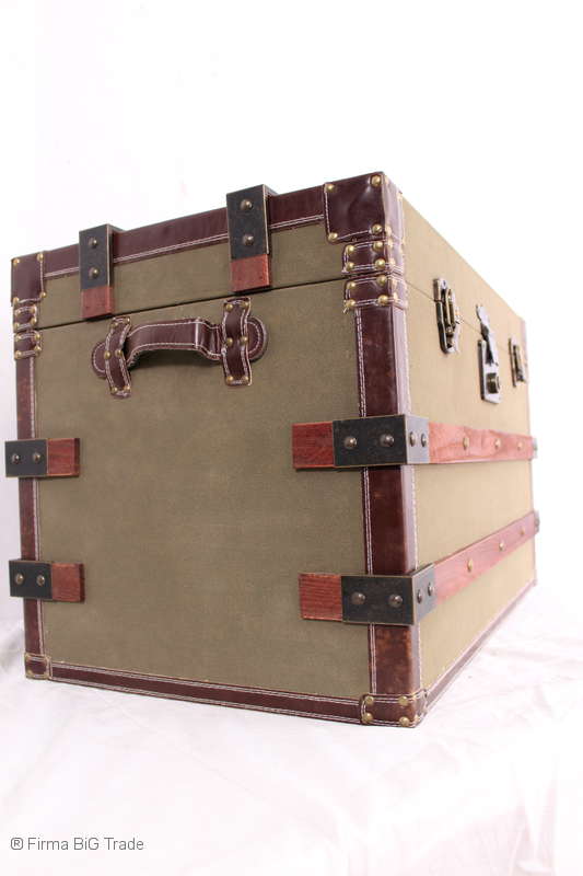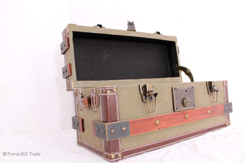 Angeboten wird ein schönes Kutscherkoffer Set bestehend aus 3 Koffer / Transportkiste / Flachdeckeltruhe / Wäschetruhe / Koffer / Tisch im antiken Stil. Die schönen Koffer besitzen zwei Klappschlösser und ein Schloss ohne Schlüssel. Der olivgrüne Koffer ist mit Holzlatten und an den Kanten mit Lederriemen und Metallkappen verstärkt. An den Seiten befinden sich Tragegriffe. Die schönen Koffer sind neu, können aber hier und da produktionsbedingte Fehler aufweisen. Die Koffer haben unterschiedliche Größen.