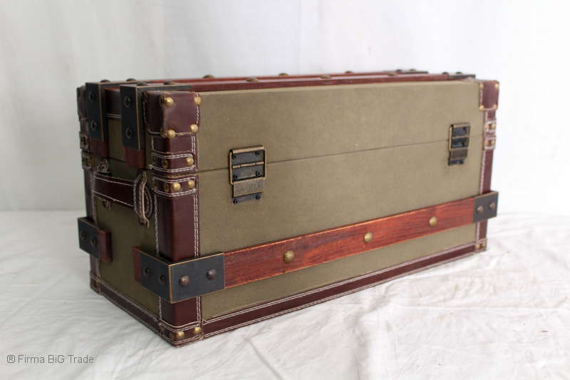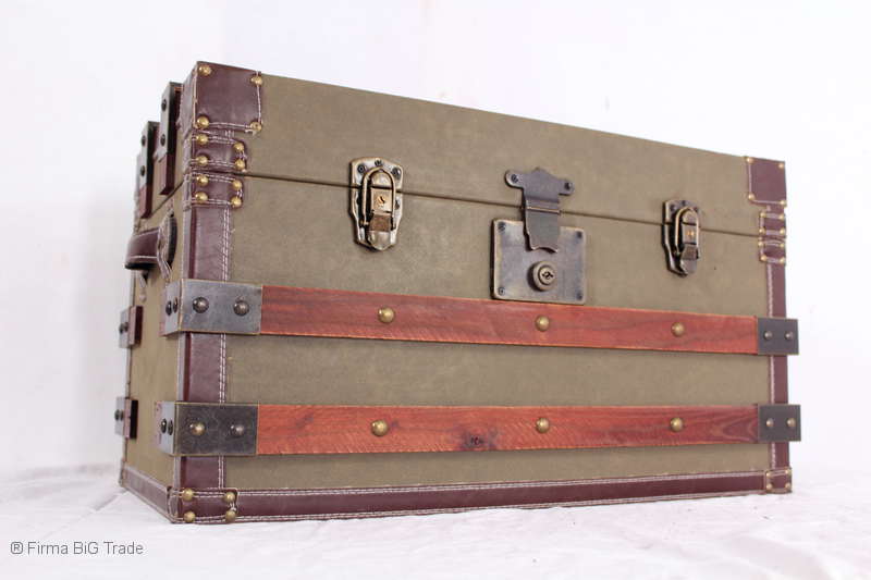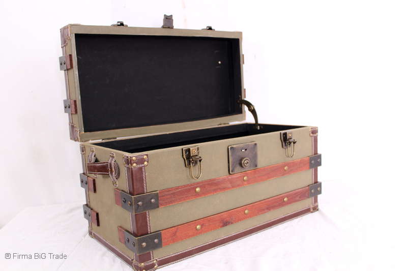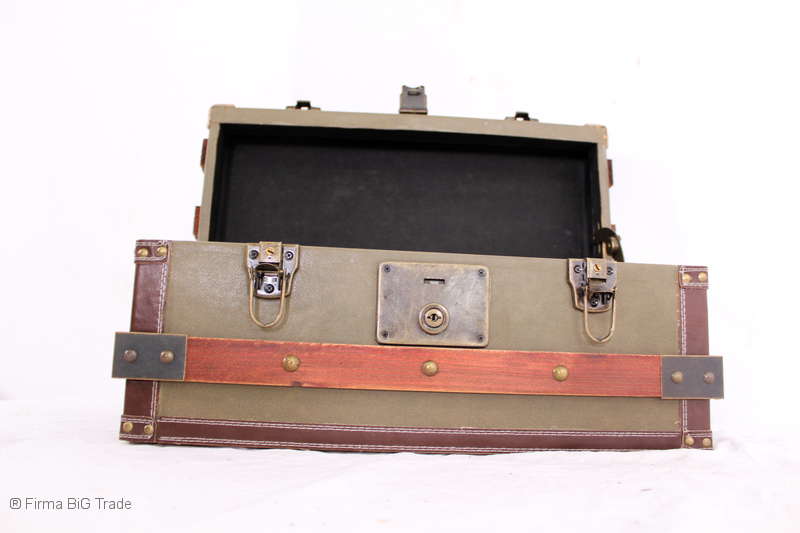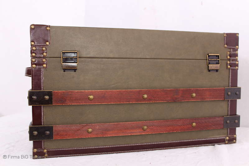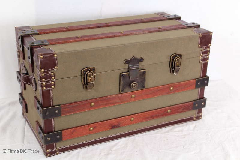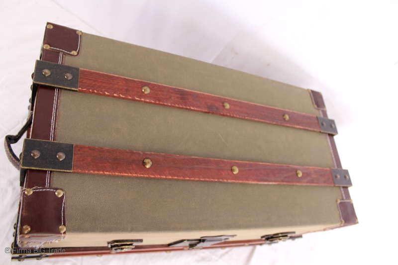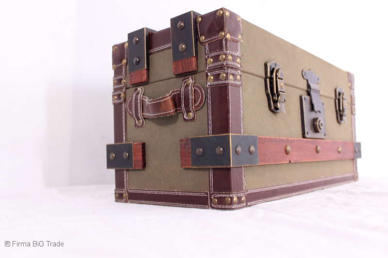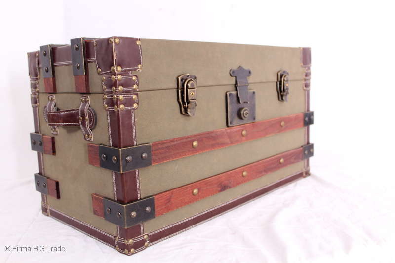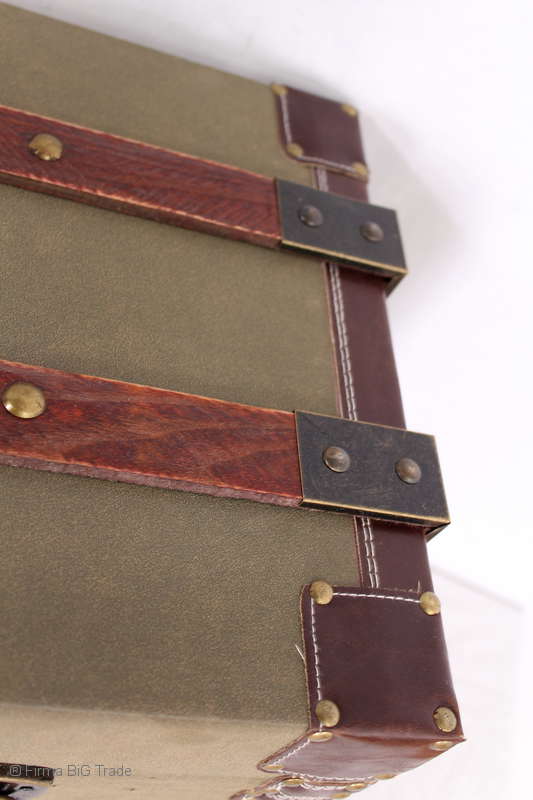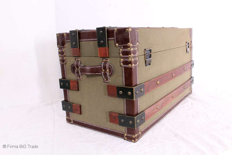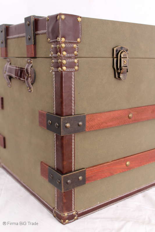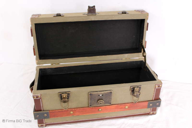 Angeboten wird ein schönes Kutscherkoffer Set bestehend aus 3 Koffer / Transportkiste / Flachdeckeltruhe / Wäschetruhe / Koffer / Tisch im antiken Stil. Die schönen Koffer besitzen zwei Klappschlösser und ein Schloss ohne Schlüssel. Der olivgrüne Koffer ist mit Holzlatten und an den Kanten mit Lederriemen und Metallkappen verstärkt. An den Seiten befinden sich Tragegriffe. Die schönen Koffer sind neu, können aber hier und da produktionsbedingte Fehler aufweisen. Die Koffer haben unterschiedliche Größen.