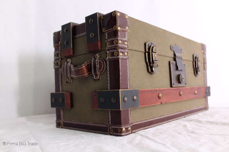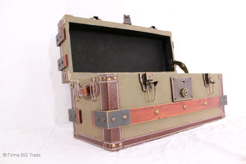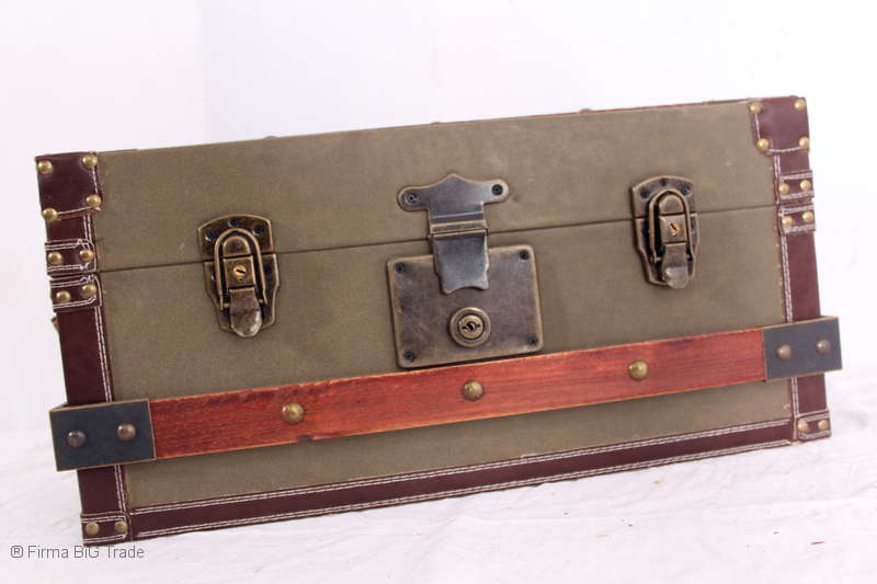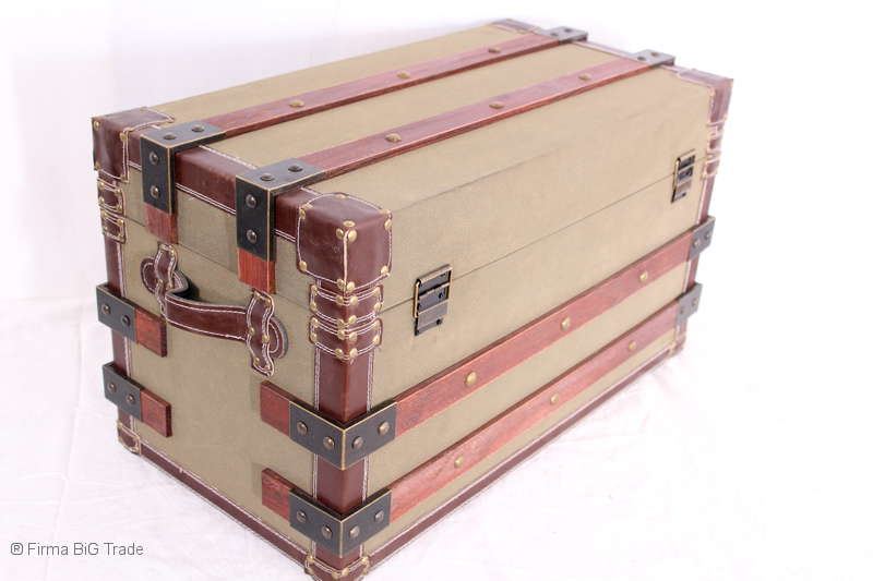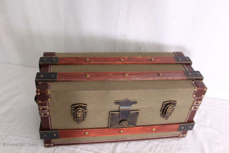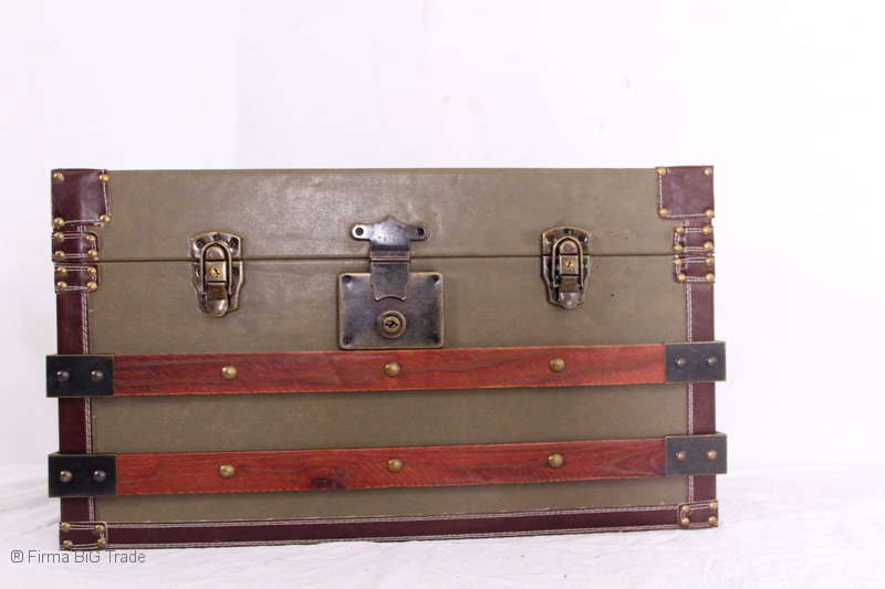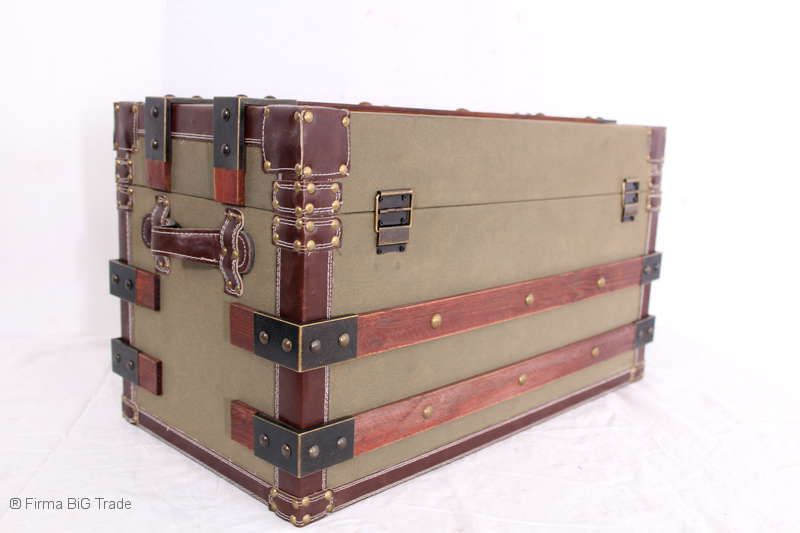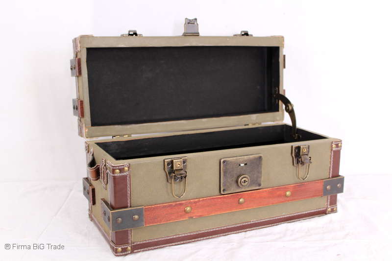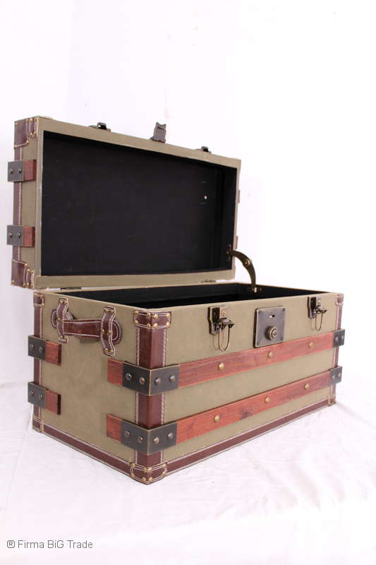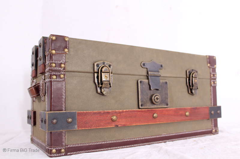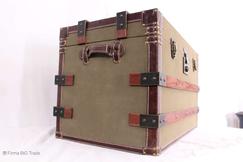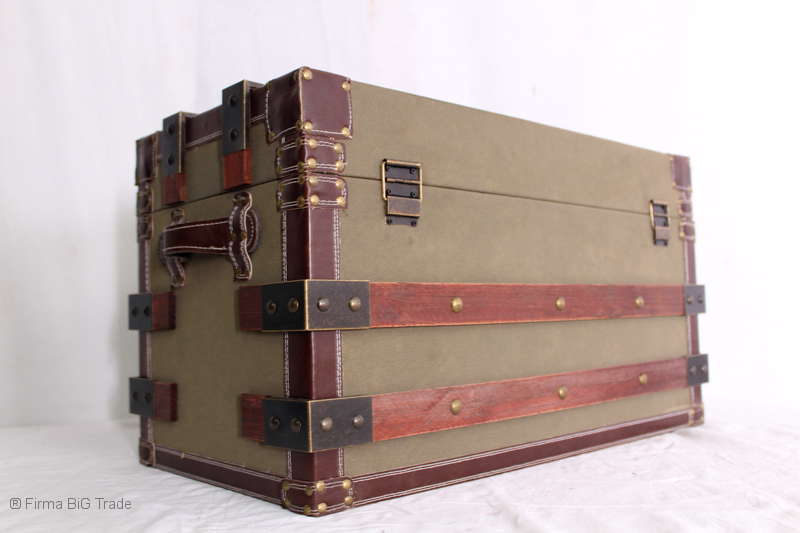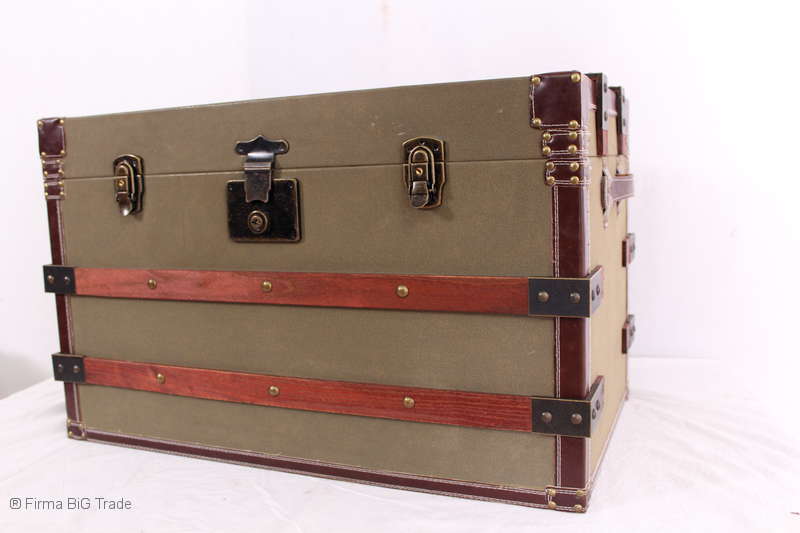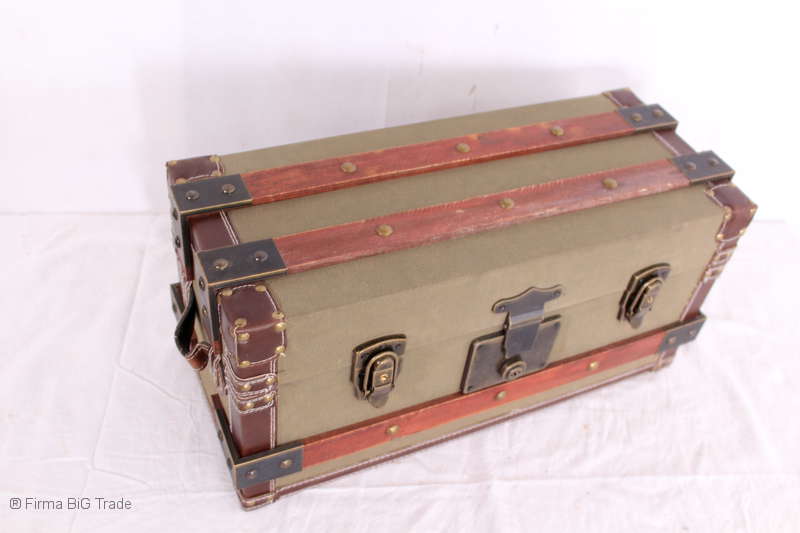 Angeboten wird ein schönes Kutscherkoffer Set bestehend aus 3 Koffer / Transportkiste / Flachdeckeltruhe / Wäschetruhe / Koffer / Tisch im antiken Stil. Die schönen Koffer besitzen zwei Klappschlösser und ein Schloss ohne Schlüssel. Der olivgrüne Koffer ist mit Holzlatten und an den Kanten mit Lederriemen und Metallkappen verstärkt. An den Seiten befinden sich Tragegriffe. Die schönen Koffer sind neu, können aber hier und da produktionsbedingte Fehler aufweisen. Die Koffer haben unterschiedliche Größen.