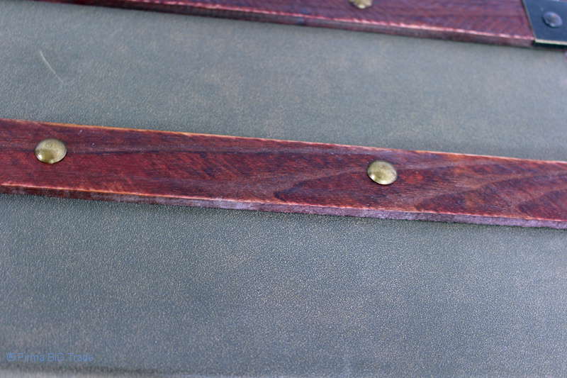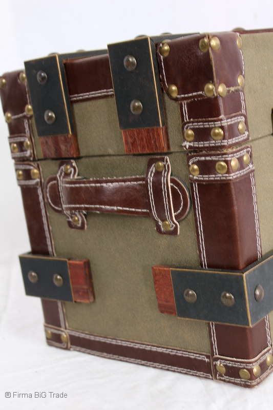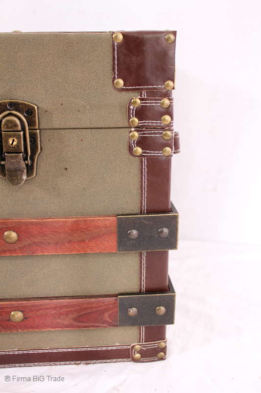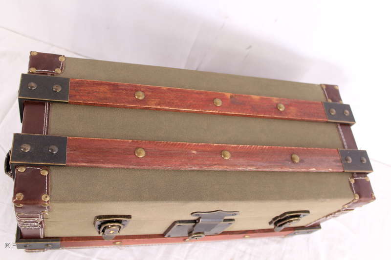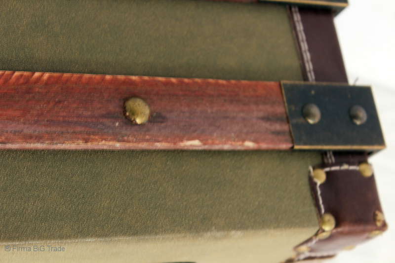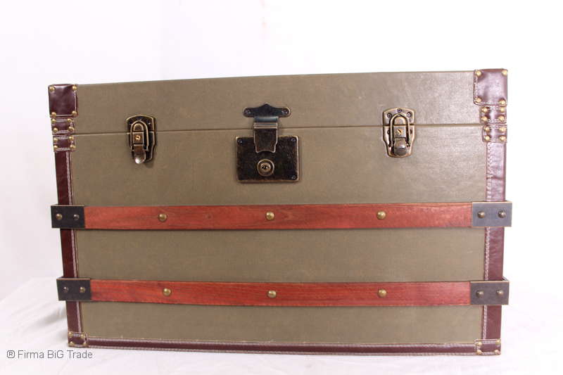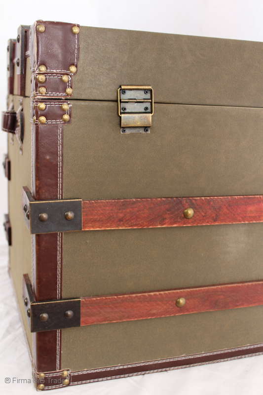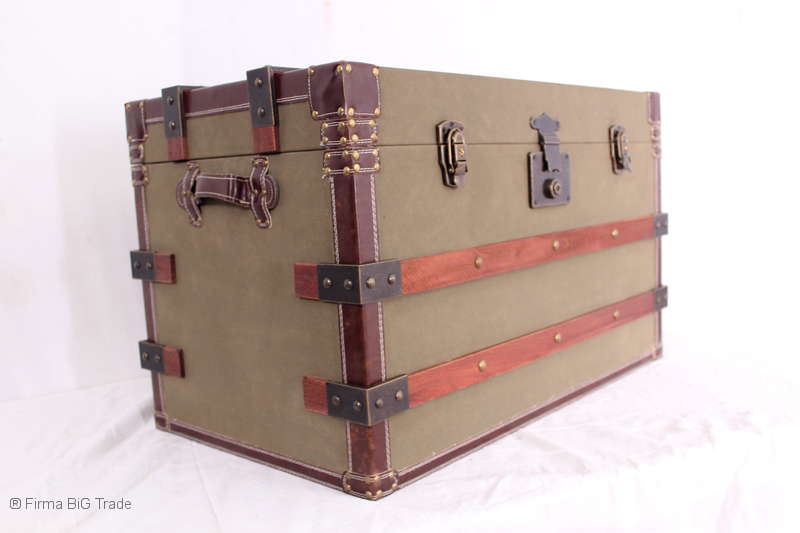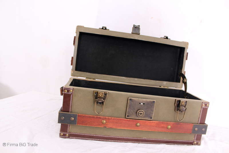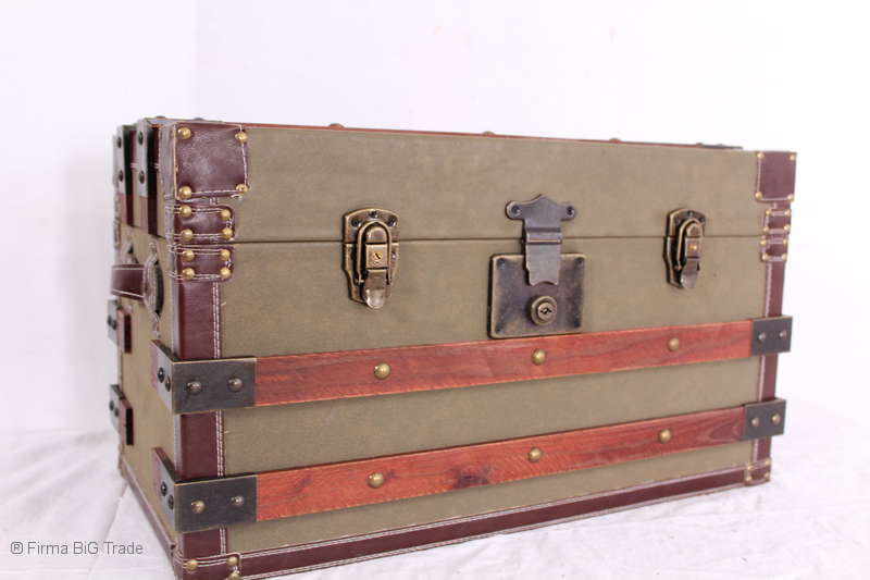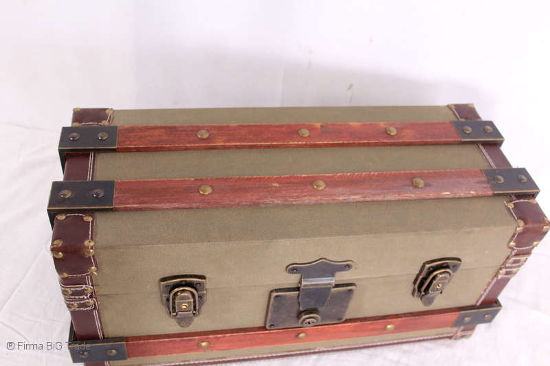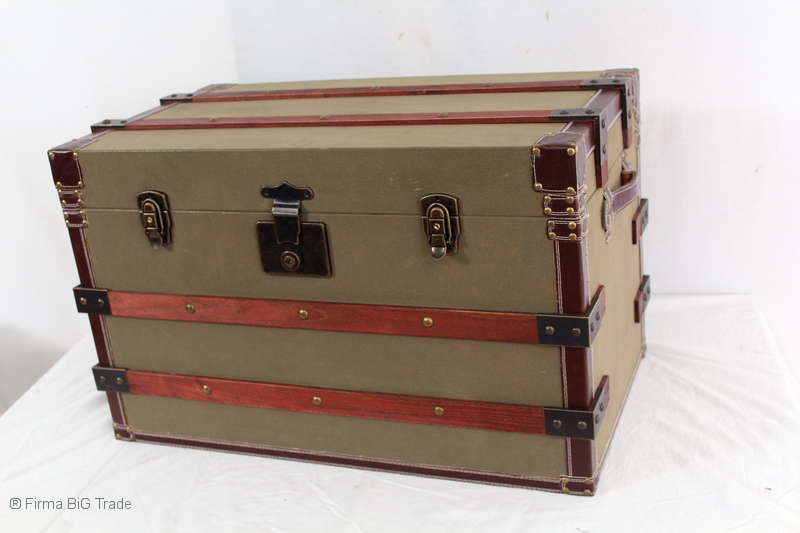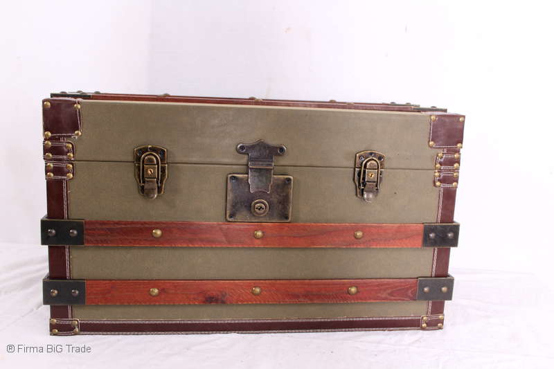 Angeboten wird ein schönes Kutscherkoffer Set bestehend aus 3 Koffer / Transportkiste / Flachdeckeltruhe / Wäschetruhe / Koffer / Tisch im antiken Stil. Die schönen Koffer besitzen zwei Klappschlösser und ein Schloss ohne Schlüssel. Der olivgrüne Koffer ist mit Holzlatten und an den Kanten mit Lederriemen und Metallkappen verstärkt. An den Seiten befinden sich Tragegriffe. Die schönen Koffer sind neu, können aber hier und da produktionsbedingte Fehler aufweisen. Die Koffer haben unterschiedliche Größen.