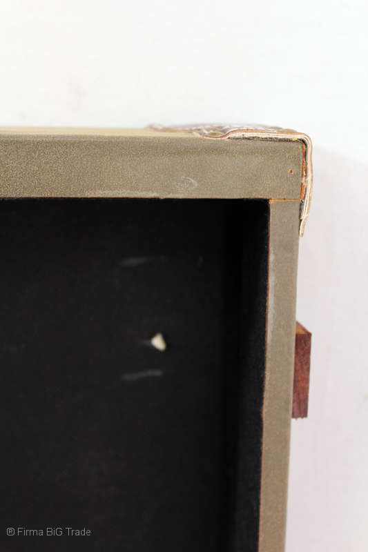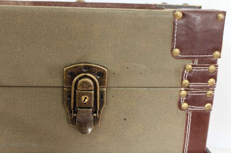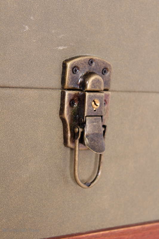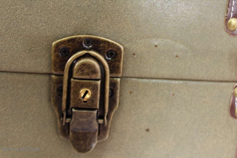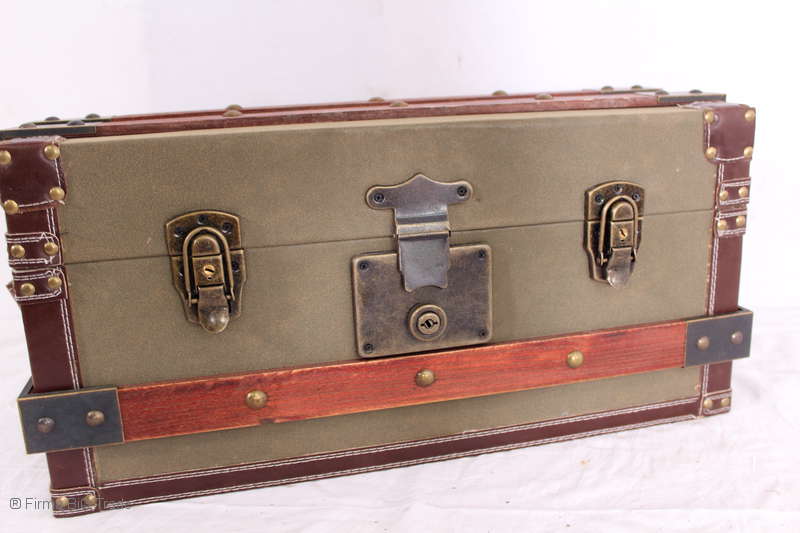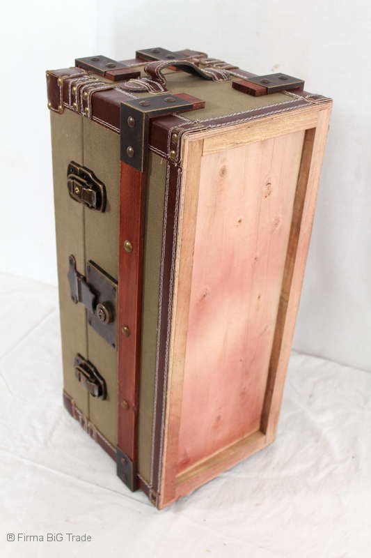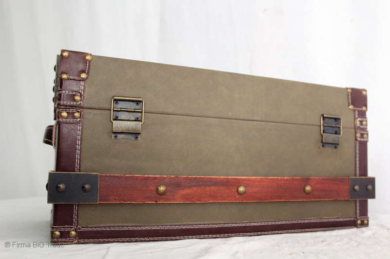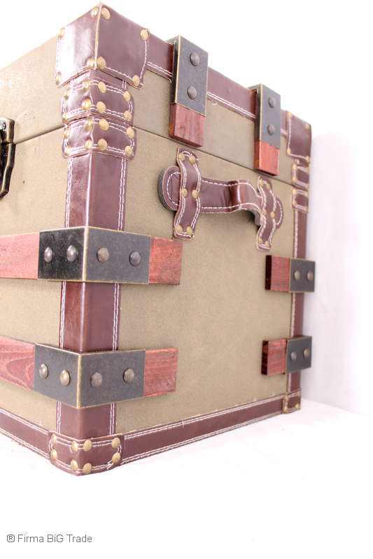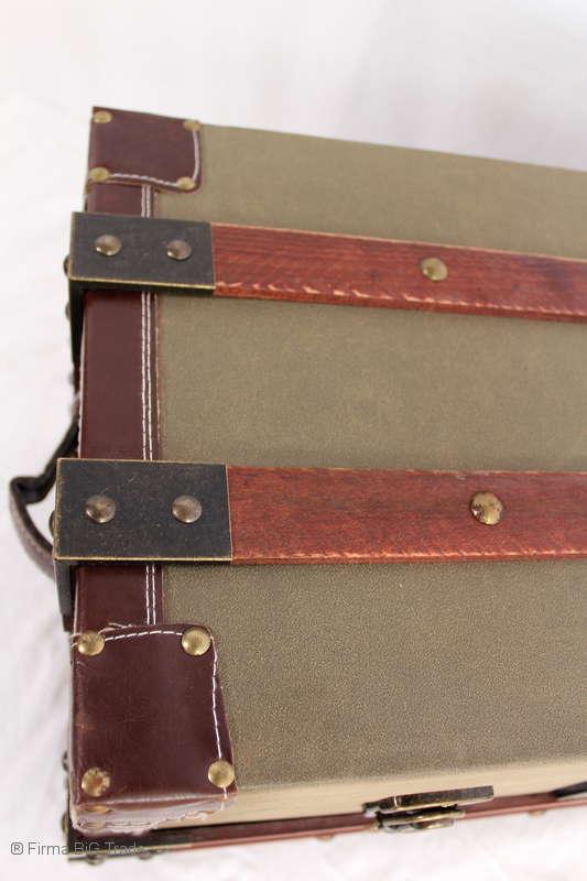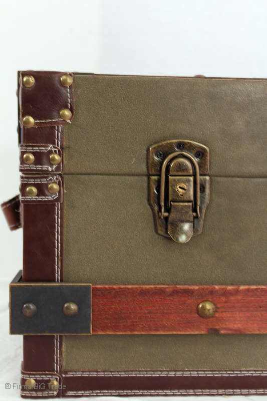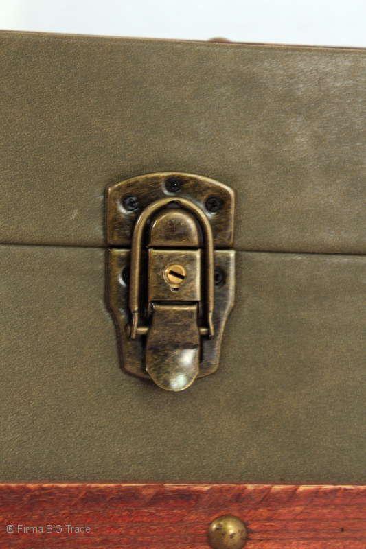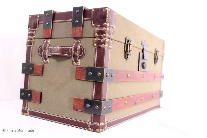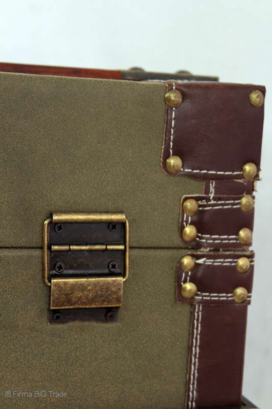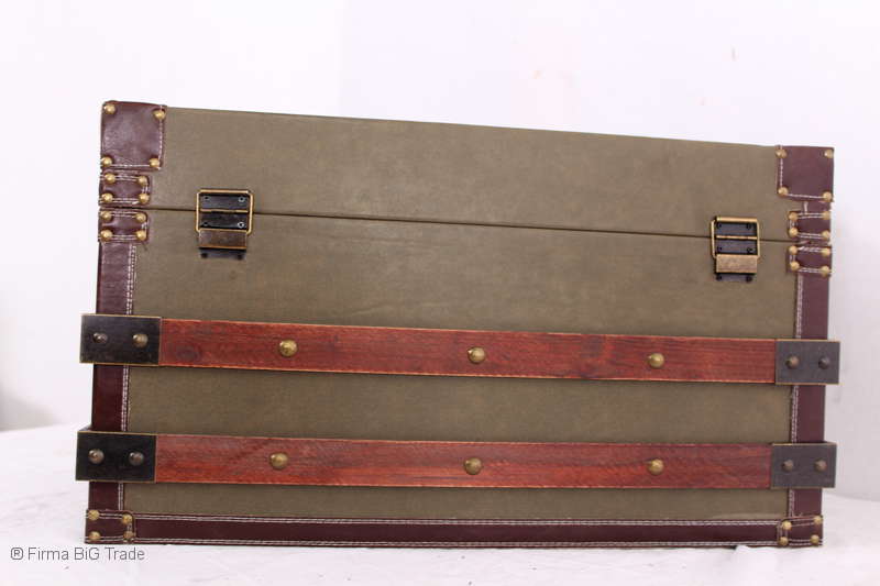 Angeboten wird ein schönes Kutscherkoffer Set bestehend aus 3 Koffer / Transportkiste / Flachdeckeltruhe / Wäschetruhe / Koffer / Tisch im antiken Stil. Die schönen Koffer besitzen zwei Klappschlösser und ein Schloss ohne Schlüssel. Der olivgrüne Koffer ist mit Holzlatten und an den Kanten mit Lederriemen und Metallkappen verstärkt. An den Seiten befinden sich Tragegriffe. Die schönen Koffer sind neu, können aber hier und da produktionsbedingte Fehler aufweisen. Die Koffer haben unterschiedliche Größen.