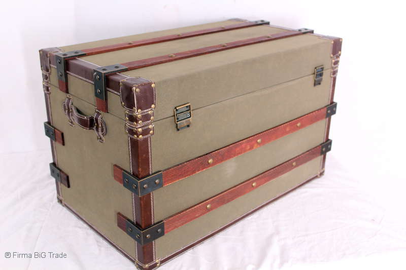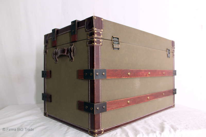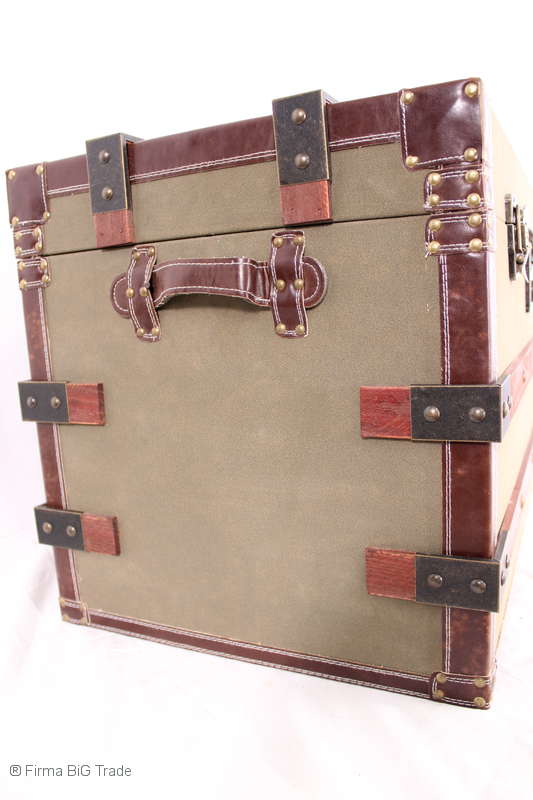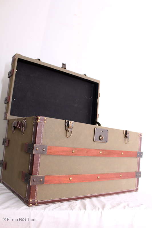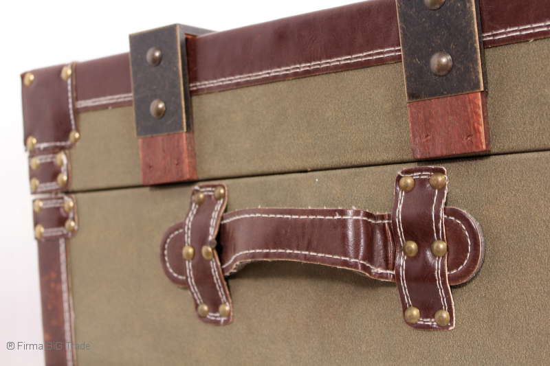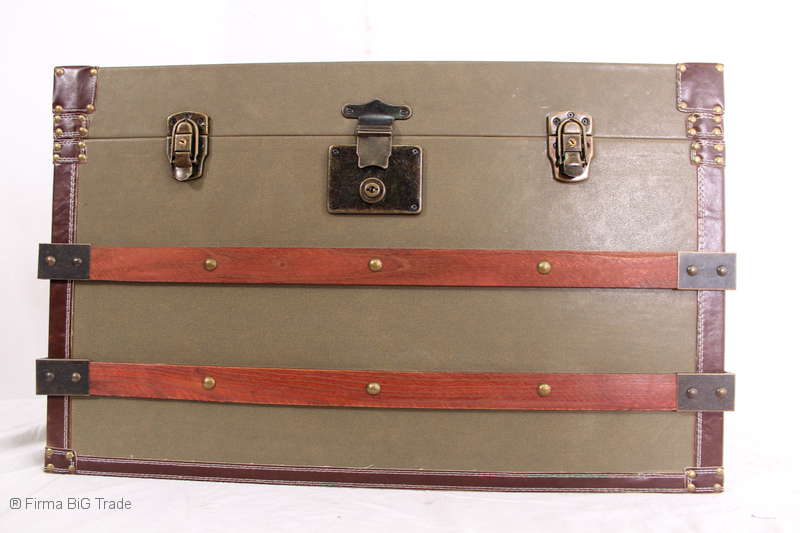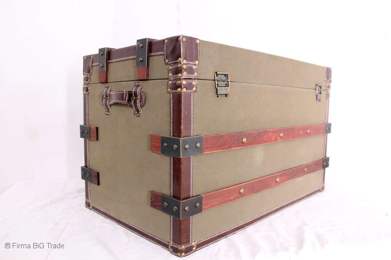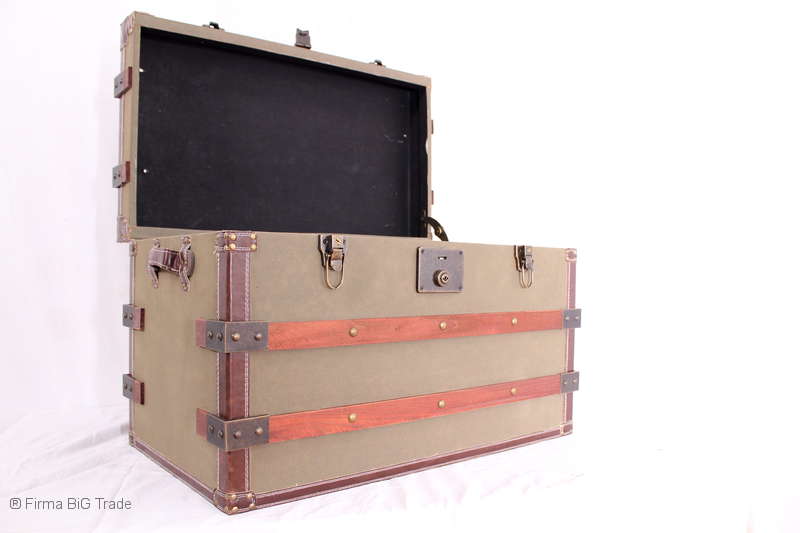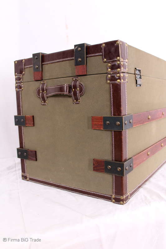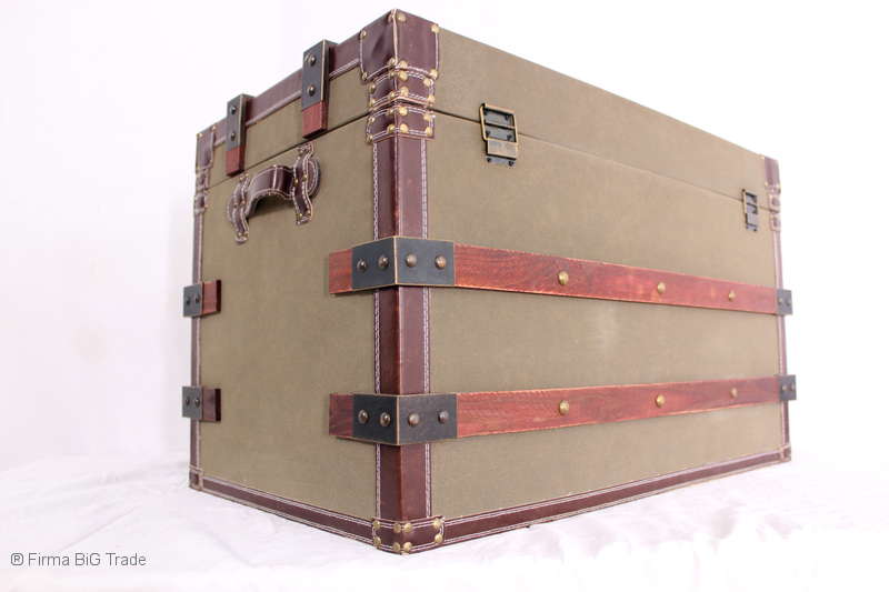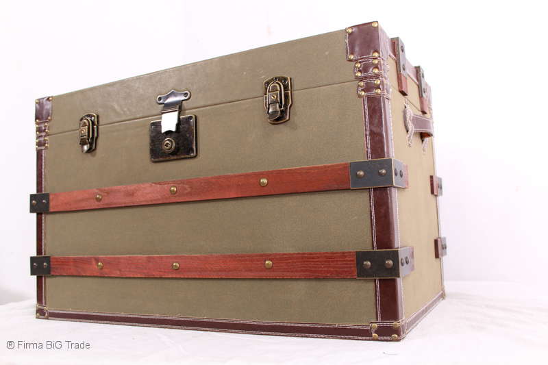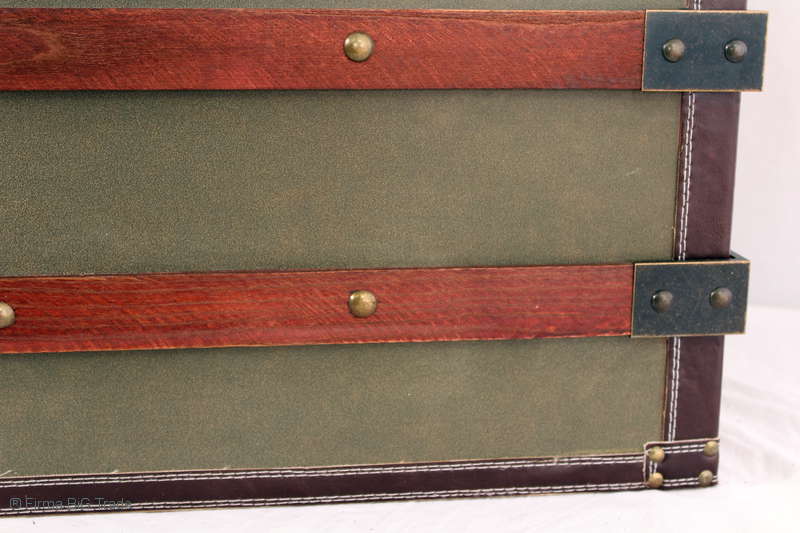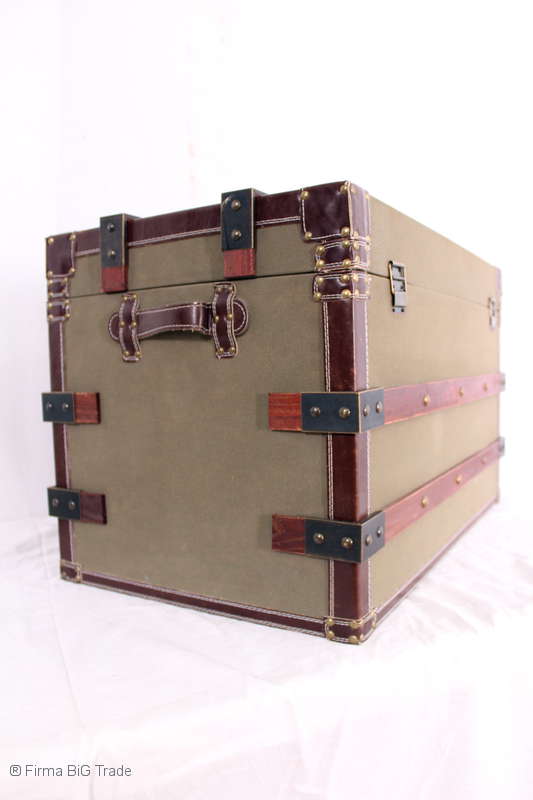 Angeboten wird ein schöner Kutscherkoffer / Transportkiste / Flachdeckeltruhe / Wäschetruhe / Koffer / Tisch im antiken Stil. Der schöne Koffer besitzt zwei Klappschlösser und ein Schloss ohne Schlüssel. Der olivgrüne Koffer ist mit Holzlatten und an den Kanten mit Lederriemen und Metallkappen verstärkt. An den Seiten befinden sich Tragegriffe. Der schöne Koffer ist neu, kann aber hier und da produktionsbedingte Fehler aufweisen. Wir bieten den Koffer in 3 Größen an.