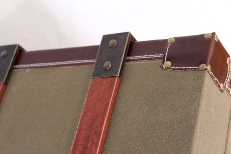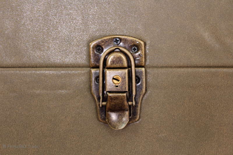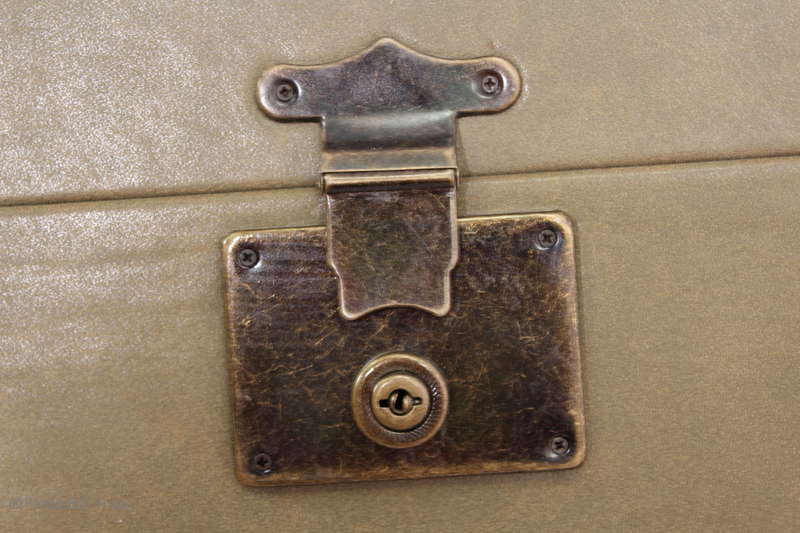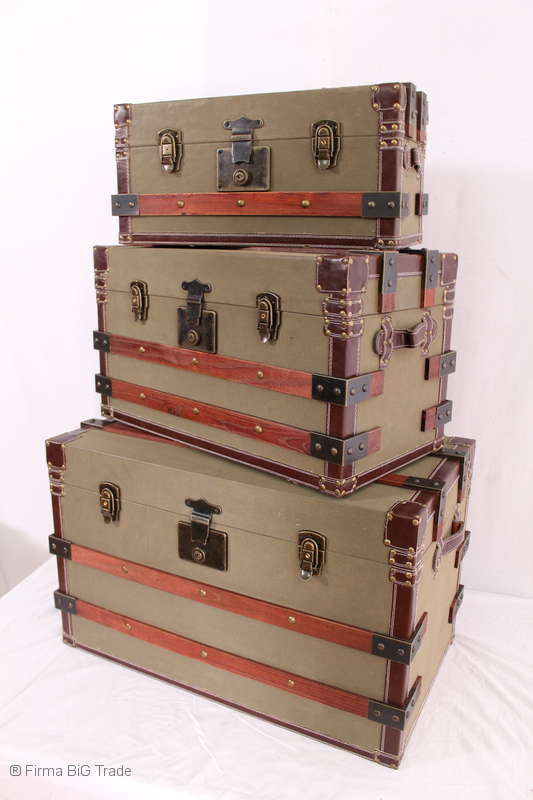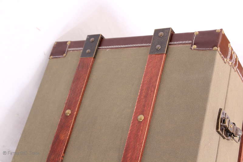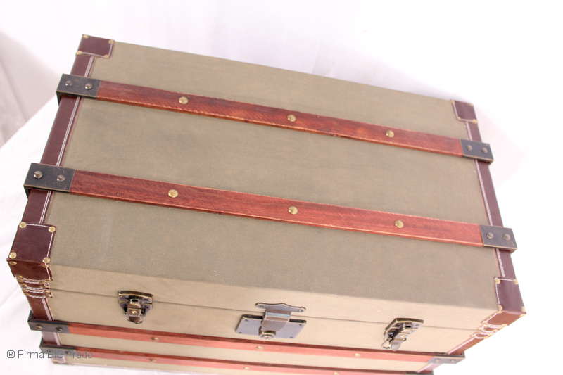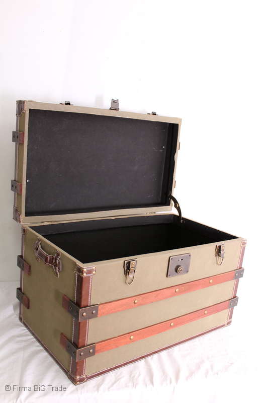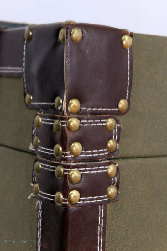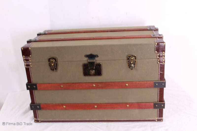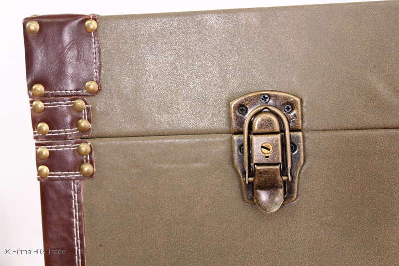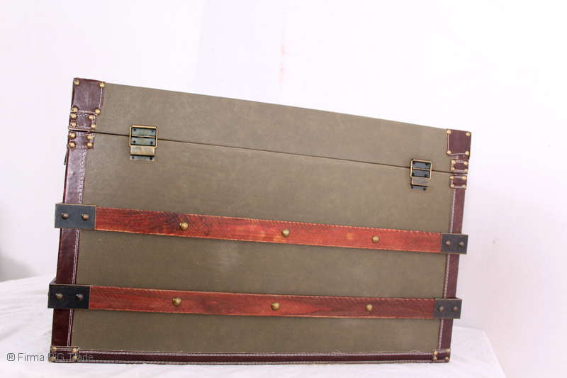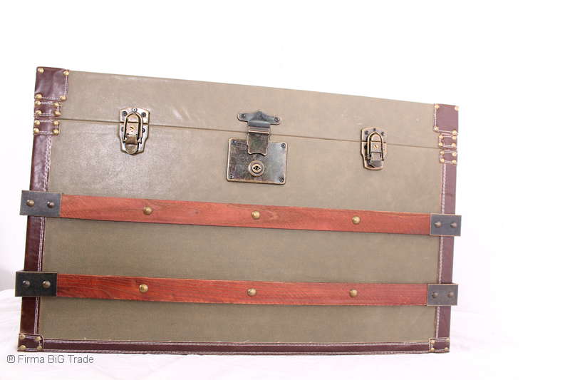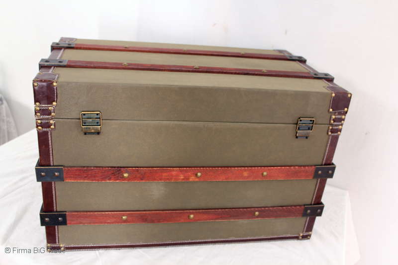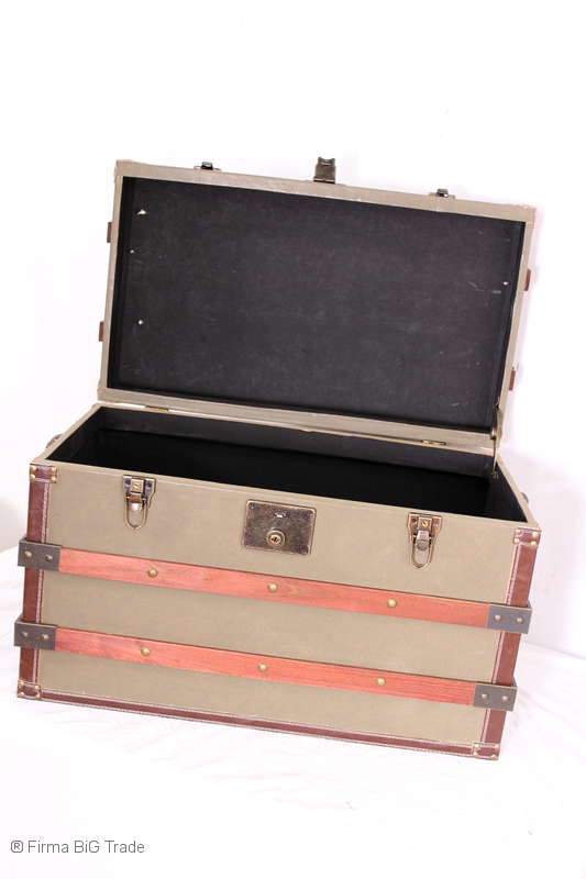 Angeboten wird ein schöner Kutscherkoffer / Transportkiste / Flachdeckeltruhe / Wäschetruhe / Koffer / Tisch im antiken Stil. Der schöne Koffer besitzt zwei Klappschlösser und ein Schloss ohne Schlüssel. Der olivgrüne Koffer ist mit Holzlatten und an den Kanten mit Lederriemen und Metallkappen verstärkt. An den Seiten befinden sich Tragegriffe. Der schöne Koffer ist neu, kann aber hier und da produktionsbedingte Fehler aufweisen. Wir bieten den Koffer in 3 Größen an.