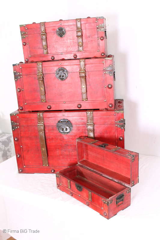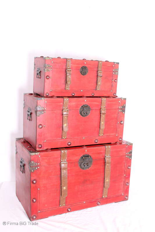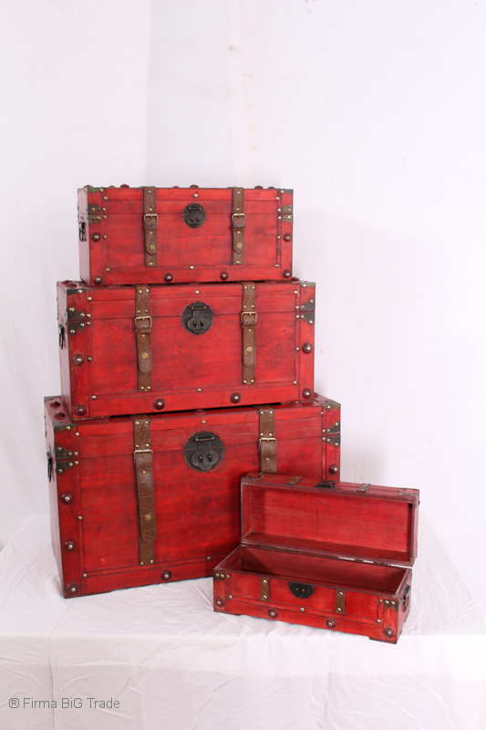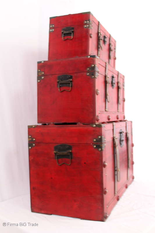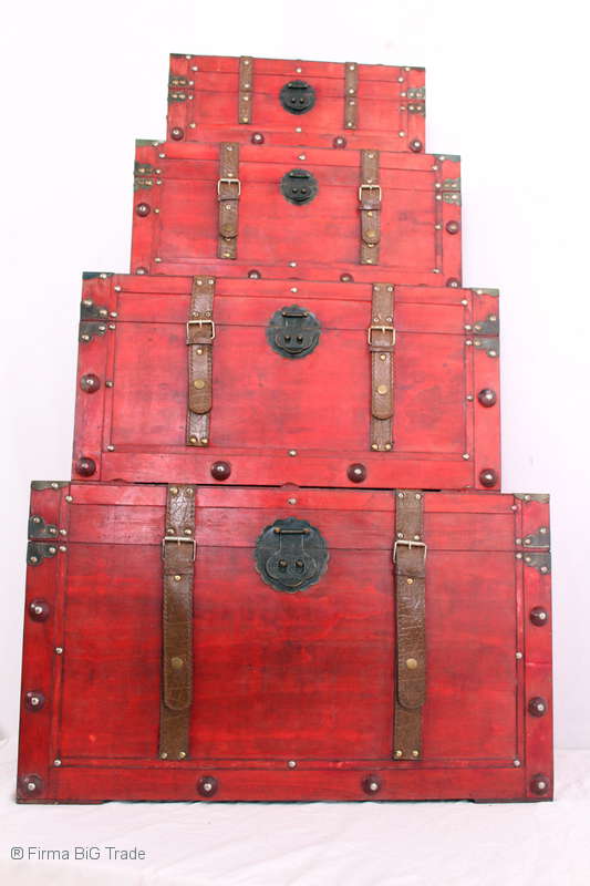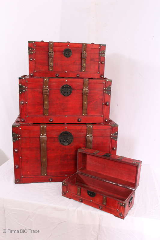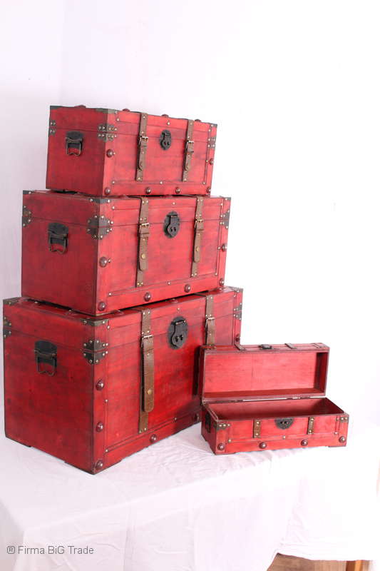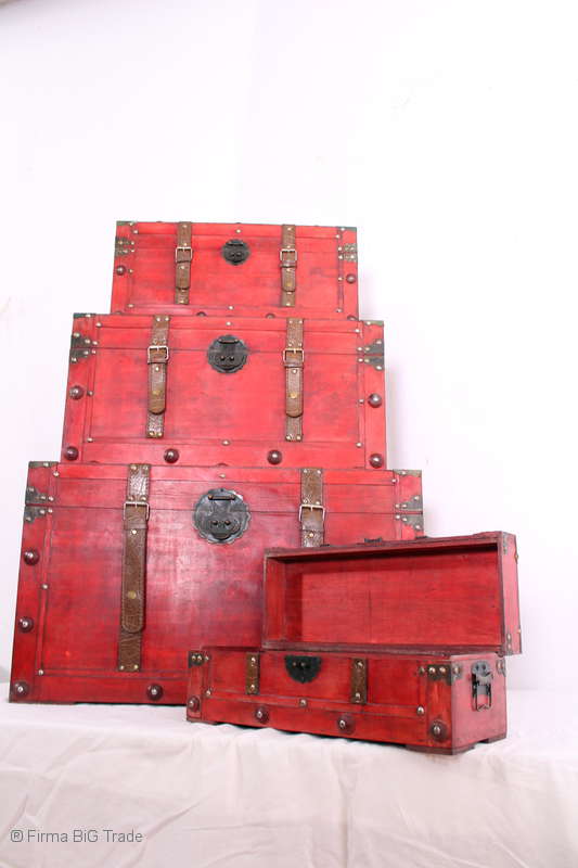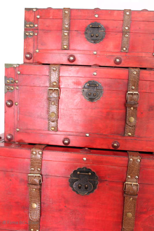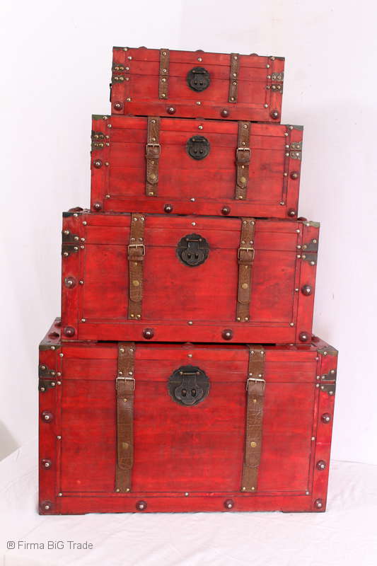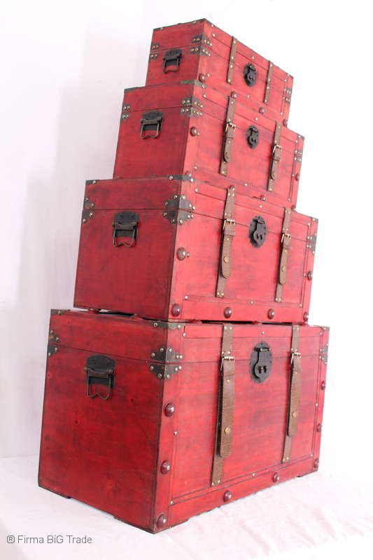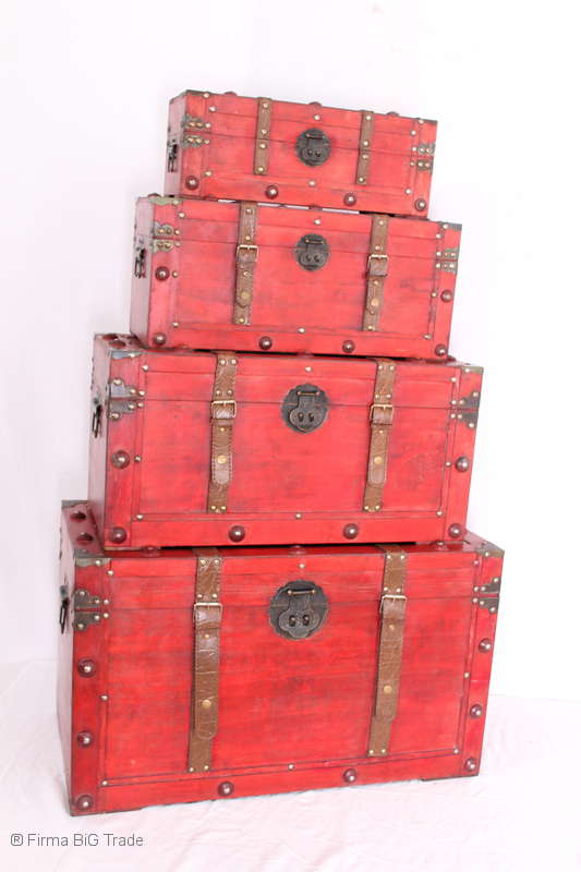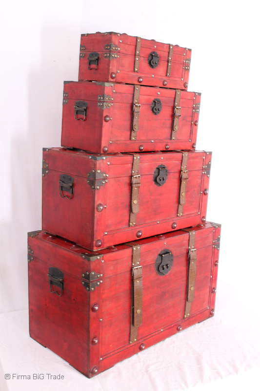 Angeboten wird ein schönes Flachdeckeltruhen Set bestehend aus 4 Truhen / Kutschertruhe / Holztruhe / Hochzeitstruhe / Holzkiste / Wäschetruhe / Tisch im antiken Stil. Die roten Holztruhen sind kontrastreich mit Lederriemen, Metallbeschlägen und Metallnägeln verziert. An den Seiten befinden sich zwei Metalltragegriffe und auf der Vorderseite ein Klappschloss zum Verschließen. Die Flachdeckeltruhen sind neu, können aber hier und da produktionsbedingte Fehler aufweisen. Die Holztruhen haben vier unterschiedliche Größen.