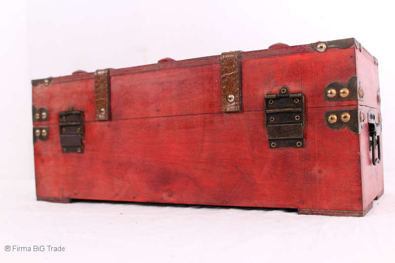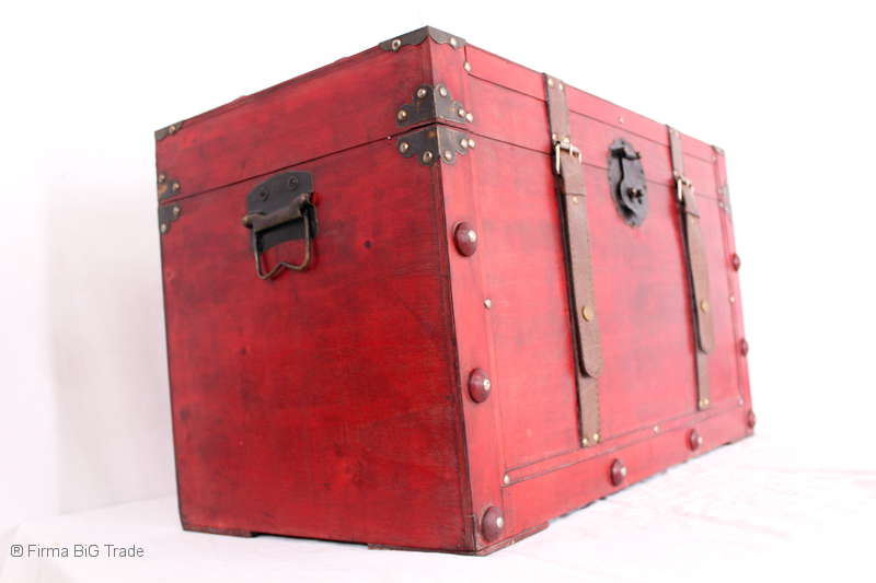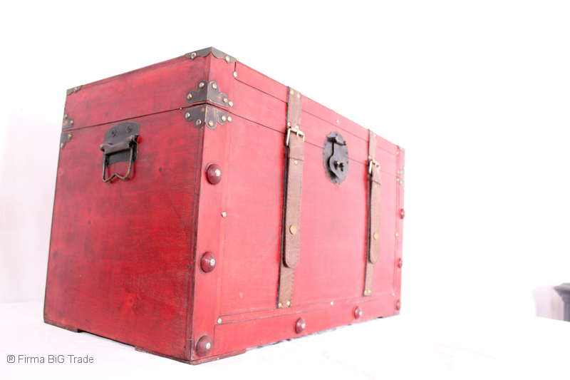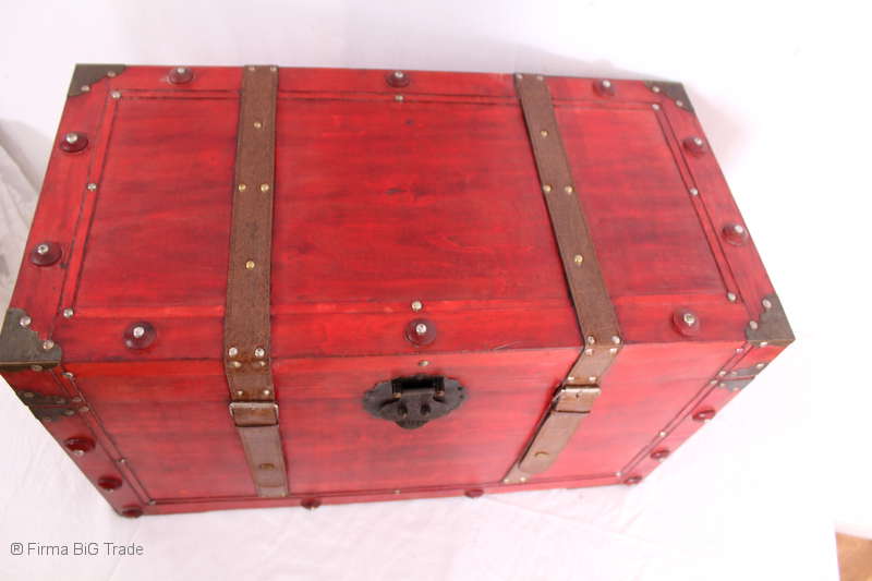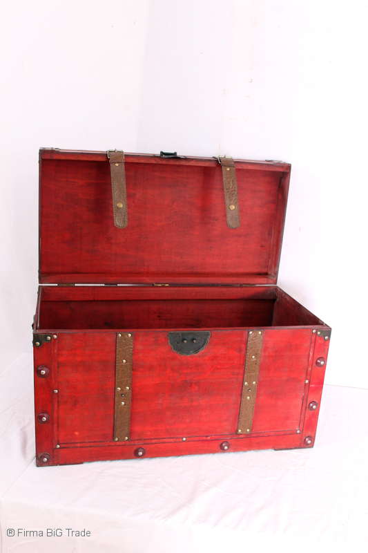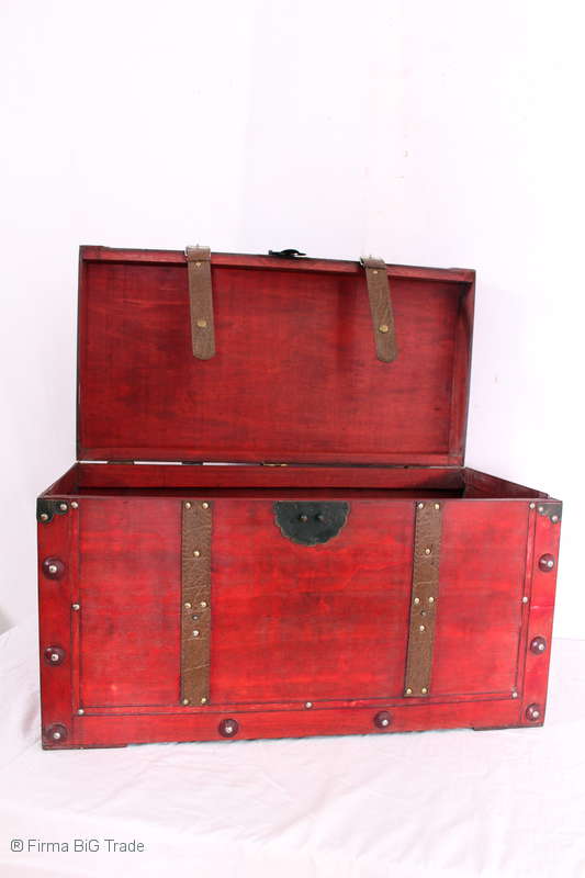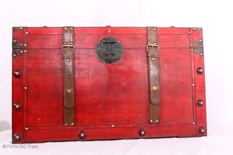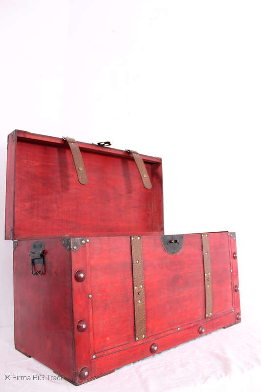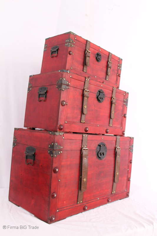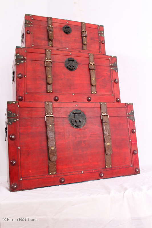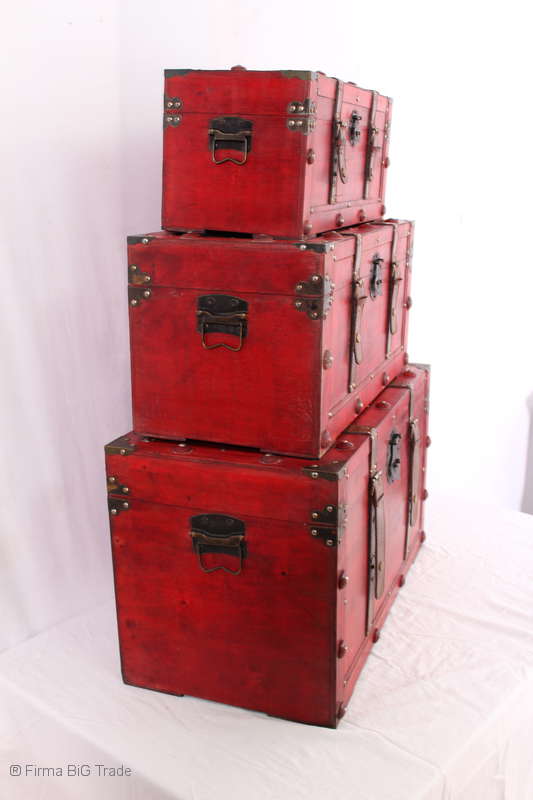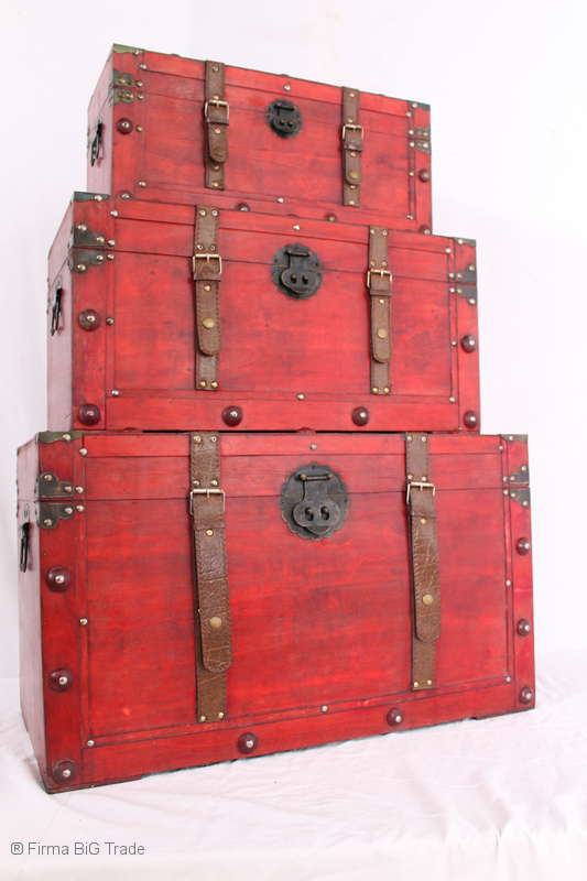 Angeboten wird ein schönes Flachdeckeltruhen Set bestehend aus 4 Truhen / Kutschertruhe / Holztruhe / Hochzeitstruhe / Holzkiste / Wäschetruhe / Tisch im antiken Stil. Die roten Holztruhen sind kontrastreich mit Lederriemen, Metallbeschlägen und Metallnägeln verziert. An den Seiten befinden sich zwei Metalltragegriffe und auf der Vorderseite ein Klappschloss zum Verschließen. Die Flachdeckeltruhen sind neu, können aber hier und da produktionsbedingte Fehler aufweisen. Die Holztruhen haben vier unterschiedliche Größen.