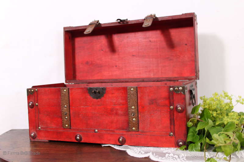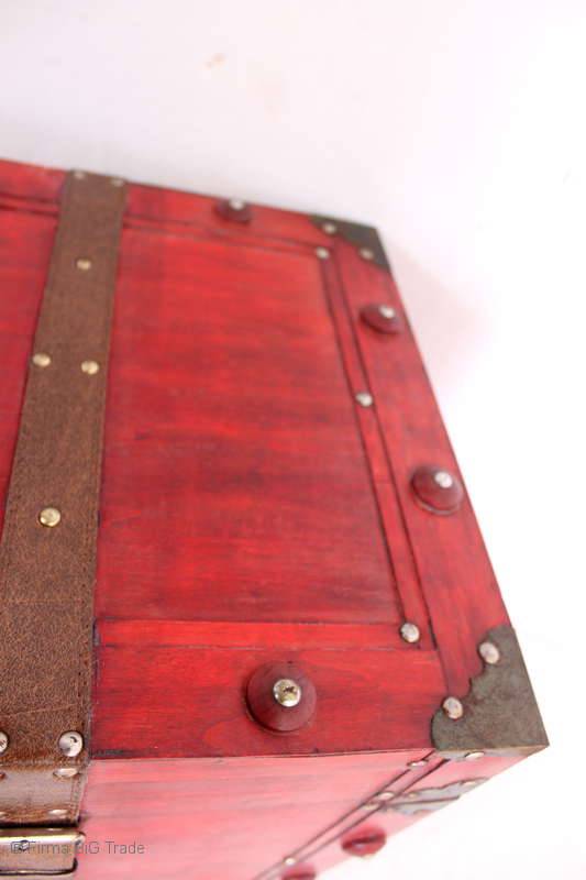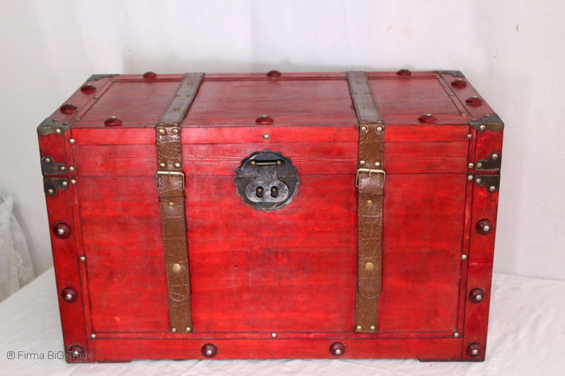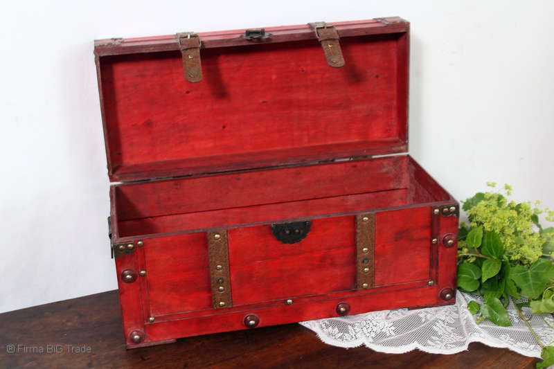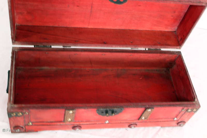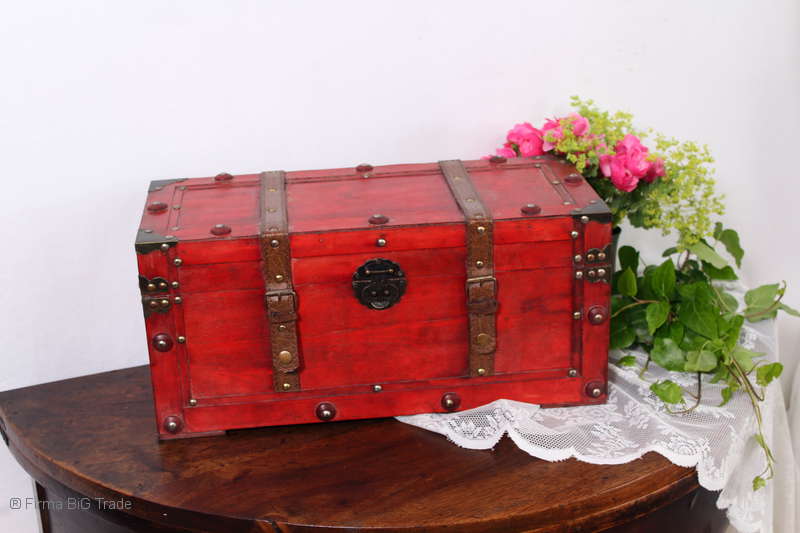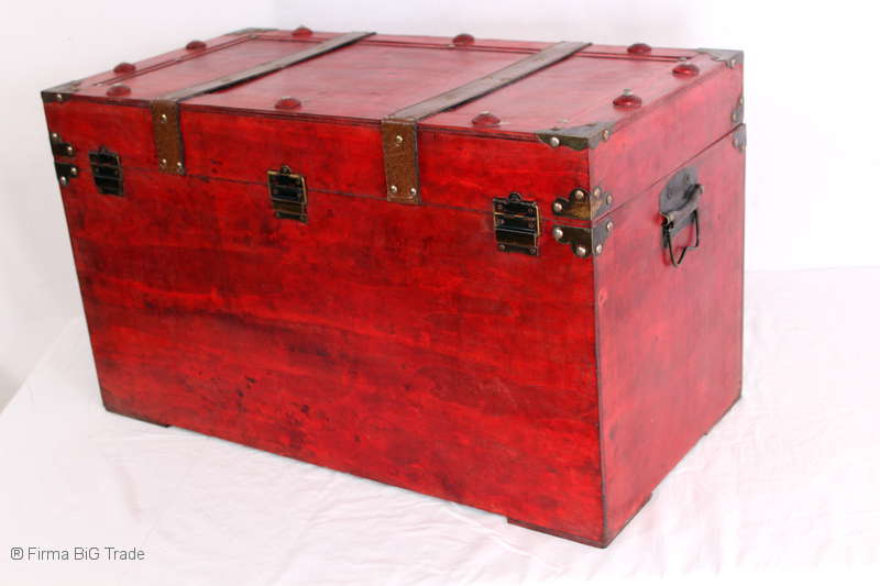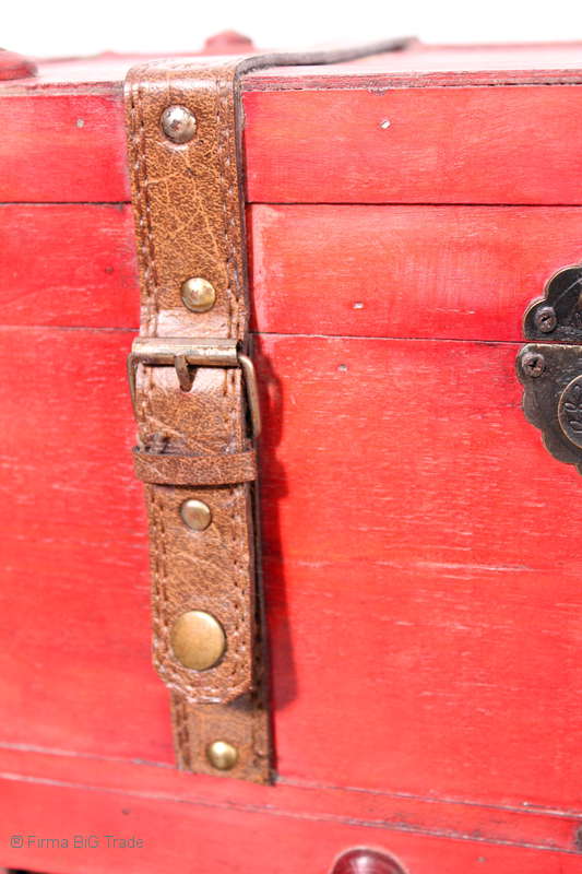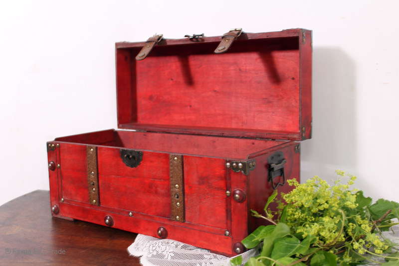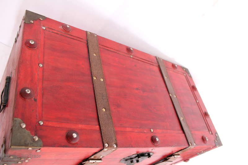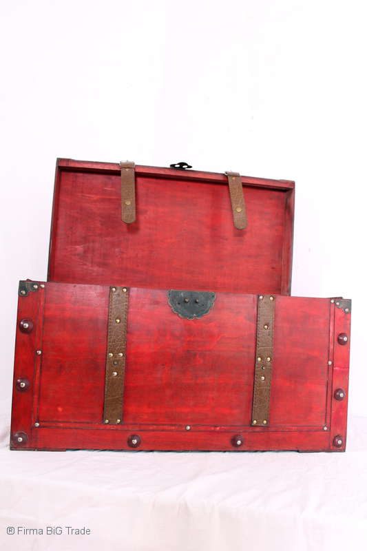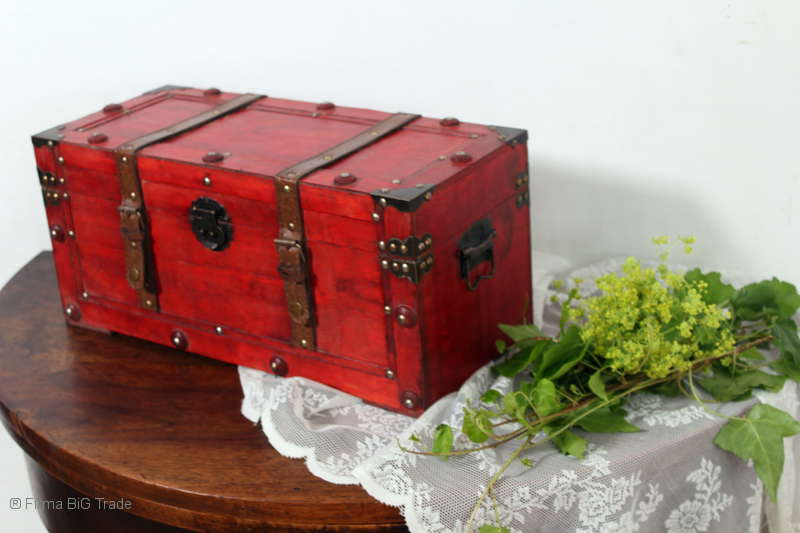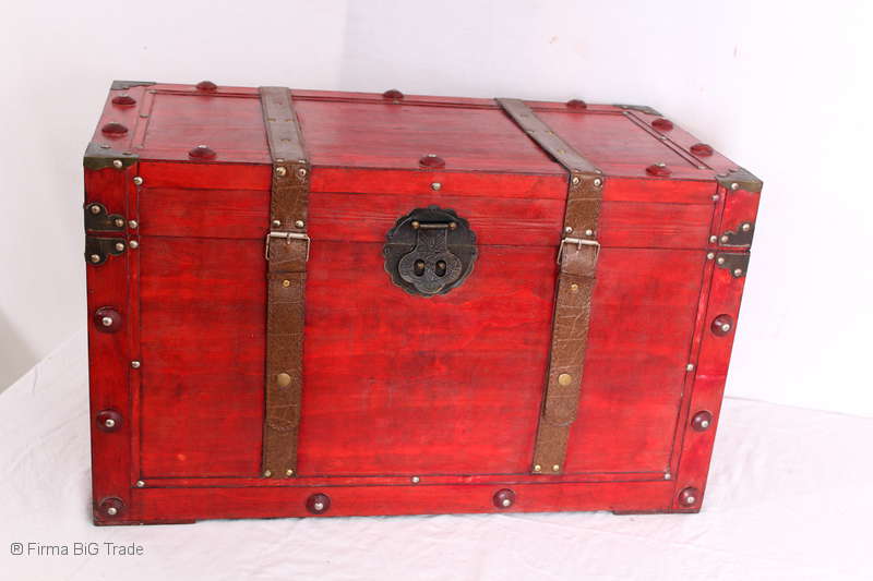 Angeboten wird ein schönes Flachdeckeltruhen Set bestehend aus 4 Truhen / Kutschertruhe / Holztruhe / Hochzeitstruhe / Holzkiste / Wäschetruhe / Tisch im antiken Stil. Die roten Holztruhen sind kontrastreich mit Lederriemen, Metallbeschlägen und Metallnägeln verziert. An den Seiten befinden sich zwei Metalltragegriffe und auf der Vorderseite ein Klappschloss zum Verschließen. Die Flachdeckeltruhen sind neu, können aber hier und da produktionsbedingte Fehler aufweisen. Die Holztruhen haben vier unterschiedliche Größen.